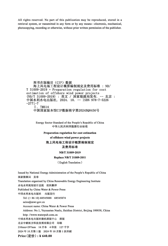 本译本是根据中国水利水电出版社出版的《海上风电场工程设计概算编制规定及费用标准》NBT 31009—2019 翻译的,著作权归国家能源局所有。在使用过程中,如出现异议,以中文版为准。