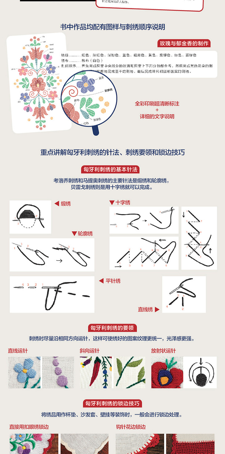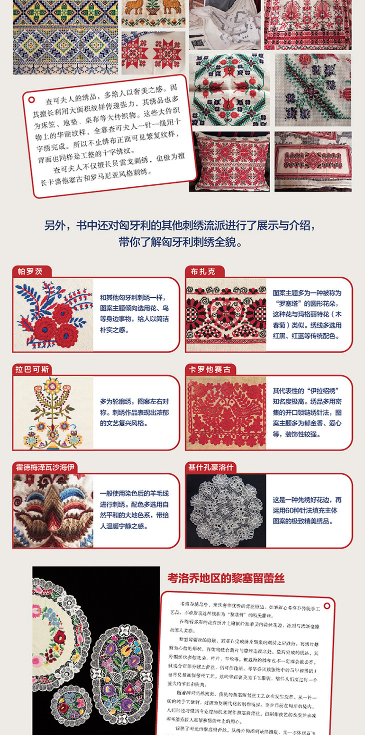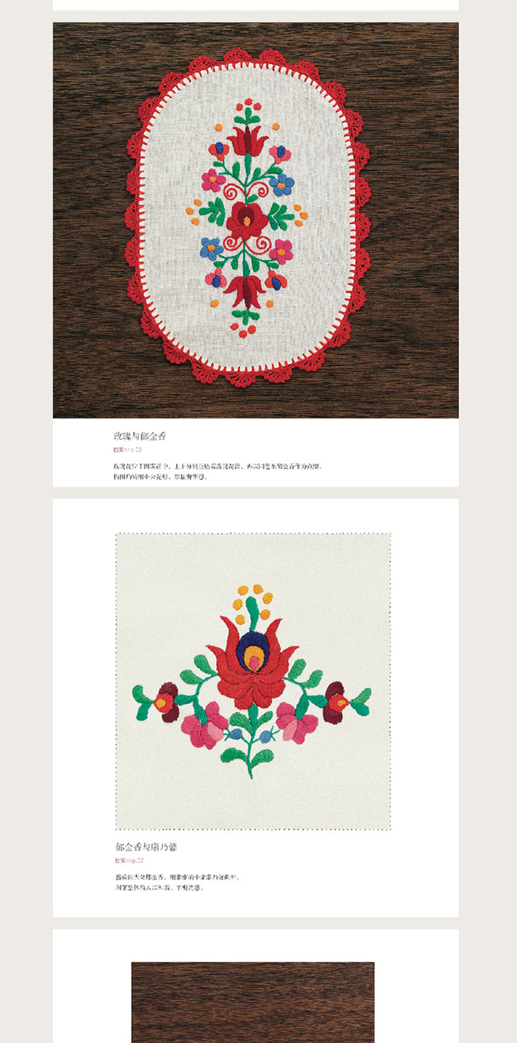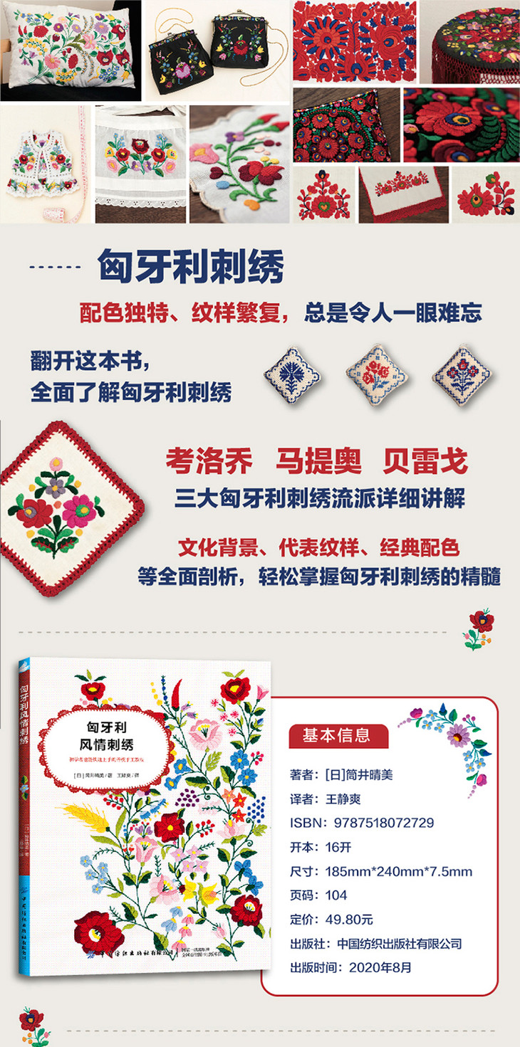 本书以极具特色的匈牙利刺绣为主题,以考洛乔刺绣、马提奥刺绣和贝雷戈刺绣为主线,不但介绍各刺绣流派的代表性图案、针法和配色等,还介绍了各刺绣流派发源地的文化背景。此外,作者还介绍了匈牙利境内的其他富有特色的刺绣流派,是一本集刺绣知识和文化知识于一体的手工图书。