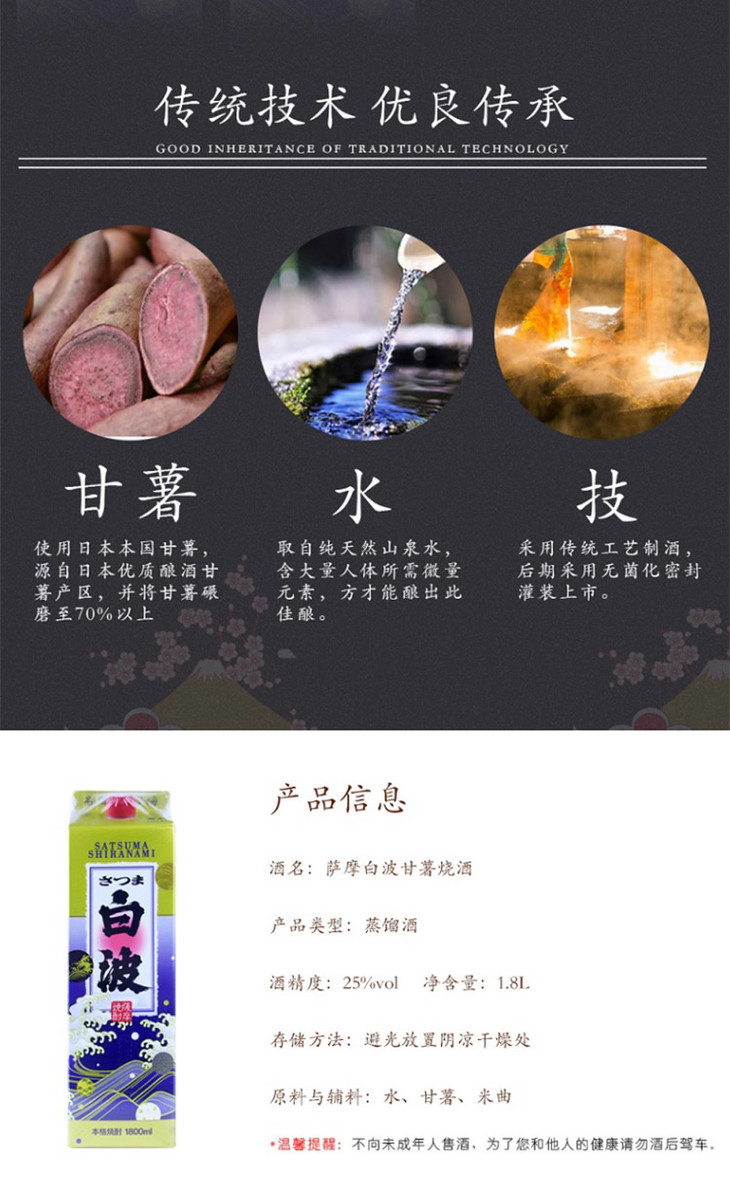 日本进口烧酒萨摩白波甘薯烧酒 蒸馏酒1.8升纸盒装 单盒