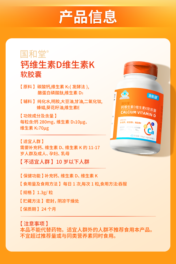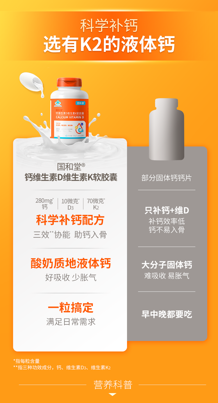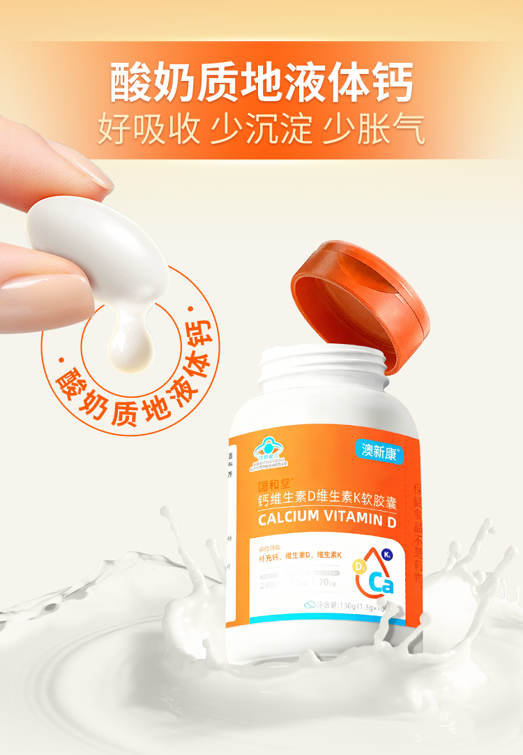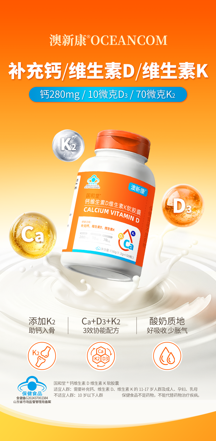 ⁵【蓝帽子钙+VD+K液体钙 】每粒含钙280mg+维生素D3-400IU+ K2 100粒/瓶 YY05-QTT-AXK