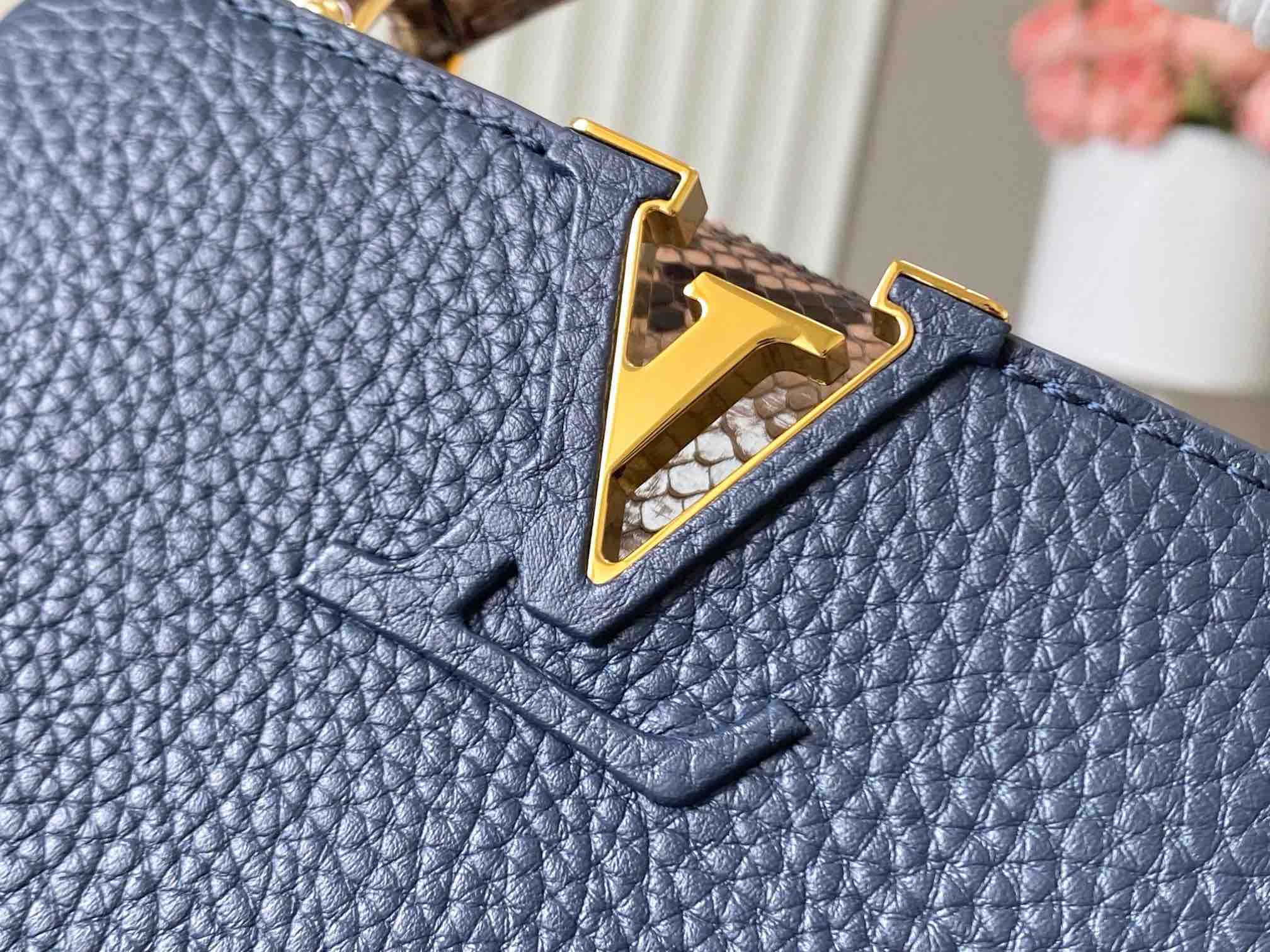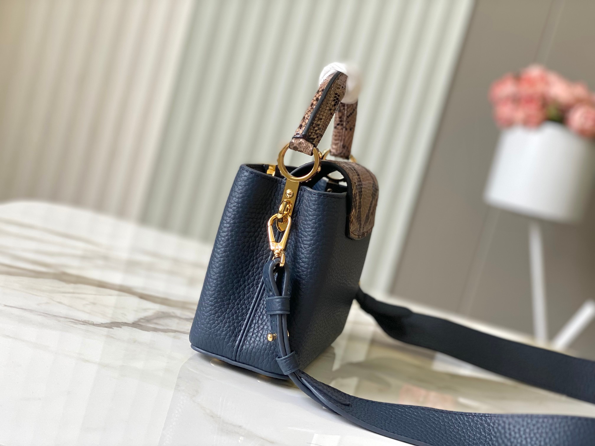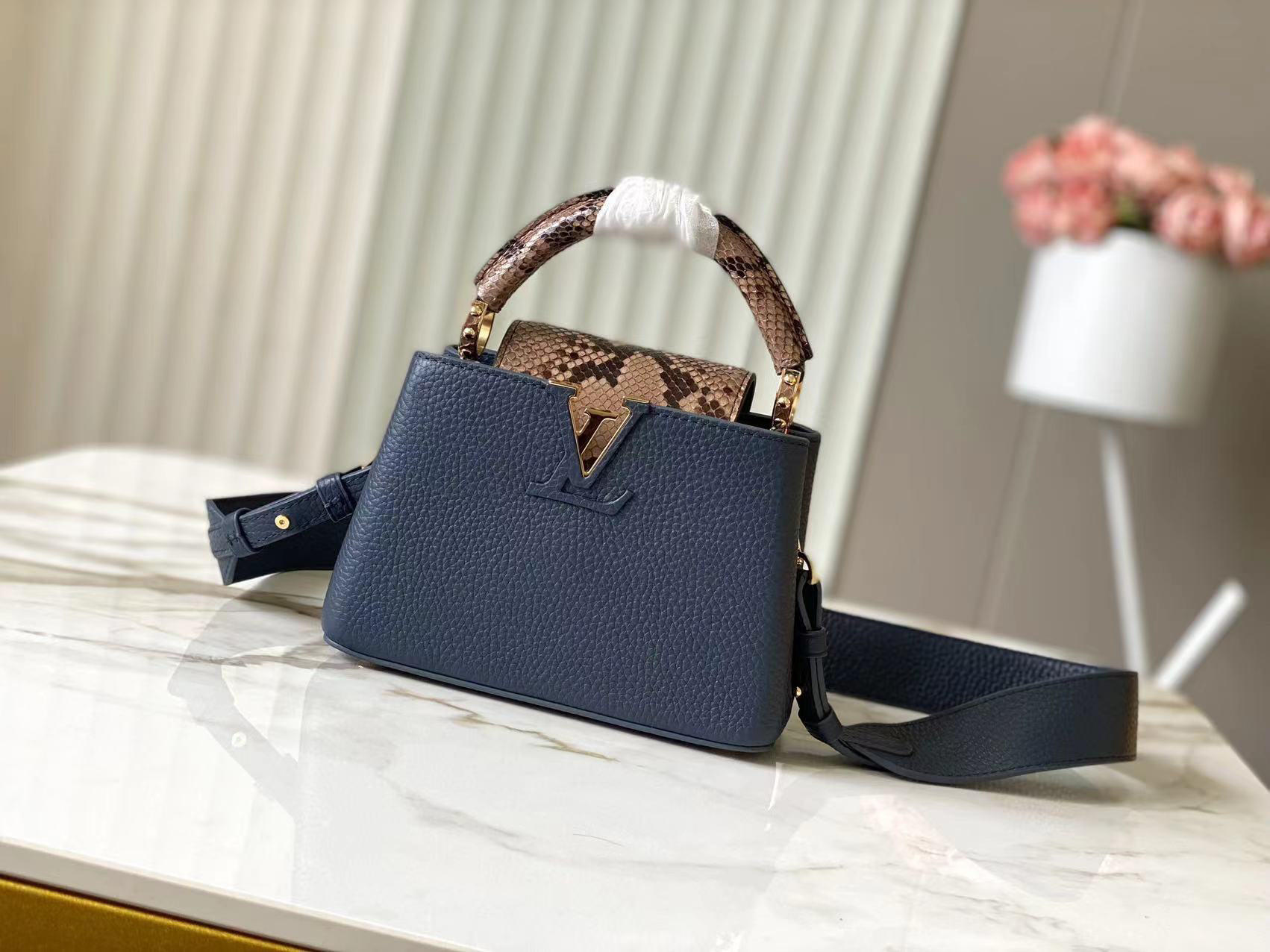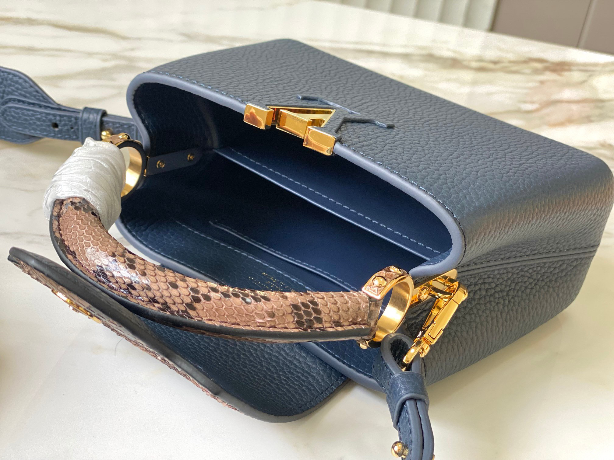 秋冬特惠💰1600 渠道级LV te级LV 全套包装 N80071/M48865深蓝 本款 Capucines 迷你号手袋以全粒面 Taurillon 皮革塑造精巧构型 搭配ding部手柄、两式翻盖及莹泽蟒蛇皮勾勒的 标识 成就昼夜皆宜的华美之选 可拆卸宽肩带令肩背或斜挎展露前卫气息 Size: 21 * 14* 8 cm