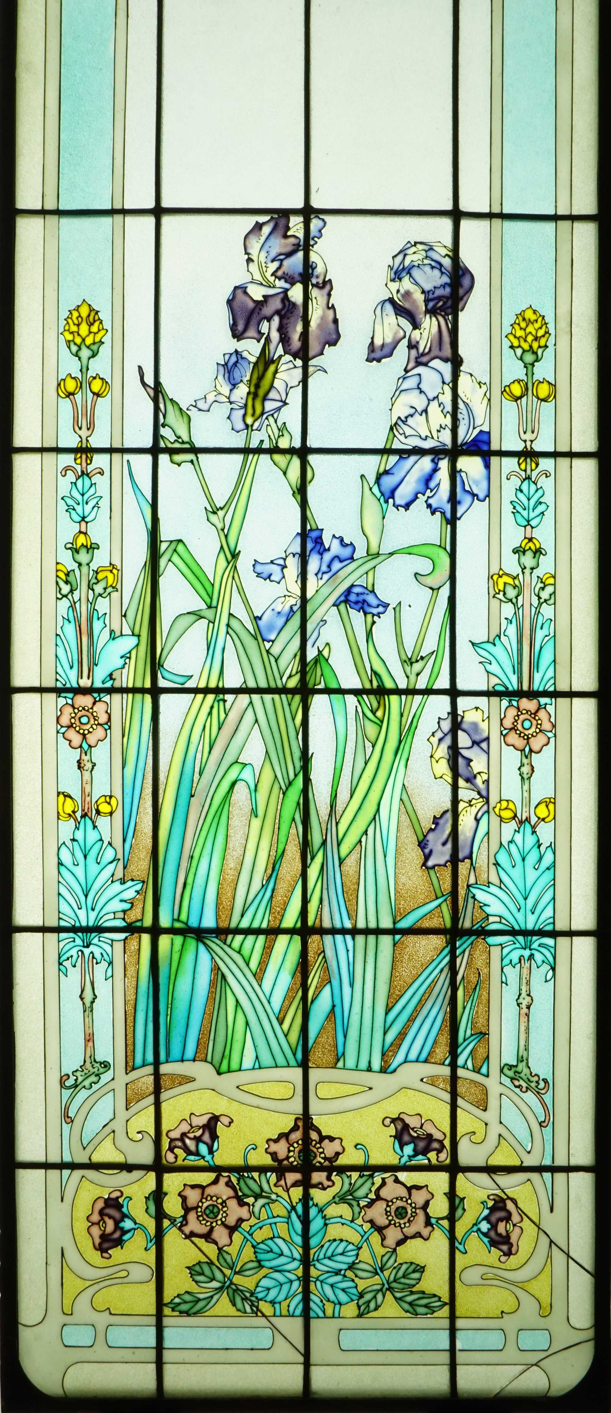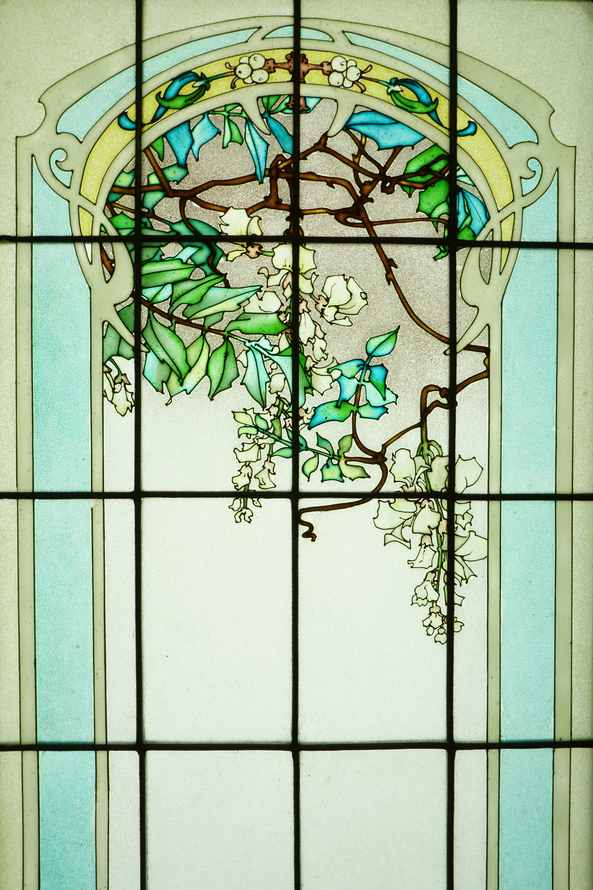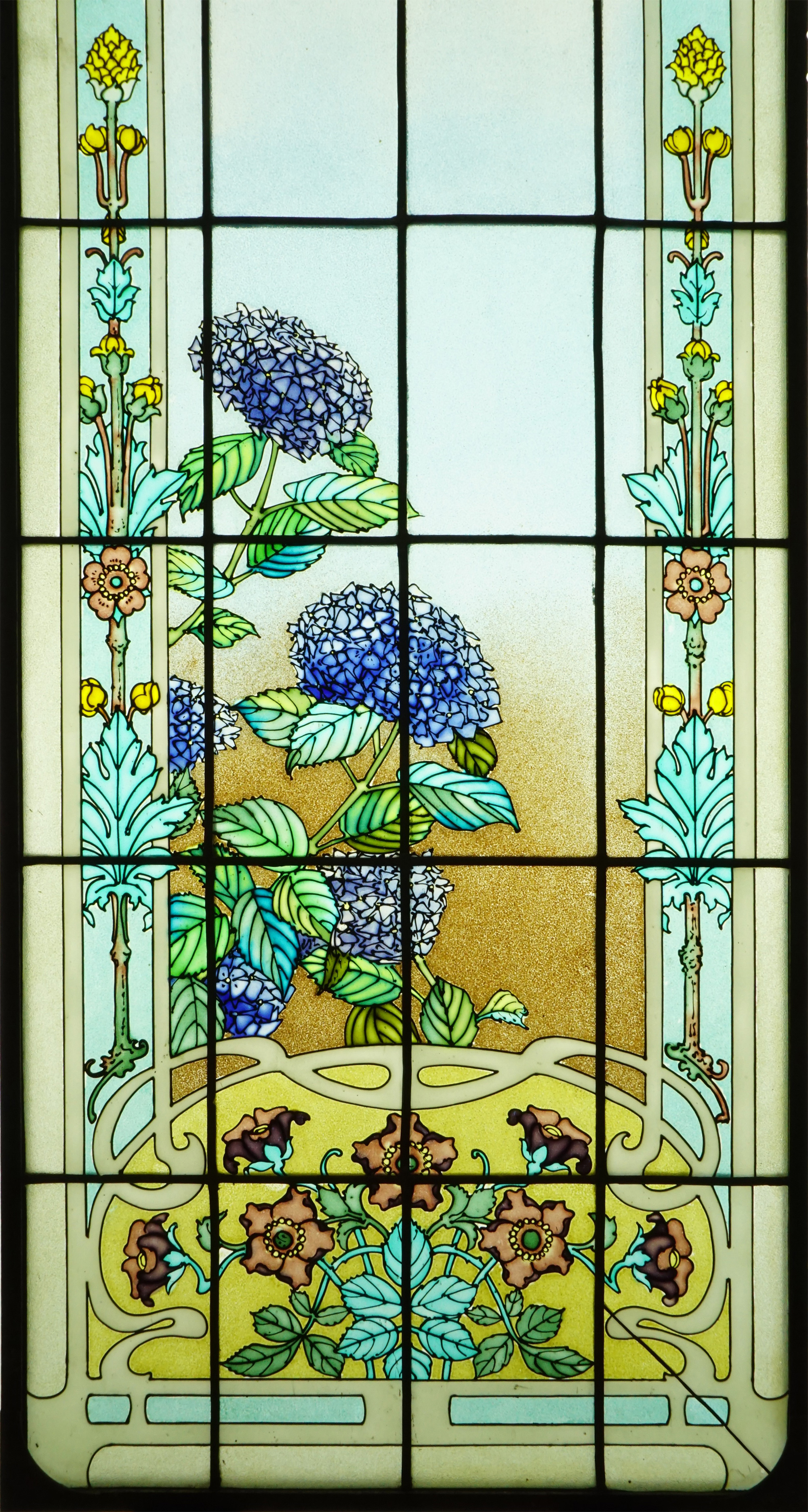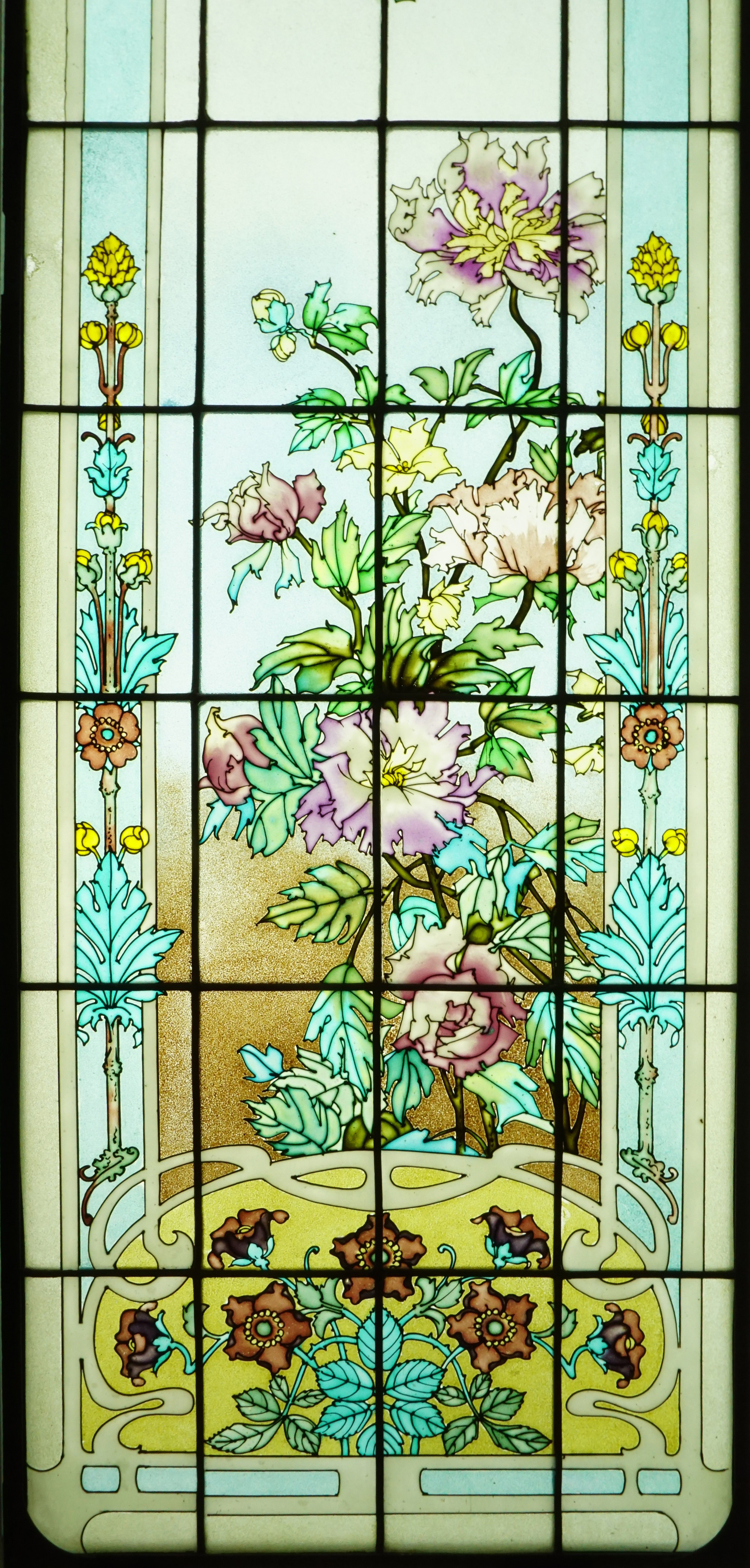独角鹿西洋古董20世纪初法国新艺术风格时期工坊L’Homme & Lefèvre签名出品繁花齐绽主题彩绘玻璃花窗一组