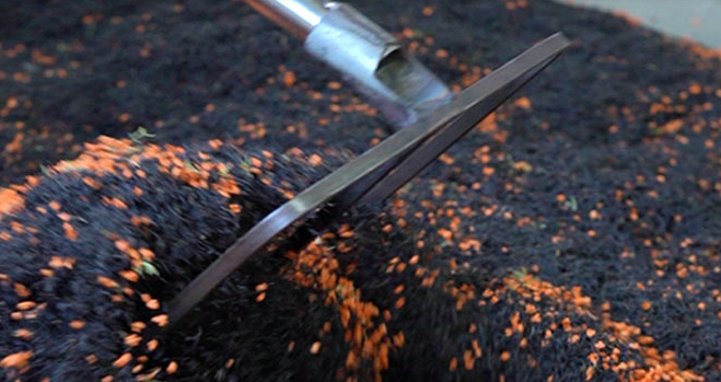 拌和。以正山小种做茶底,利用茶叶吸附性强的特性,一层茶叶一层花,通过拌合窨制工艺,让茶叶充分吸收桂花的馥郁香气。