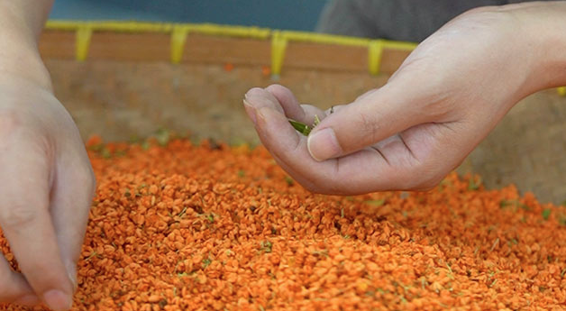打下后,经过多次筛分,筛除杂质,挑出味道鲜灵的饱满鲜花,然后摊凉散发多余的水分。