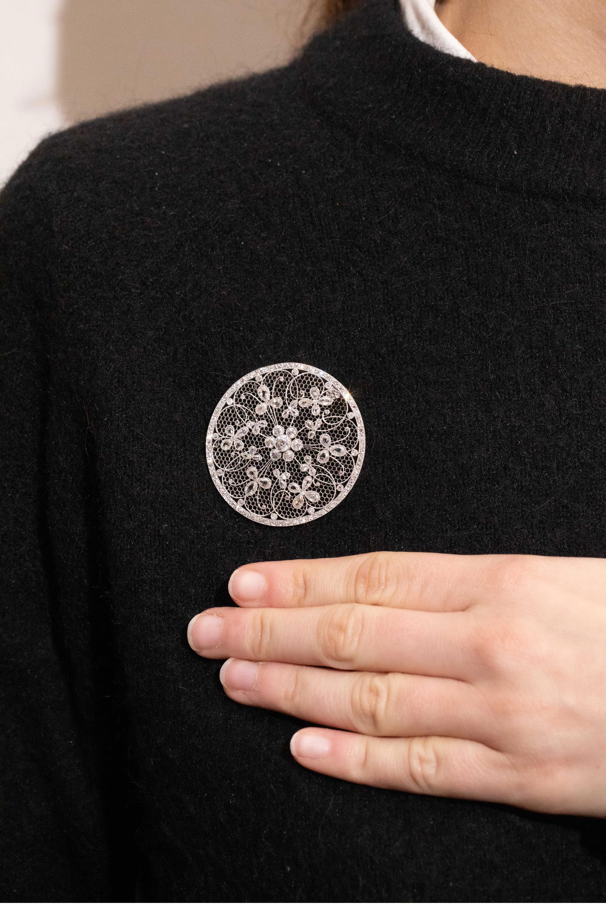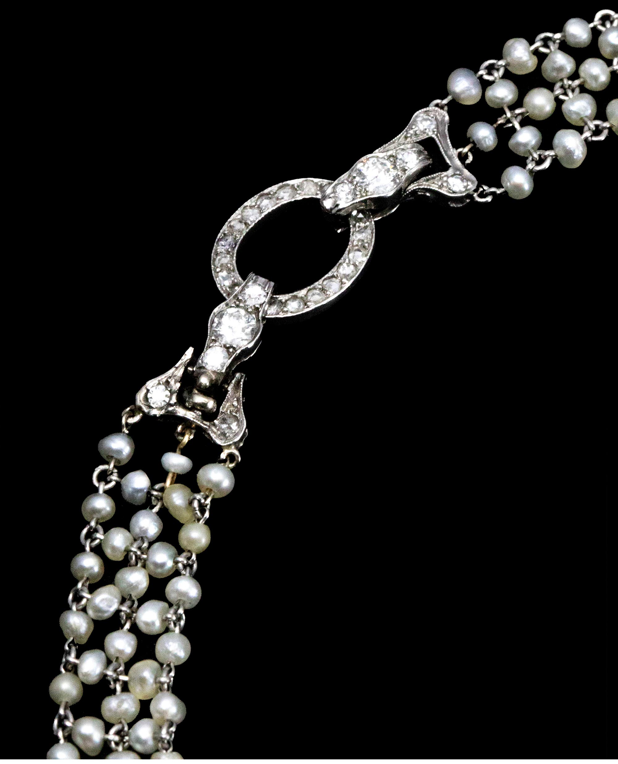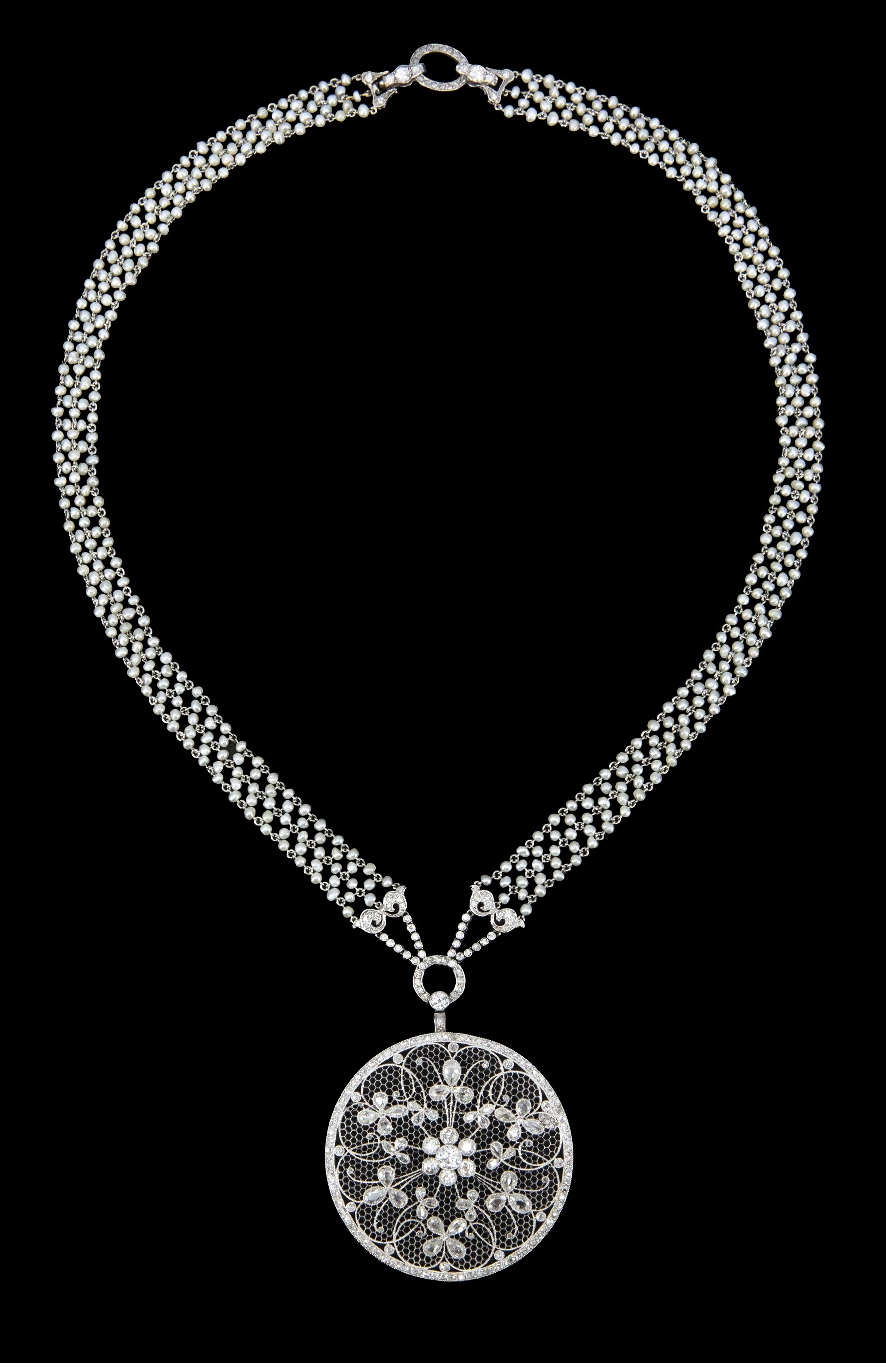 20世纪初比利时出品美好时代风格铂金镶嵌钻石及天然海水珍珠花卉造型项链