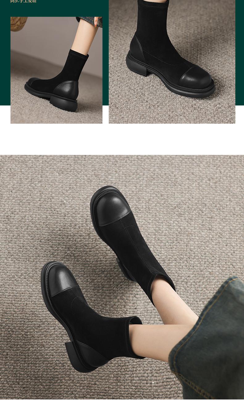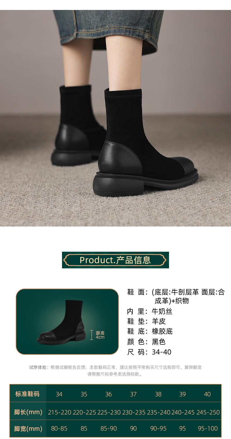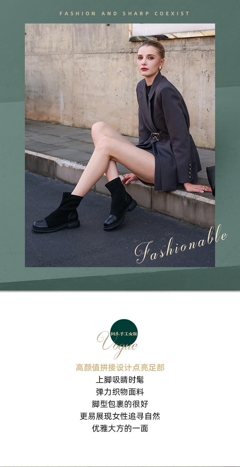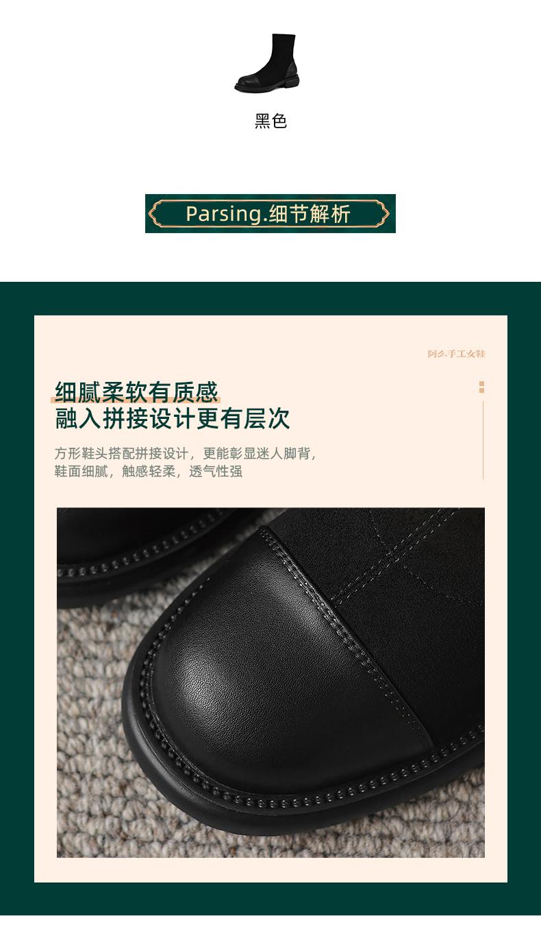 阿么手工女鞋2024新款黑色显瘦拼色真皮短靴女秋冬时尚瘦瘦靴4CM