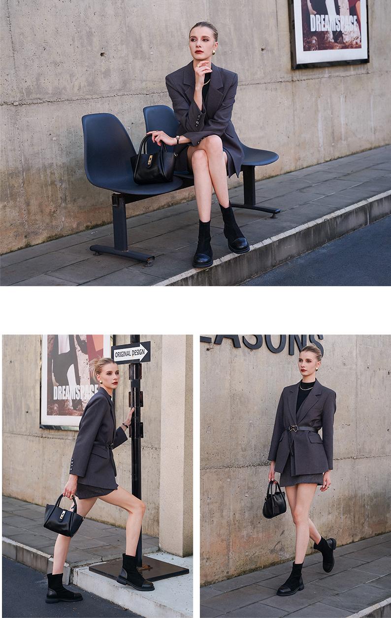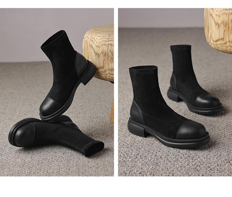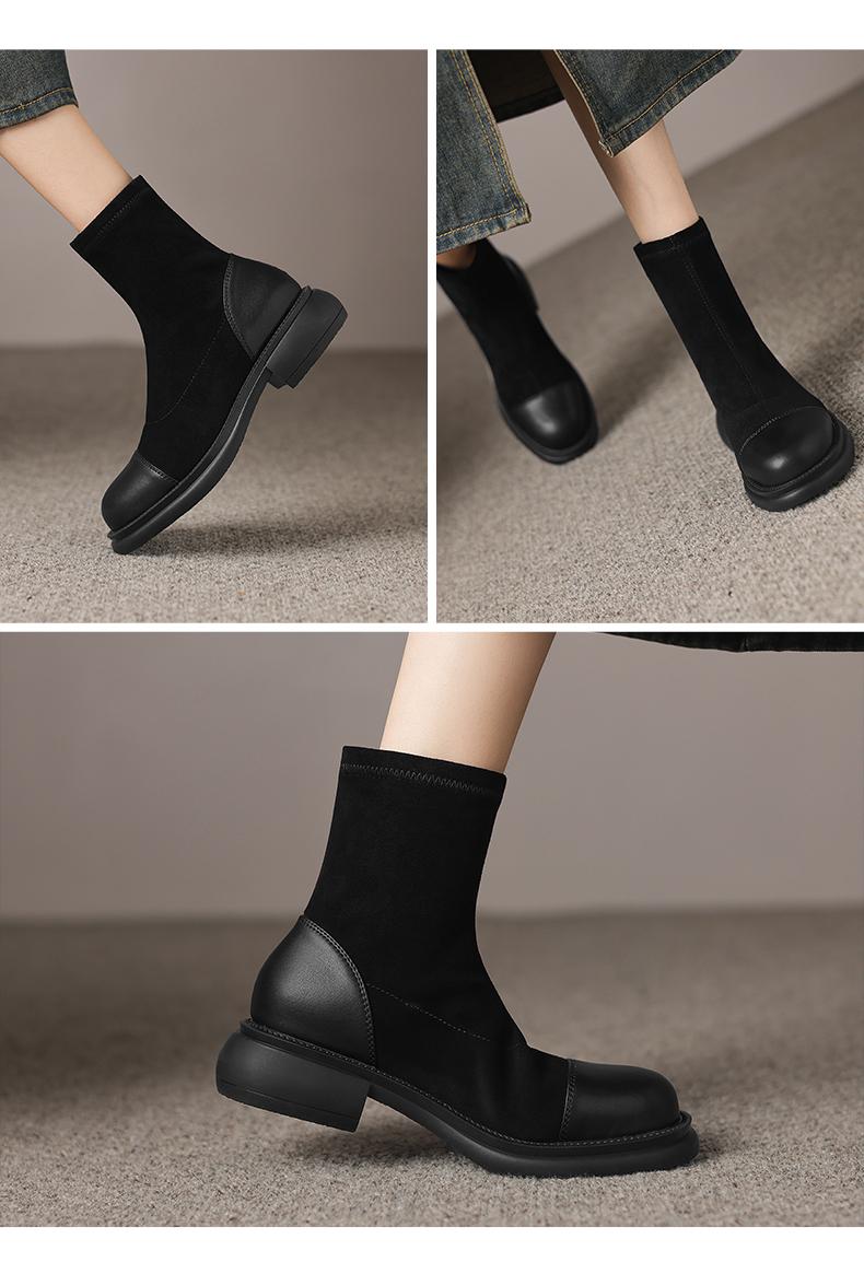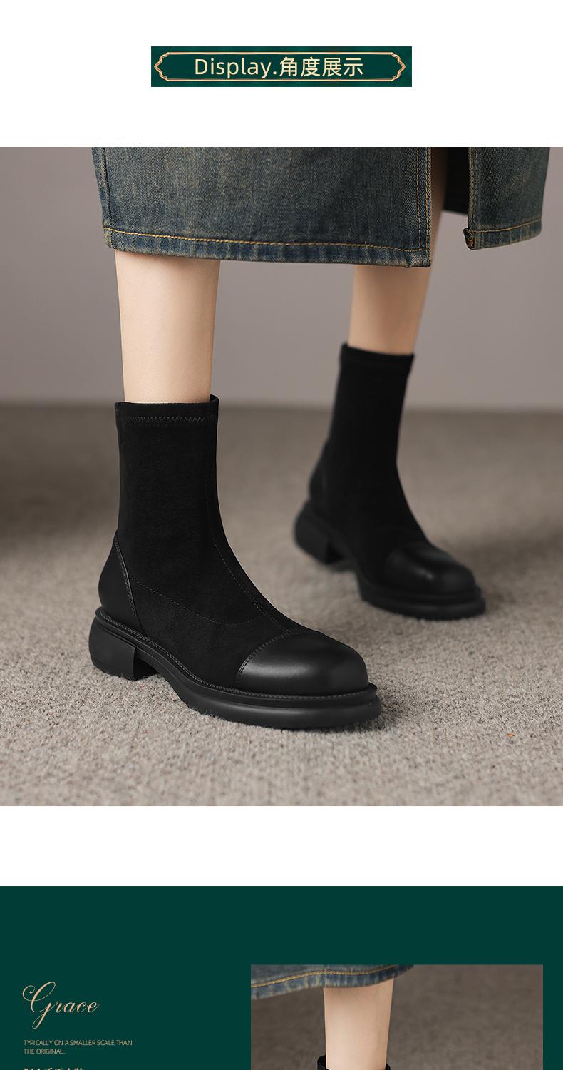 阿么手工女鞋2024新款黑色显瘦拼色真皮短靴女秋冬时尚瘦瘦靴4CM