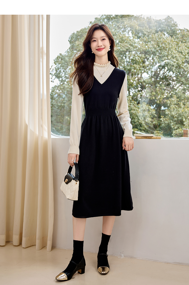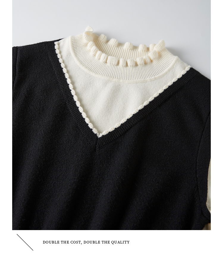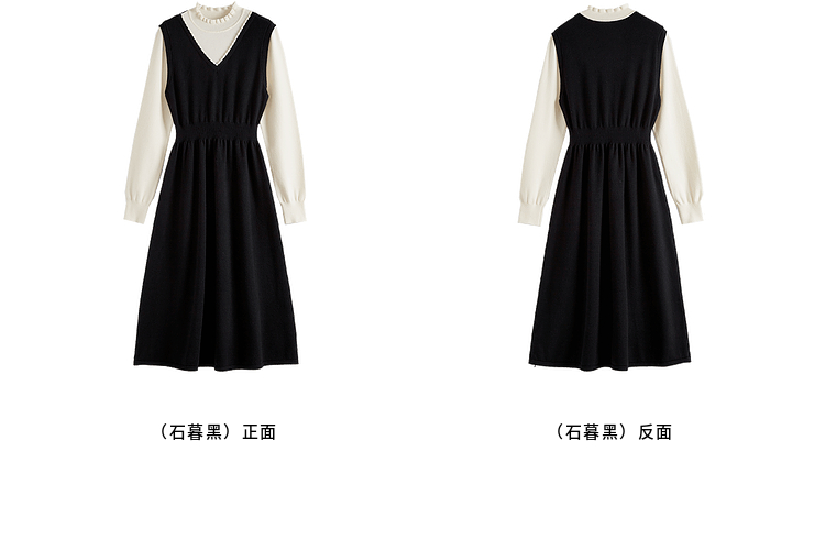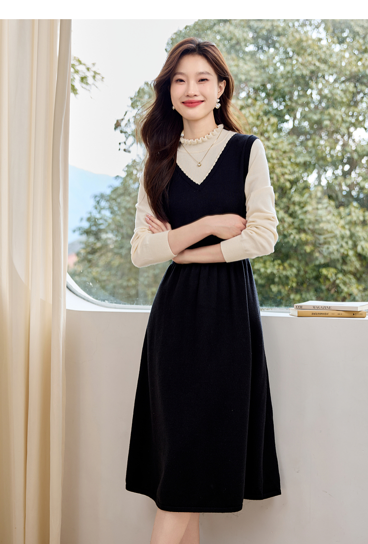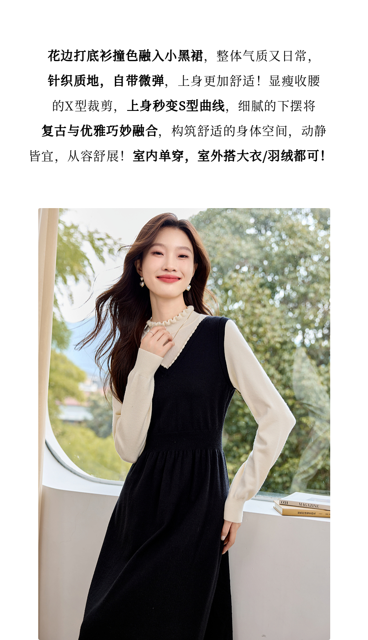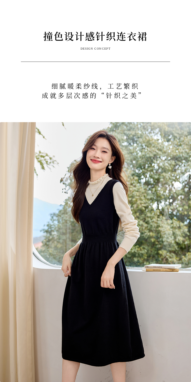 【专属特价】熙世界法式撞色花边领拼接打底假两件针织连衣裙女2025秋冬新款