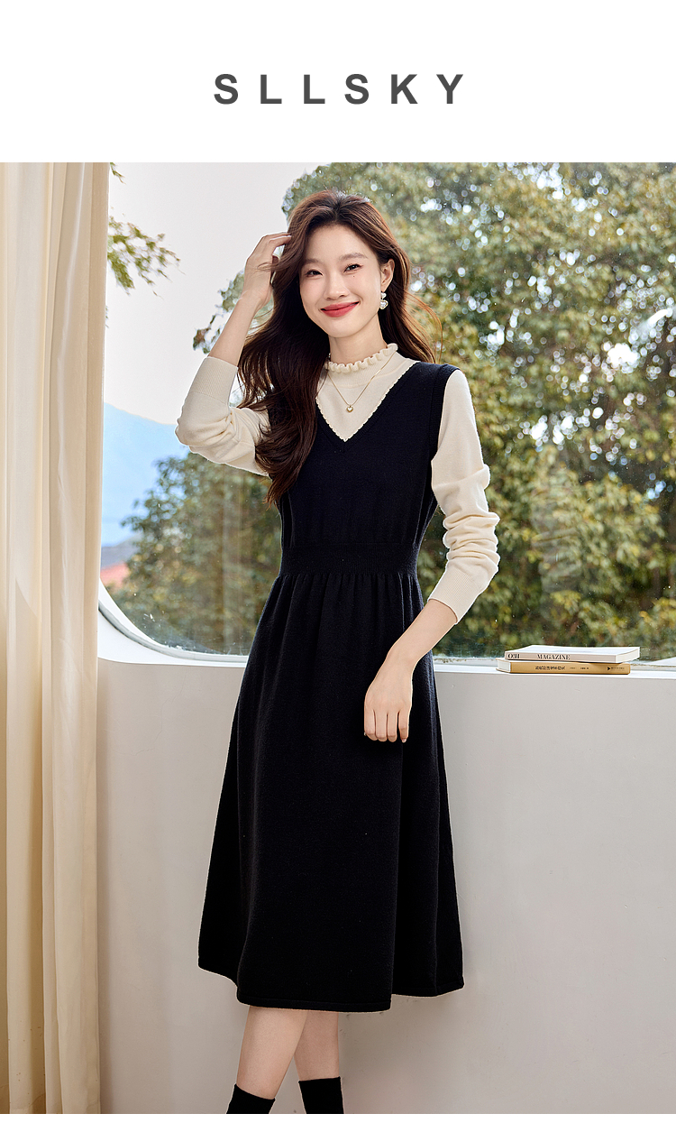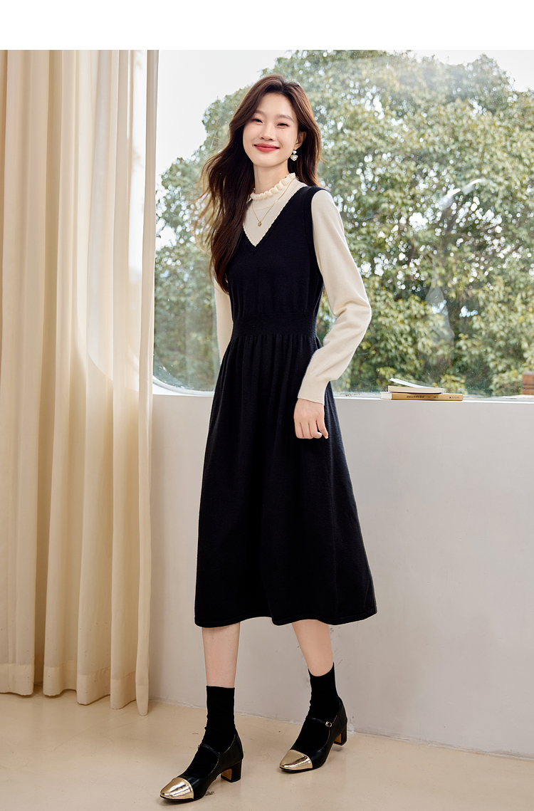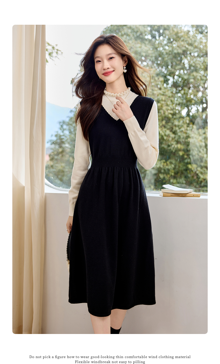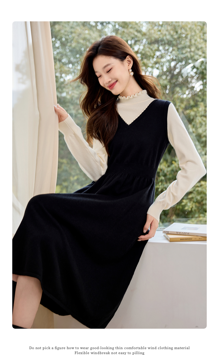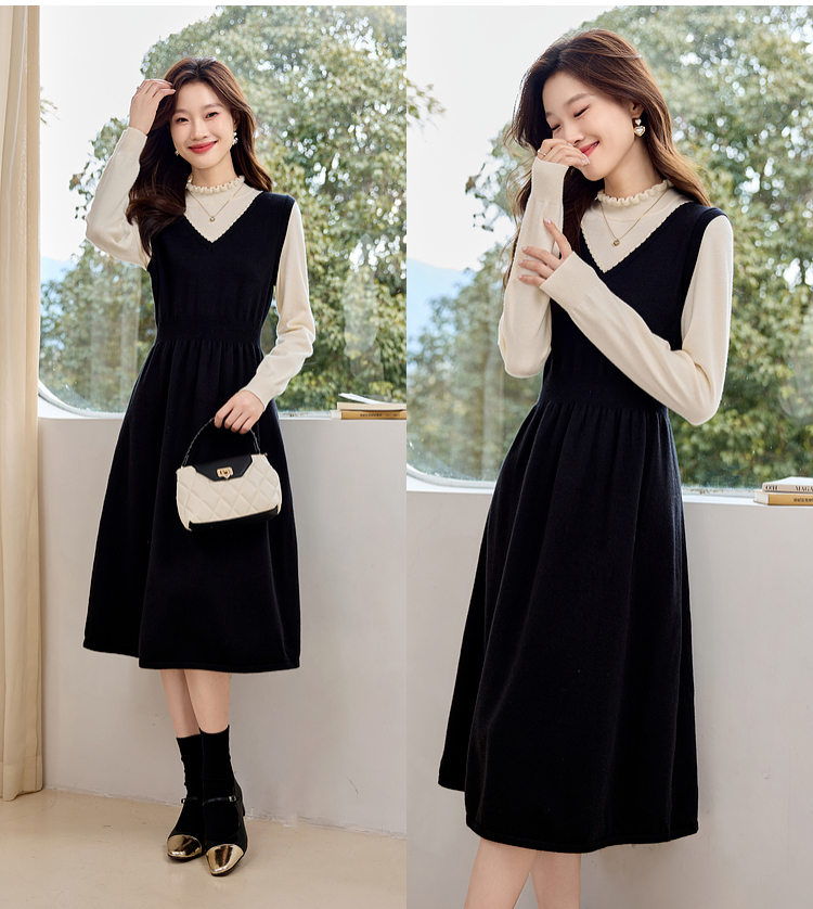 【专属特价】熙世界法式撞色花边领拼接打底假两件针织连衣裙女2025秋冬新款
