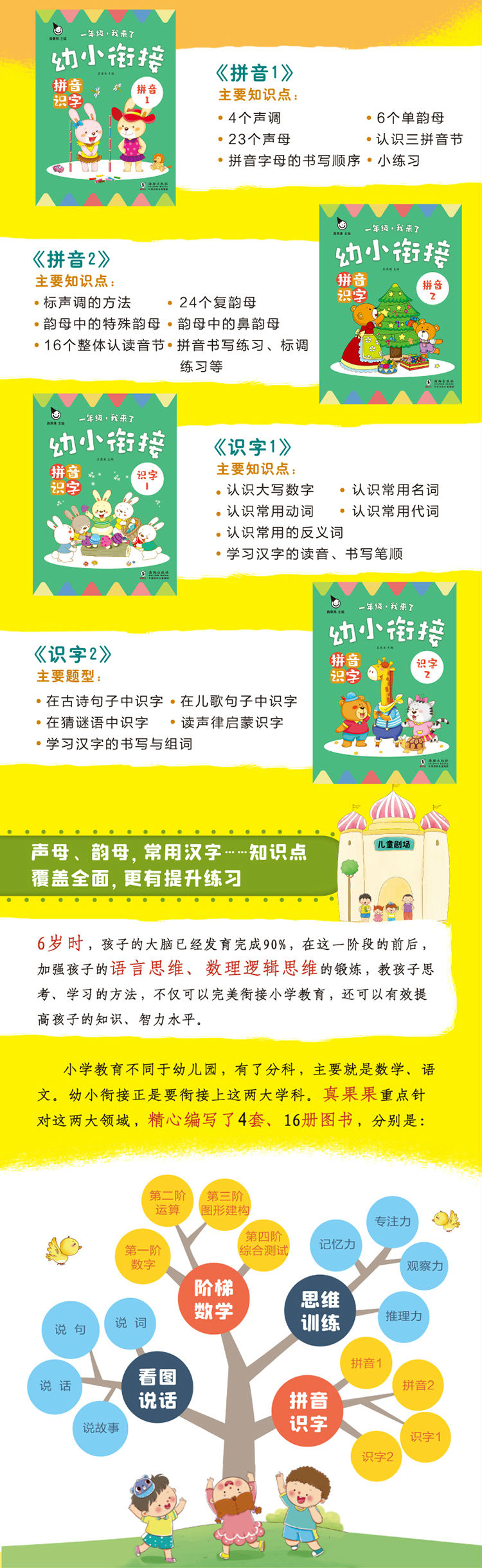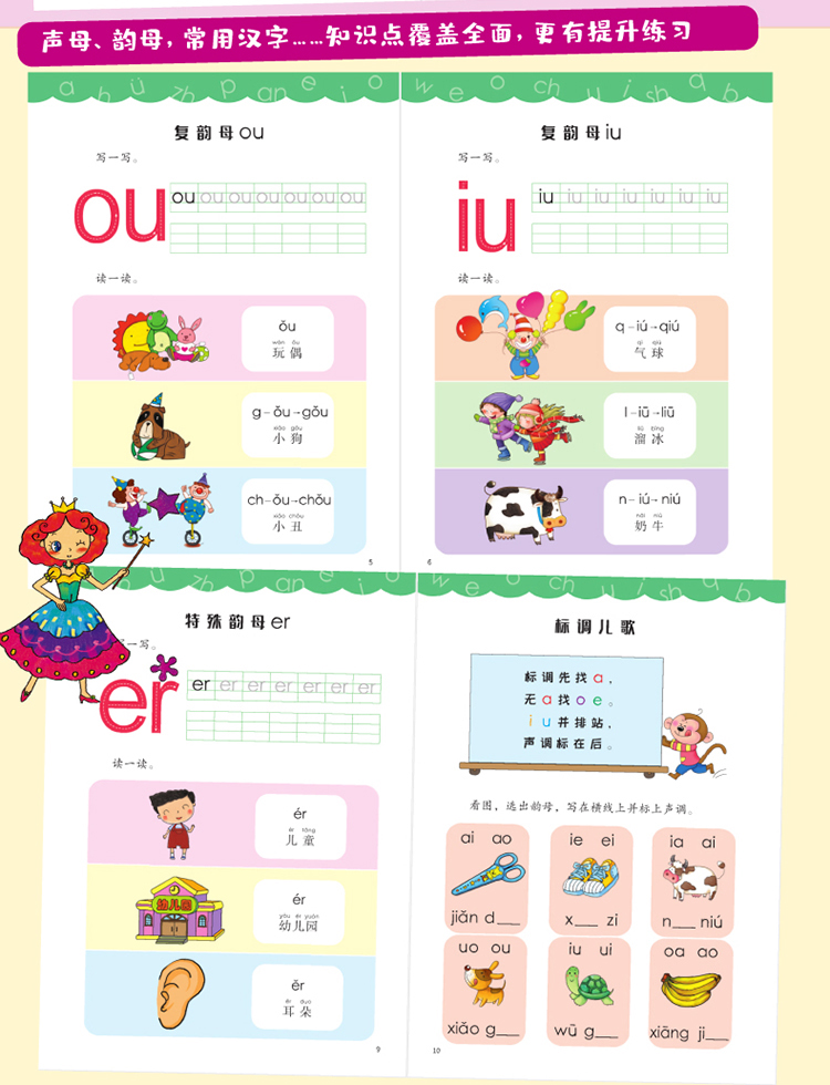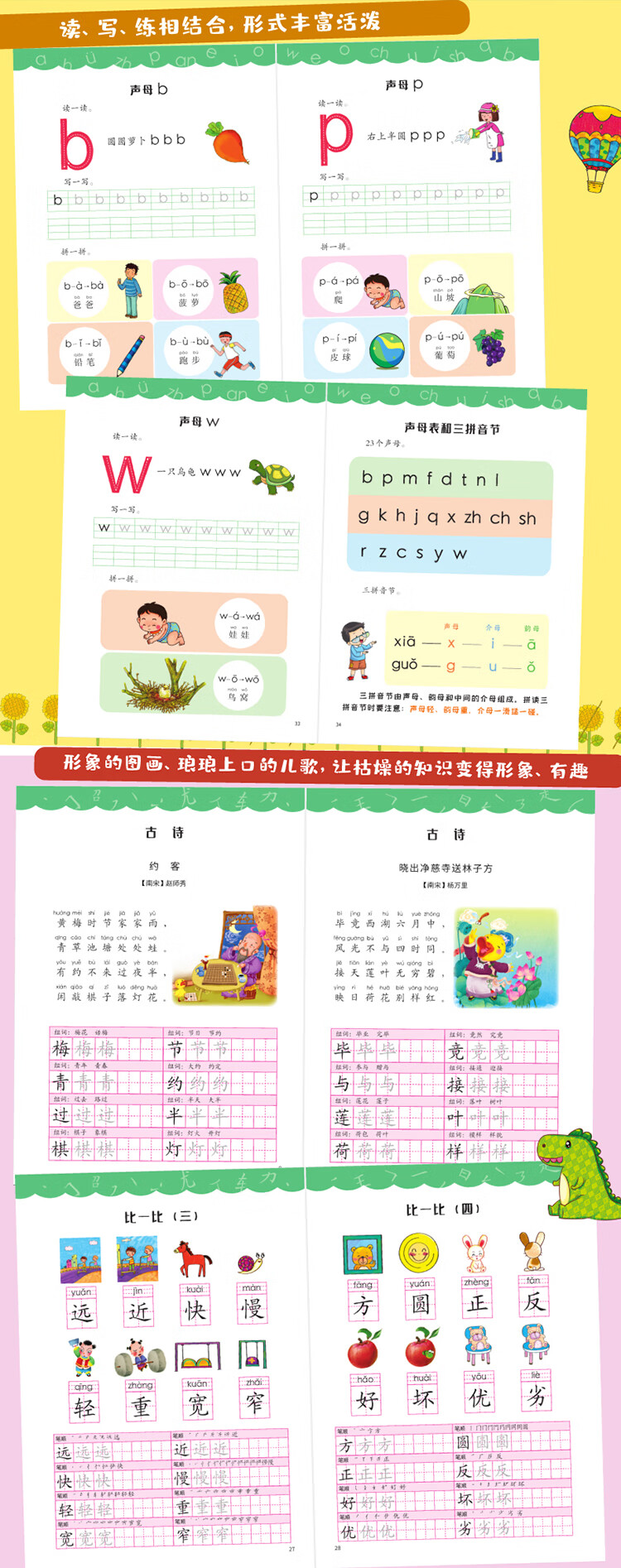 * 拼音和汉字都比较抽象,与形象的图片结合,边看图边认识拼音、汉字,可以帮助孩子更快捷地记住这些抽象的知识。