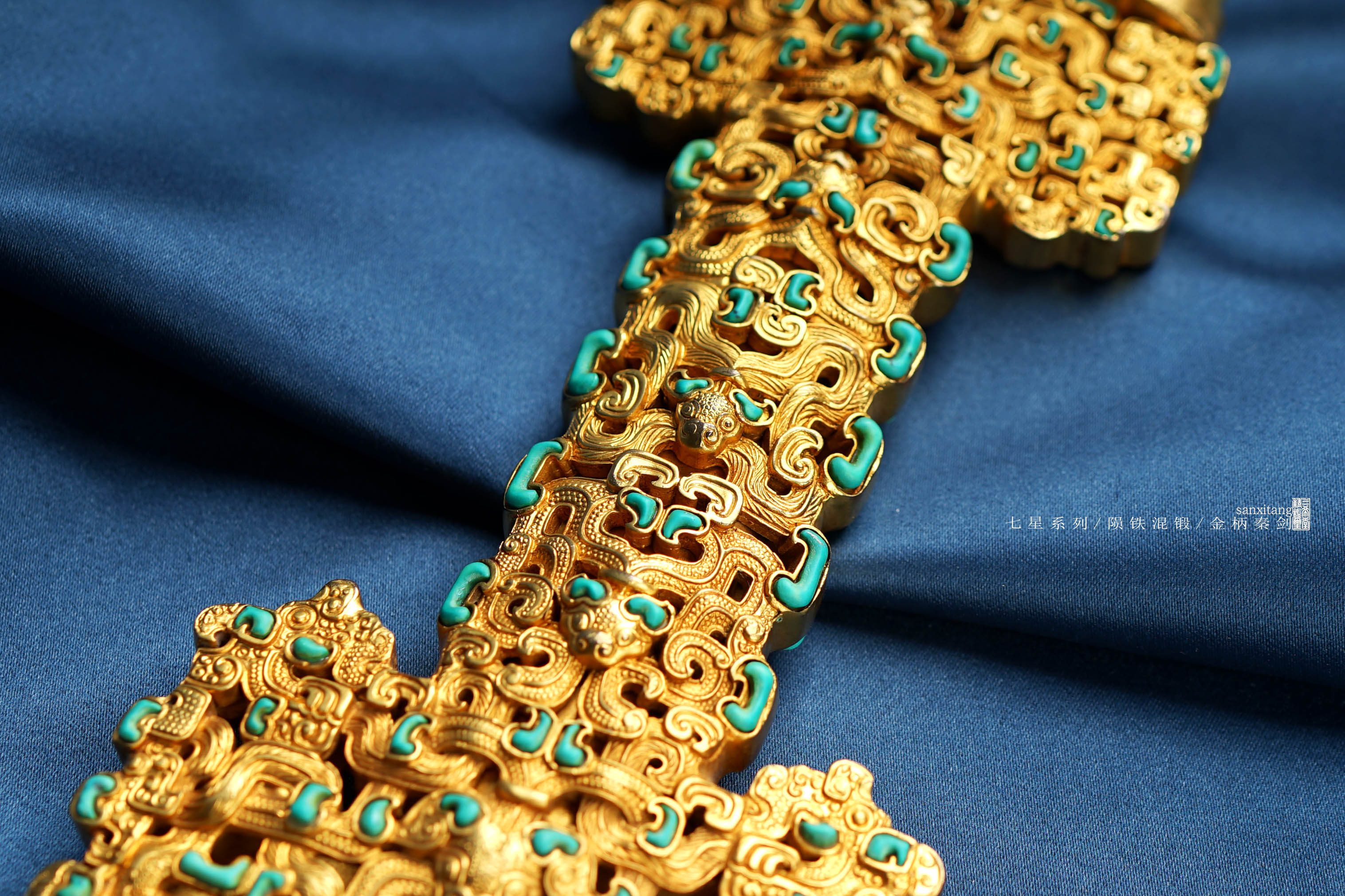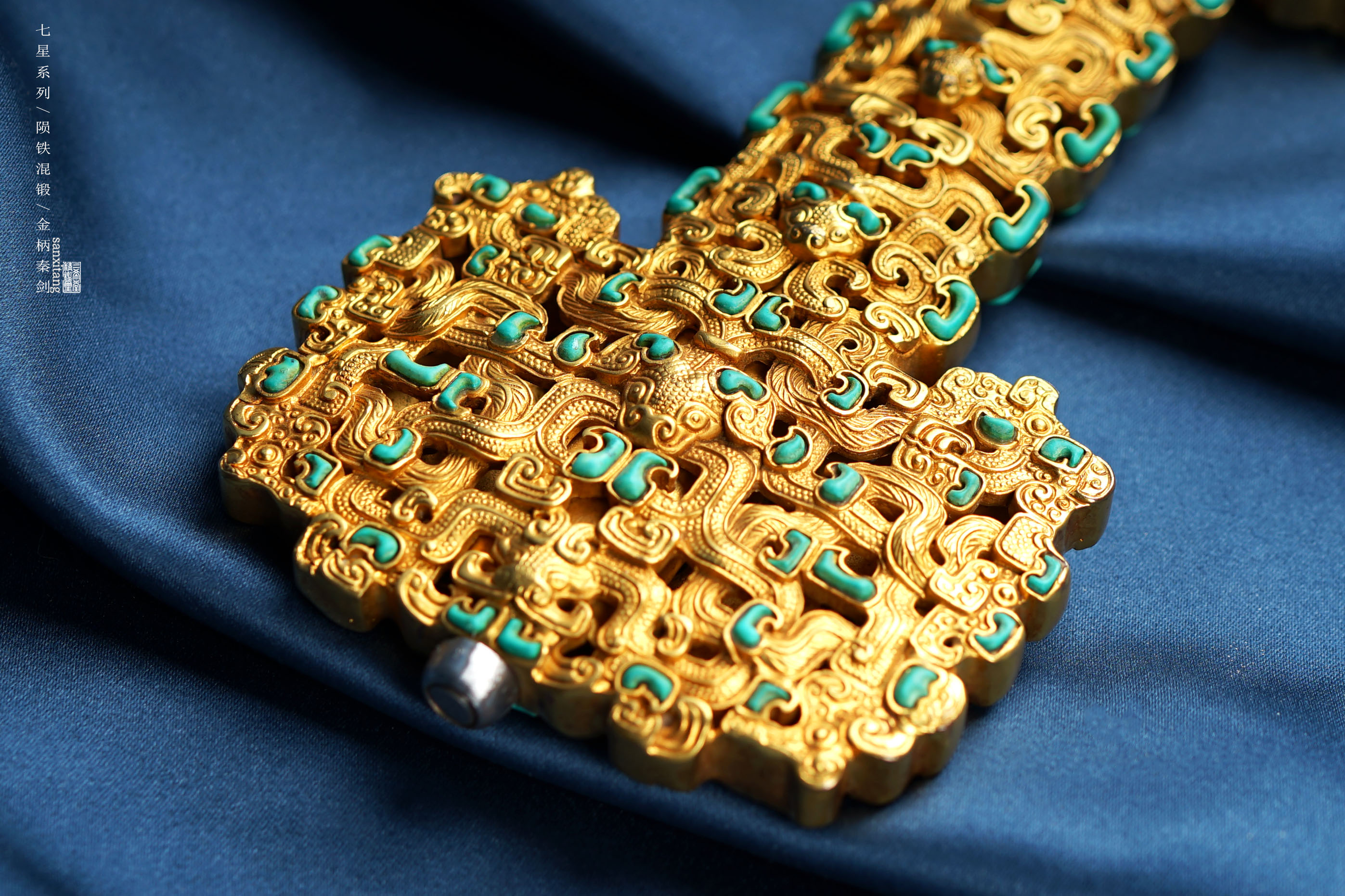 整体手工浮雕蟠龙纹铜地错金金具,用的古法鎏金,颜色相当正,没有一丝现代化学金的轻浮感,雕刻师傅技艺精湛,这么大尺寸的雕刻,整体纹路饱满立体,镂空繁复,多层叠加,做成这样子也算还可以了,按古物镶嵌绿松石,金绿配色从古至今都是富贵的象征。我们加了很多瑞典M陨铁手工锻打32000余层的陨铁剑条,八面型制,搭配三希堂核心研磨工艺,表面清澈的像西湖水一样,柔顺自然且冷艳逼人,陨铁的一丝丝雪白纹路被展现的淋漓尽致,这是其他材料都做不出来的效果,必须是加入很多陨铁,让陨铁含量极高才能有的,这只作品最适合居家摆放或者送送重要朋友,肯定是牌面十足!!!