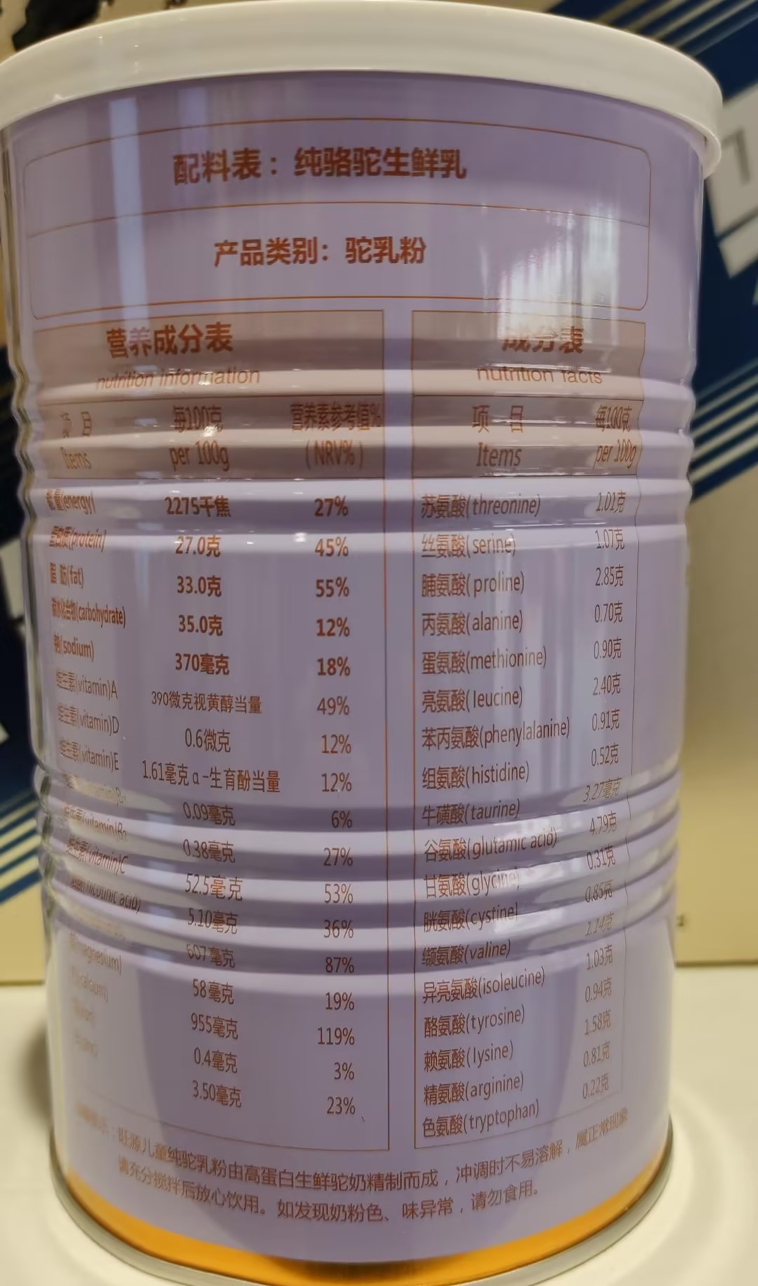 【配料】纯骆驼生鲜乳