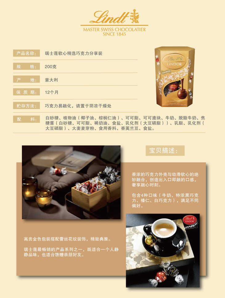 Lindt瑞士莲软心巧克力精选特浓黑牛奶白巧克力分享装200克