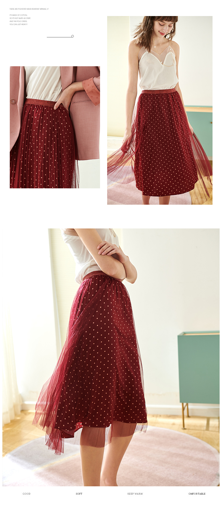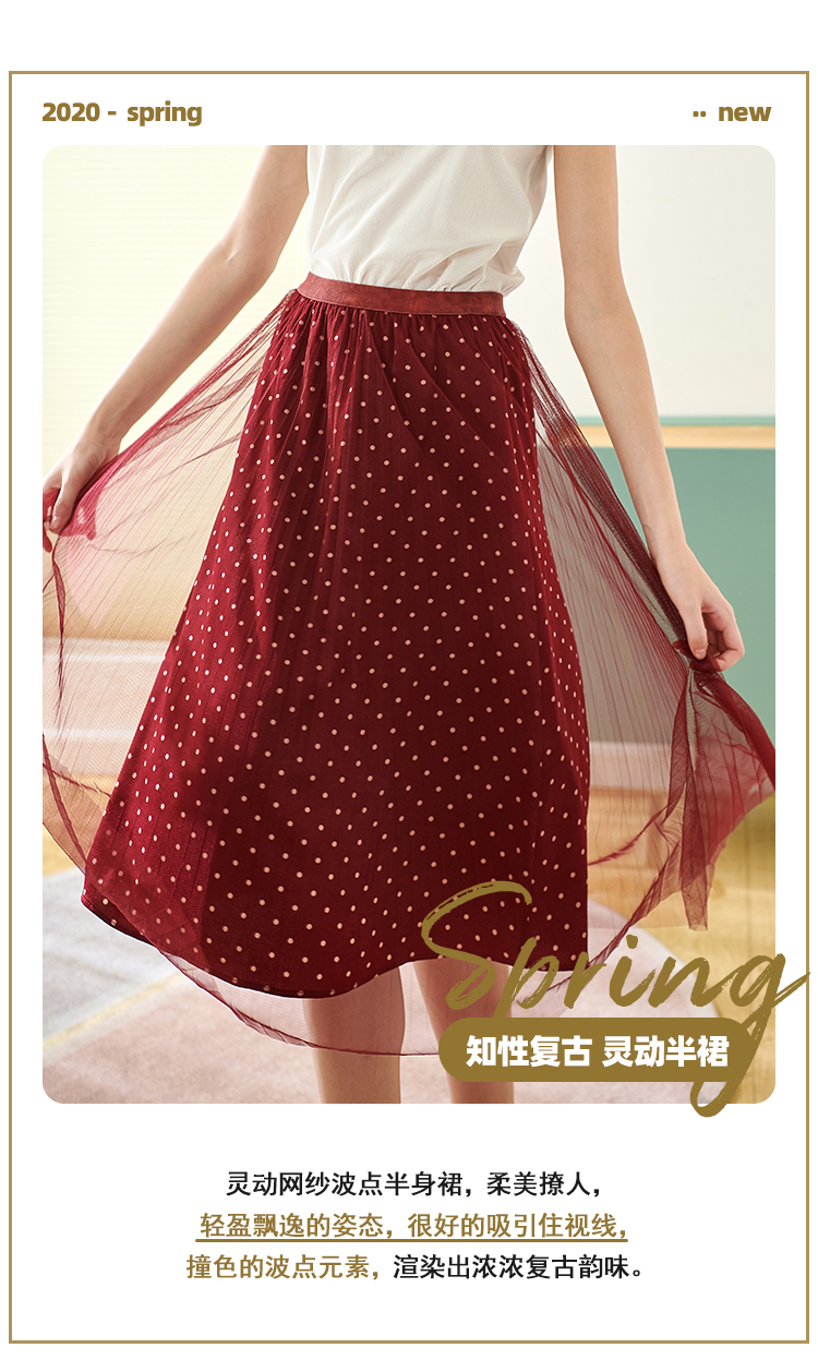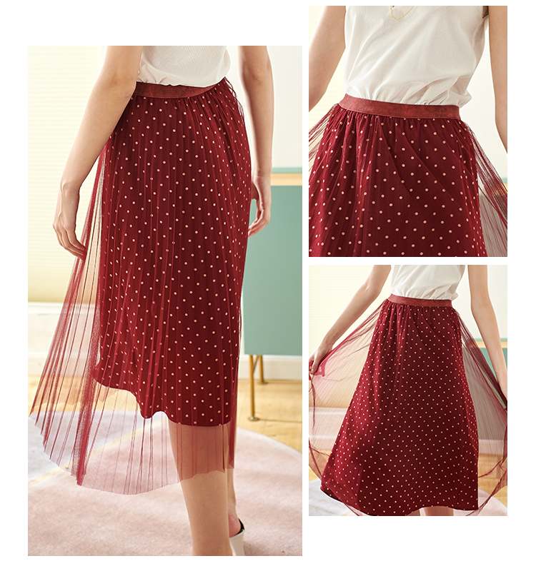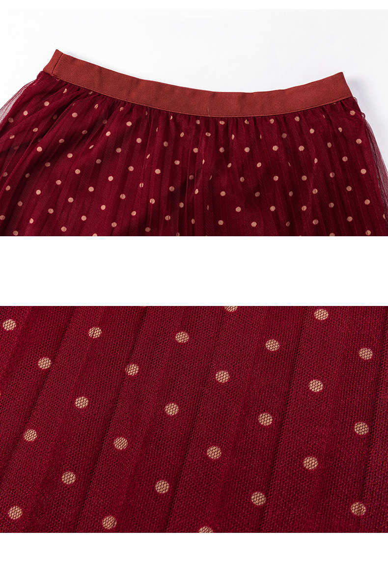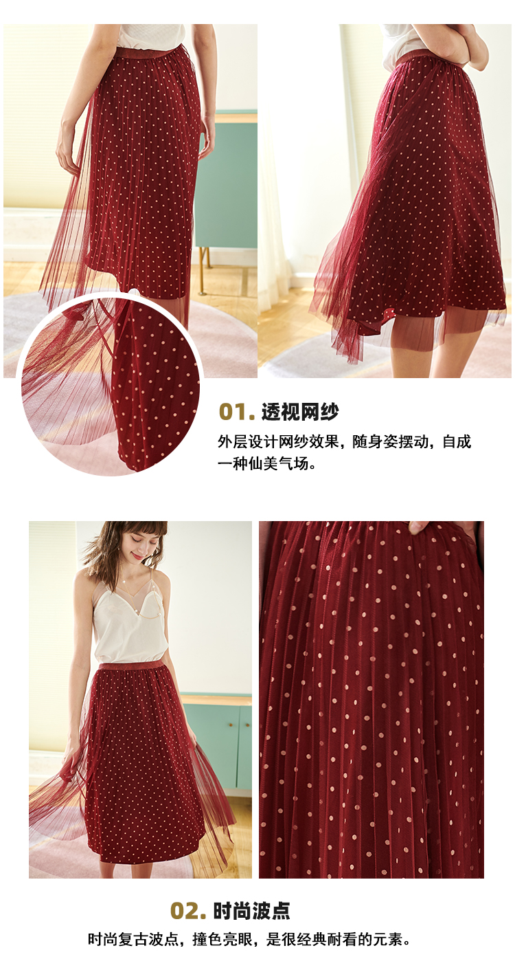 欧芮儿春装新款高腰波点半身裙女中长款复古网纱红色百褶裙