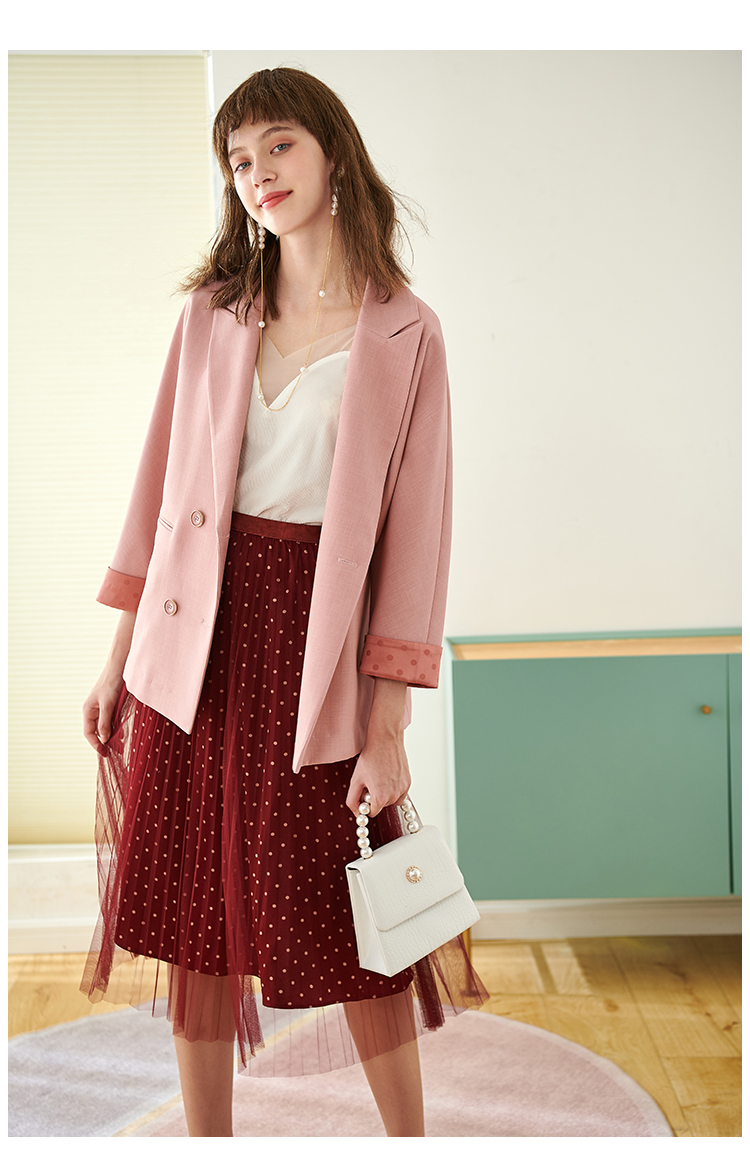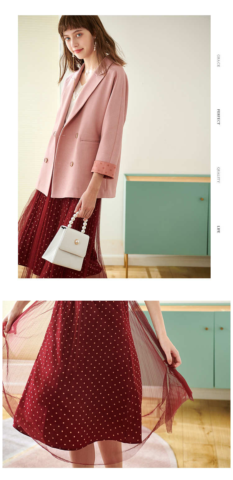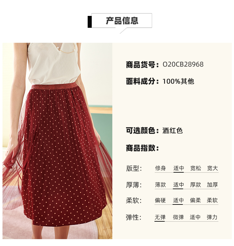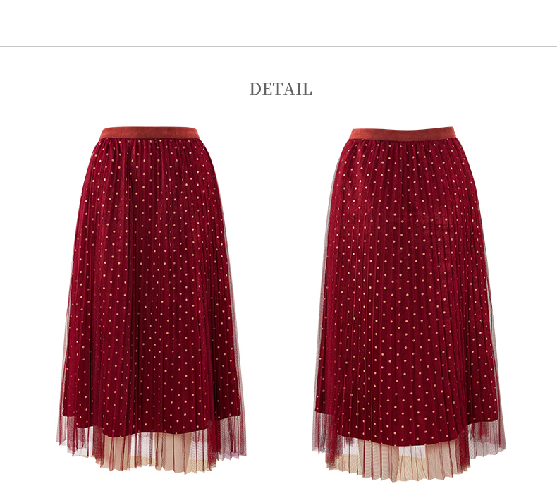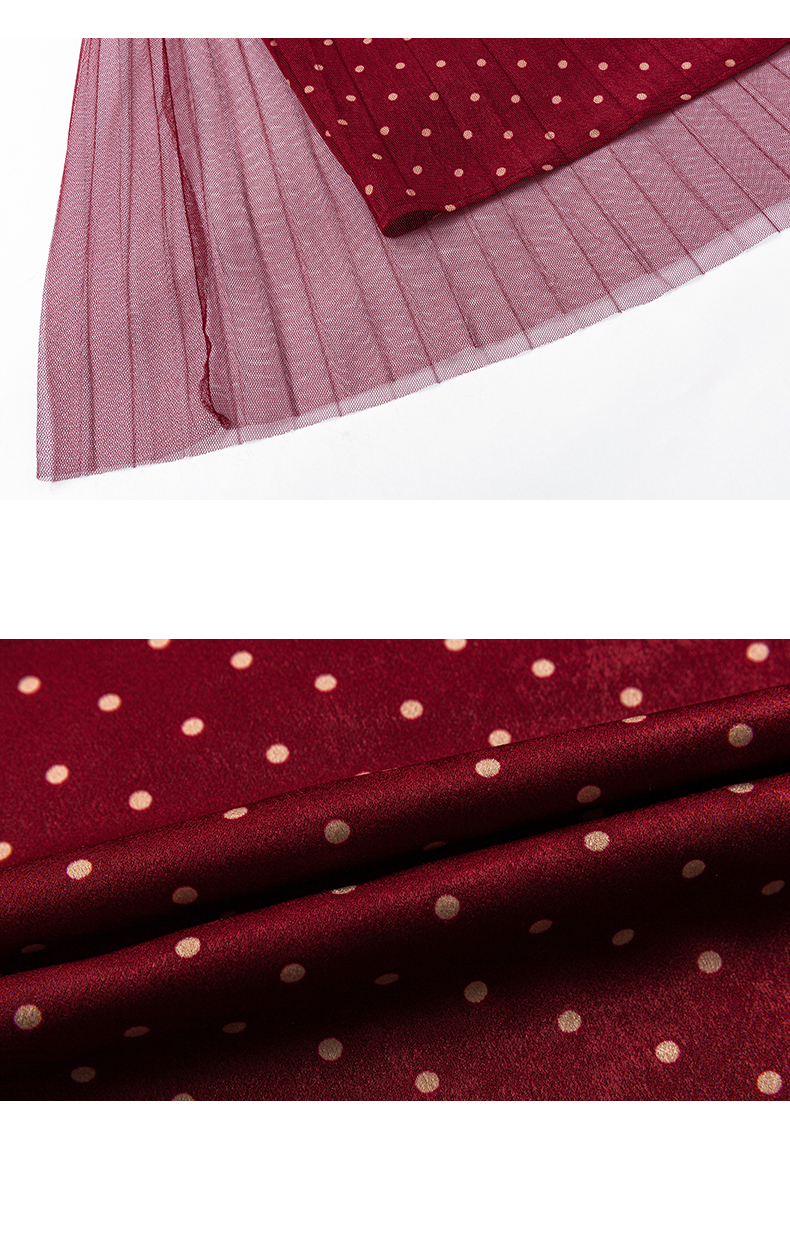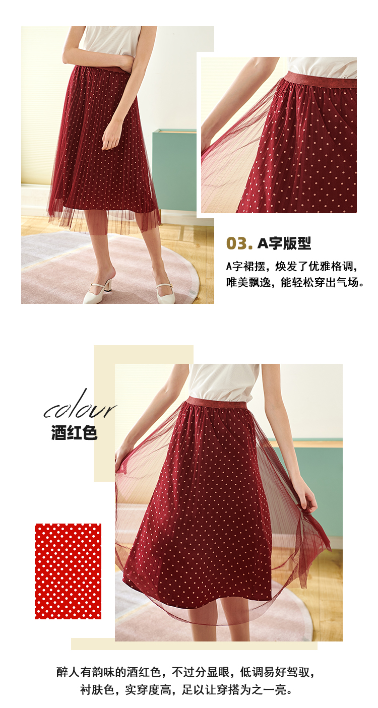 欧芮儿春装新款高腰波点半身裙女中长款复古网纱红色百褶裙