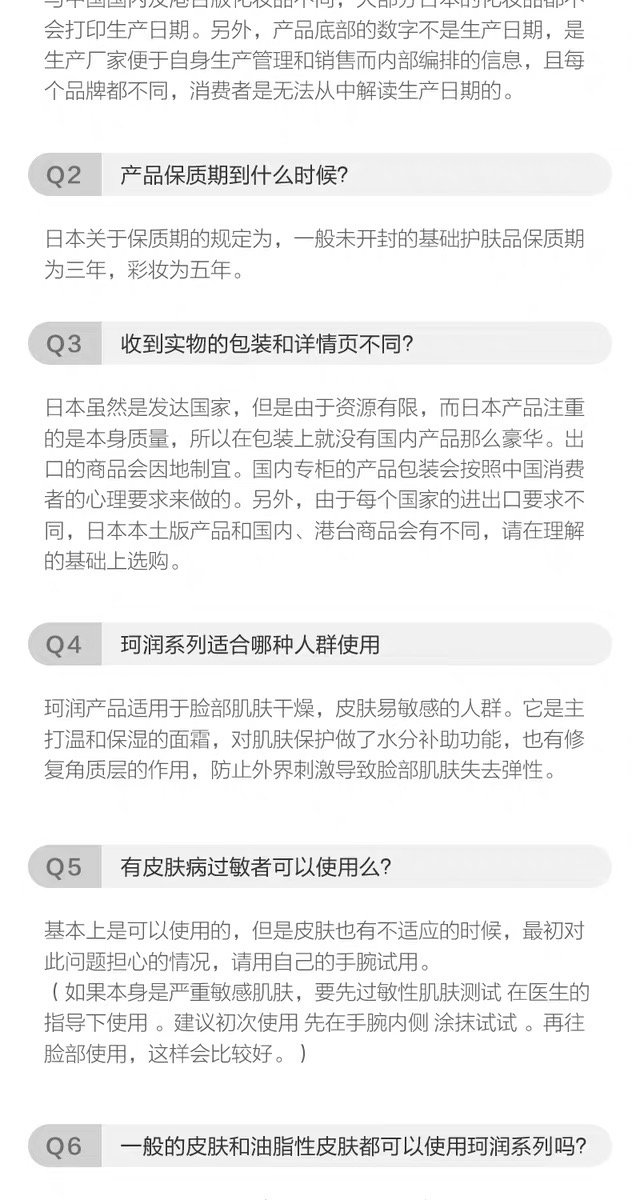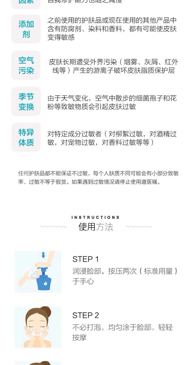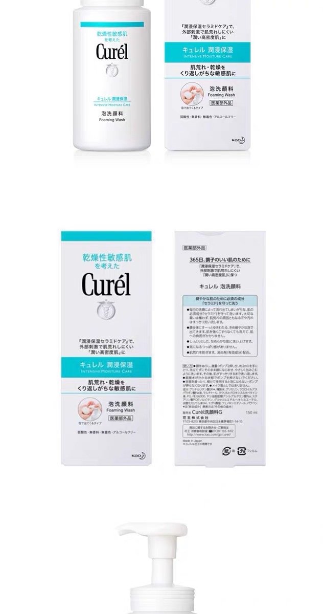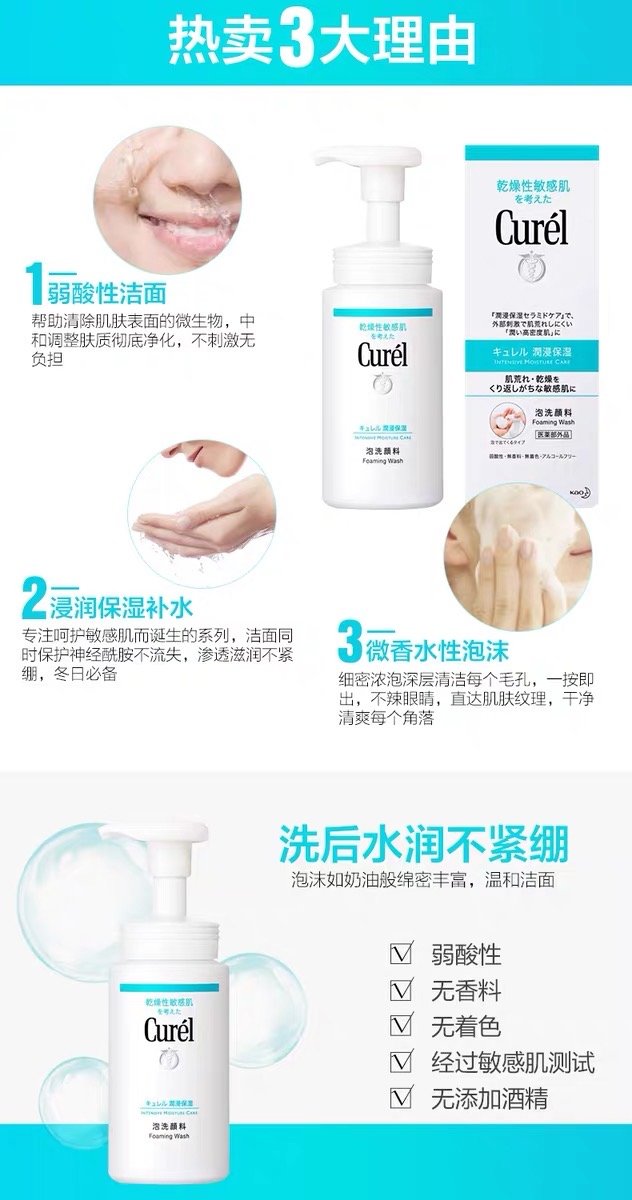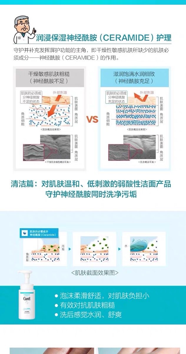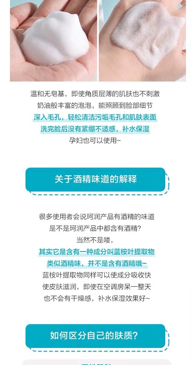 3、功效:珂润泡沫洁面乳,它能瞬间形成盈泡沫,比一般洗面奶表现更持久,更丰盈哦~。洁面时无需过度搓揉,不会对肌肤造成负担,用后感觉舒爽水润,减少引起肌肤敏感,能彻底洁净汗水及油脂污垢,同时守护肌肤的“Ceramido神经酰胺 ”成分。记住它是弱酸性,无香料,无色素,无酒精,防敏感配方,防刺激配方,敏感肌必备品哦!