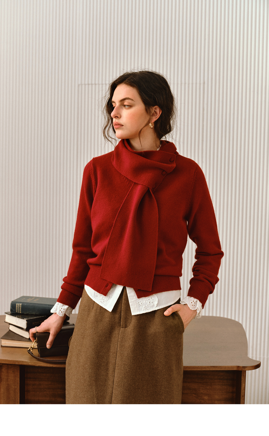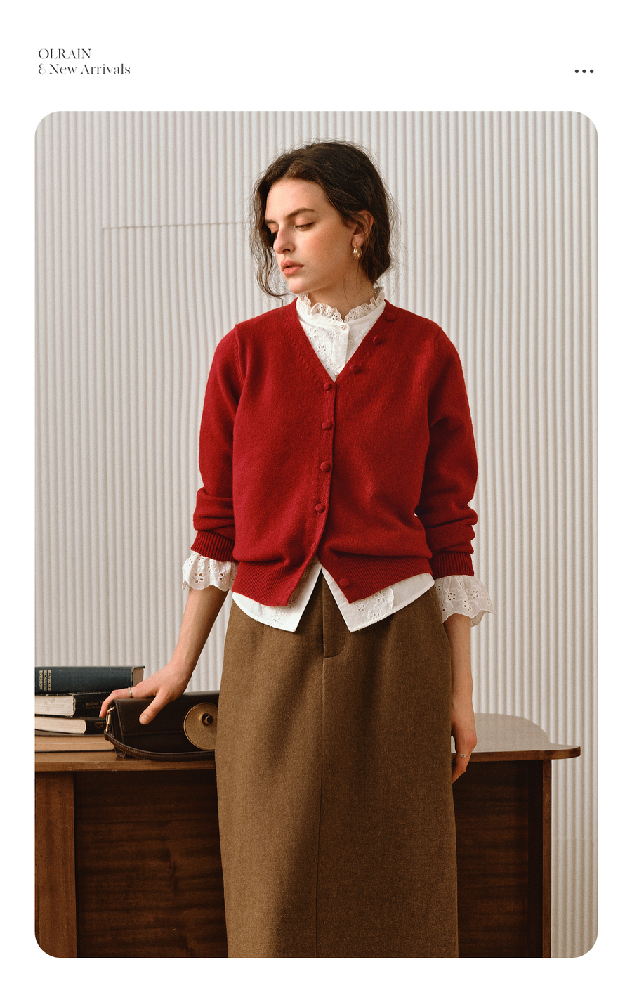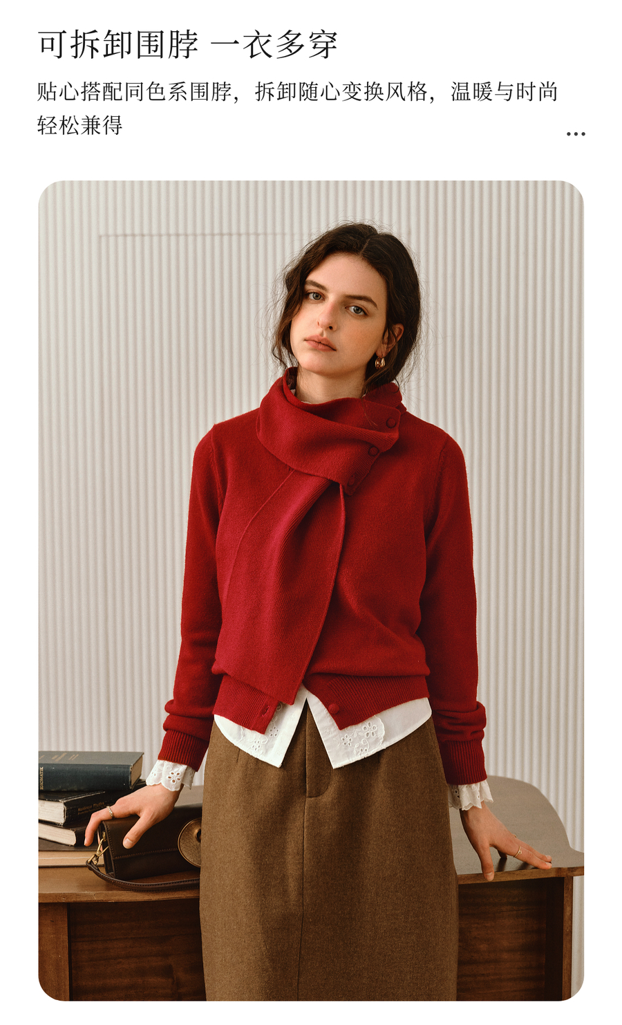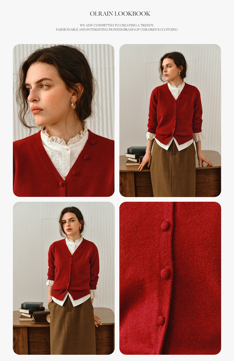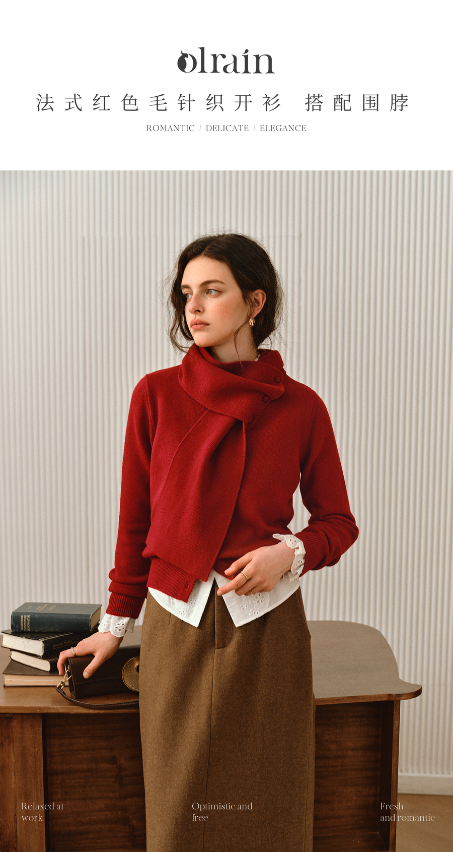 OLrain欧芮儿2025新款女秋季法式红色毛针织V领开衫围脖两件套