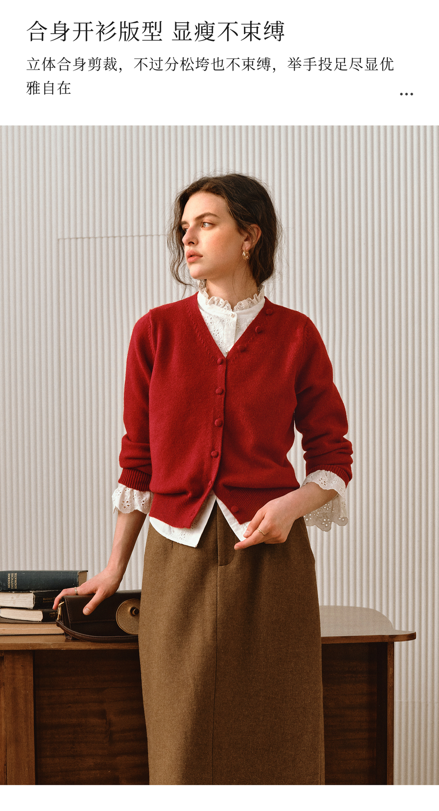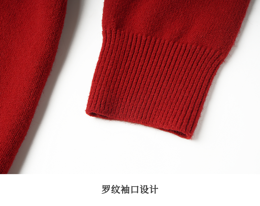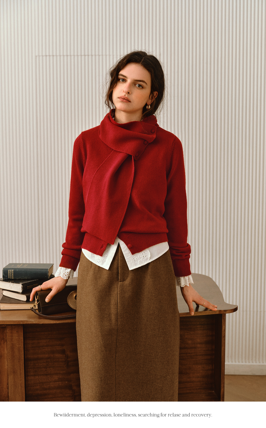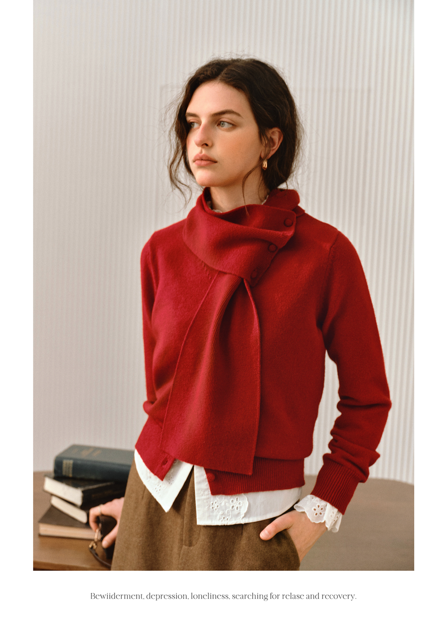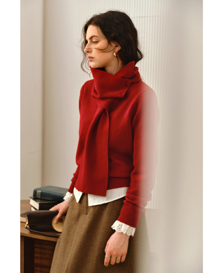 OLrain欧芮儿2025新款女秋季法式红色毛针织V领开衫围脖两件套