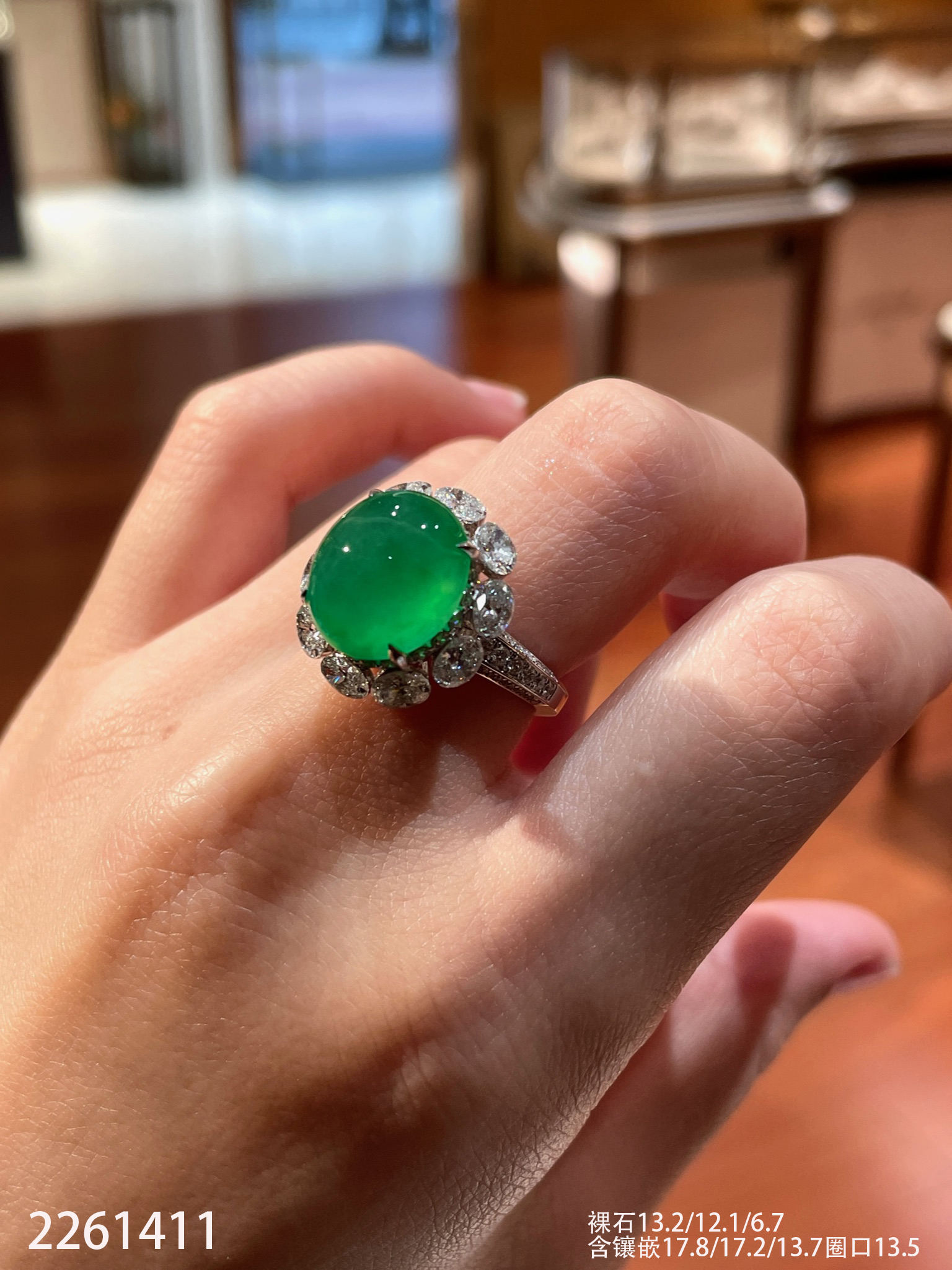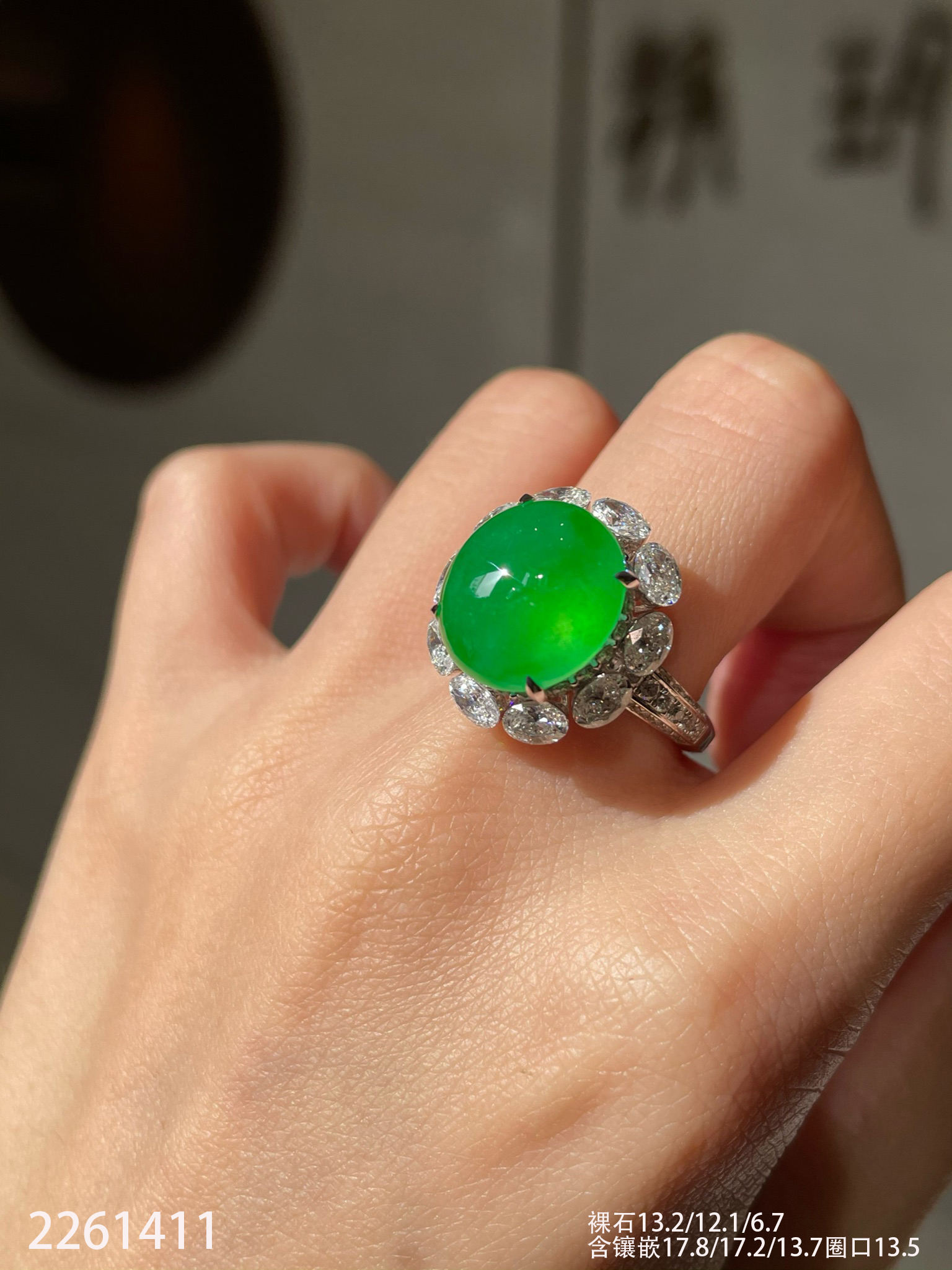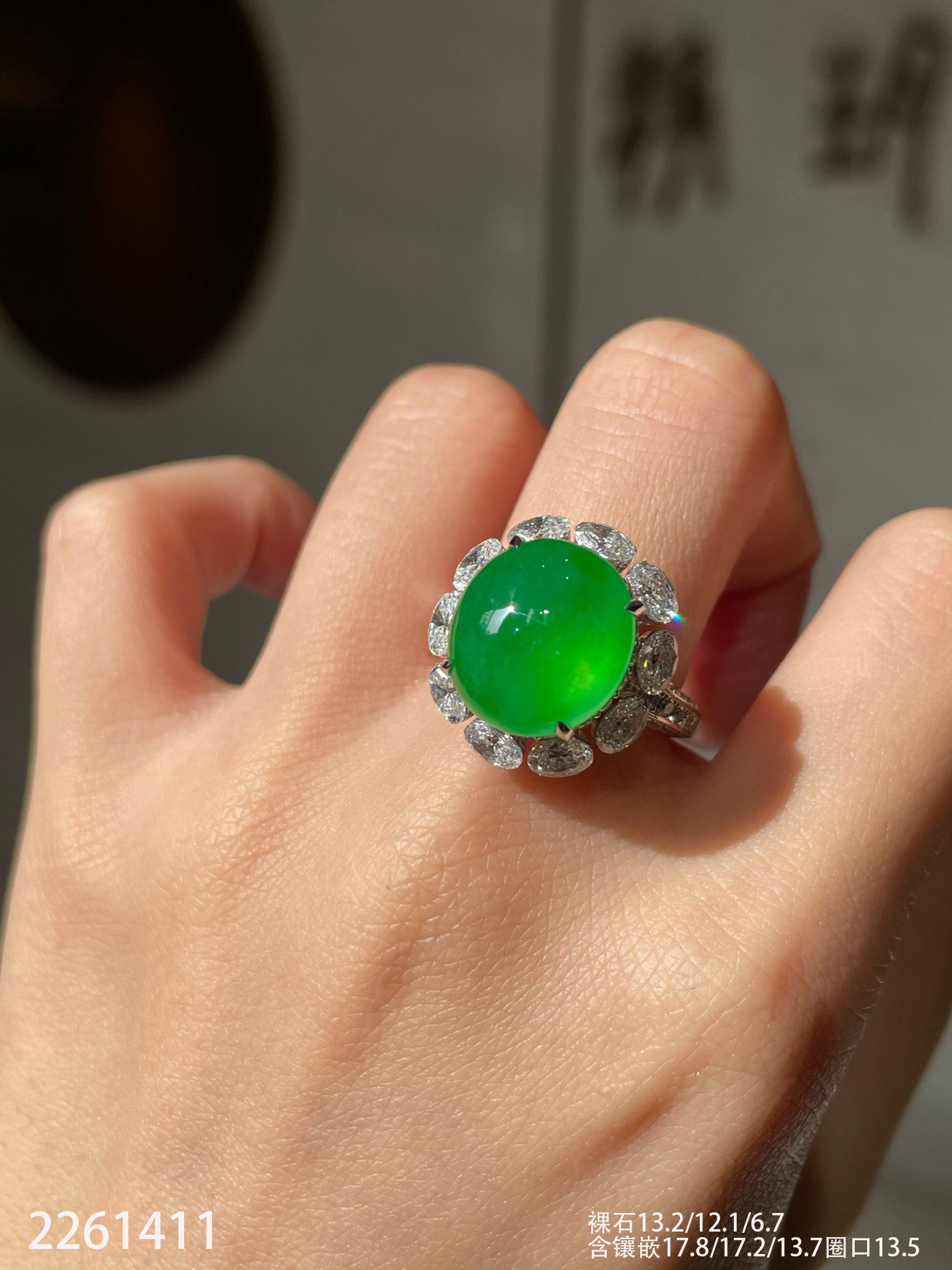2261411,玻璃艳绿蛋面戒指。具体价格微信咨询
