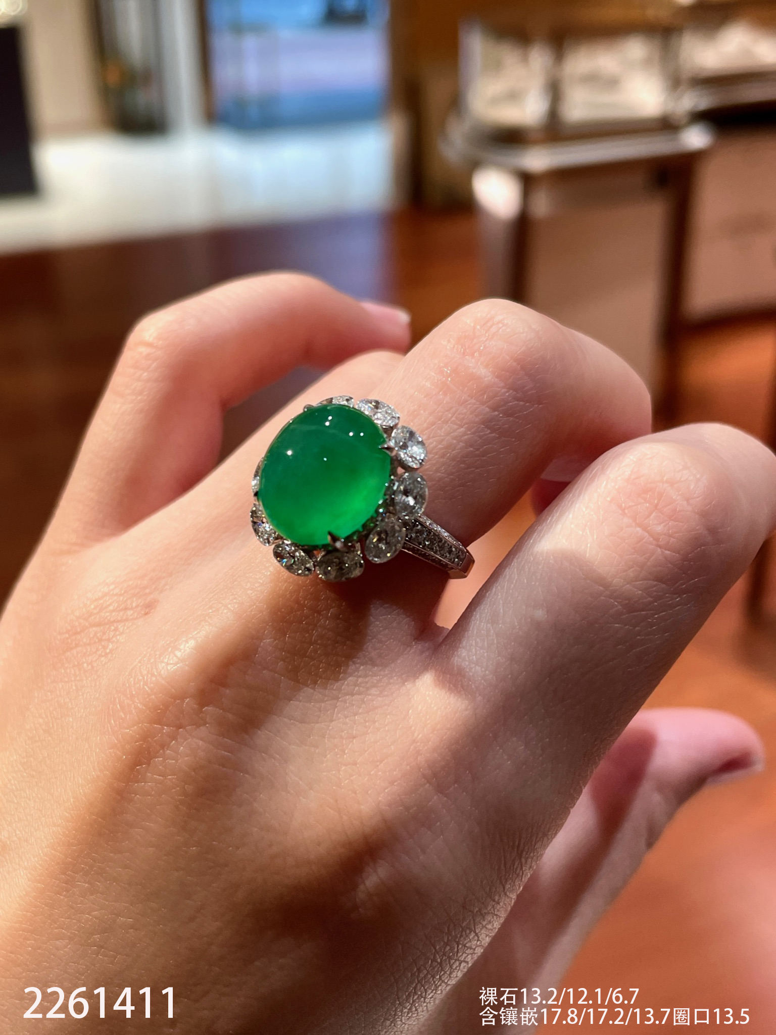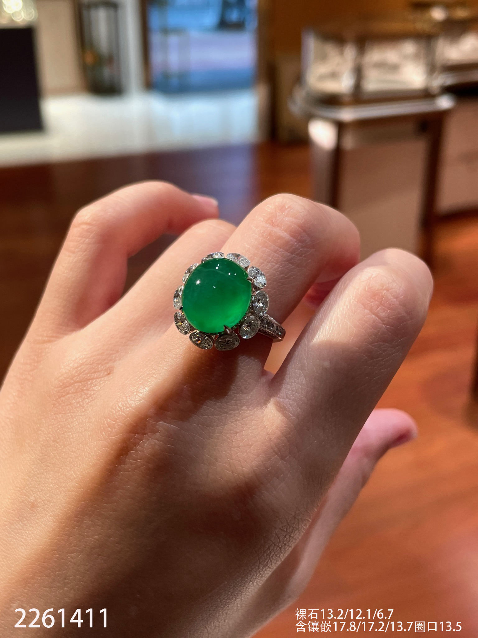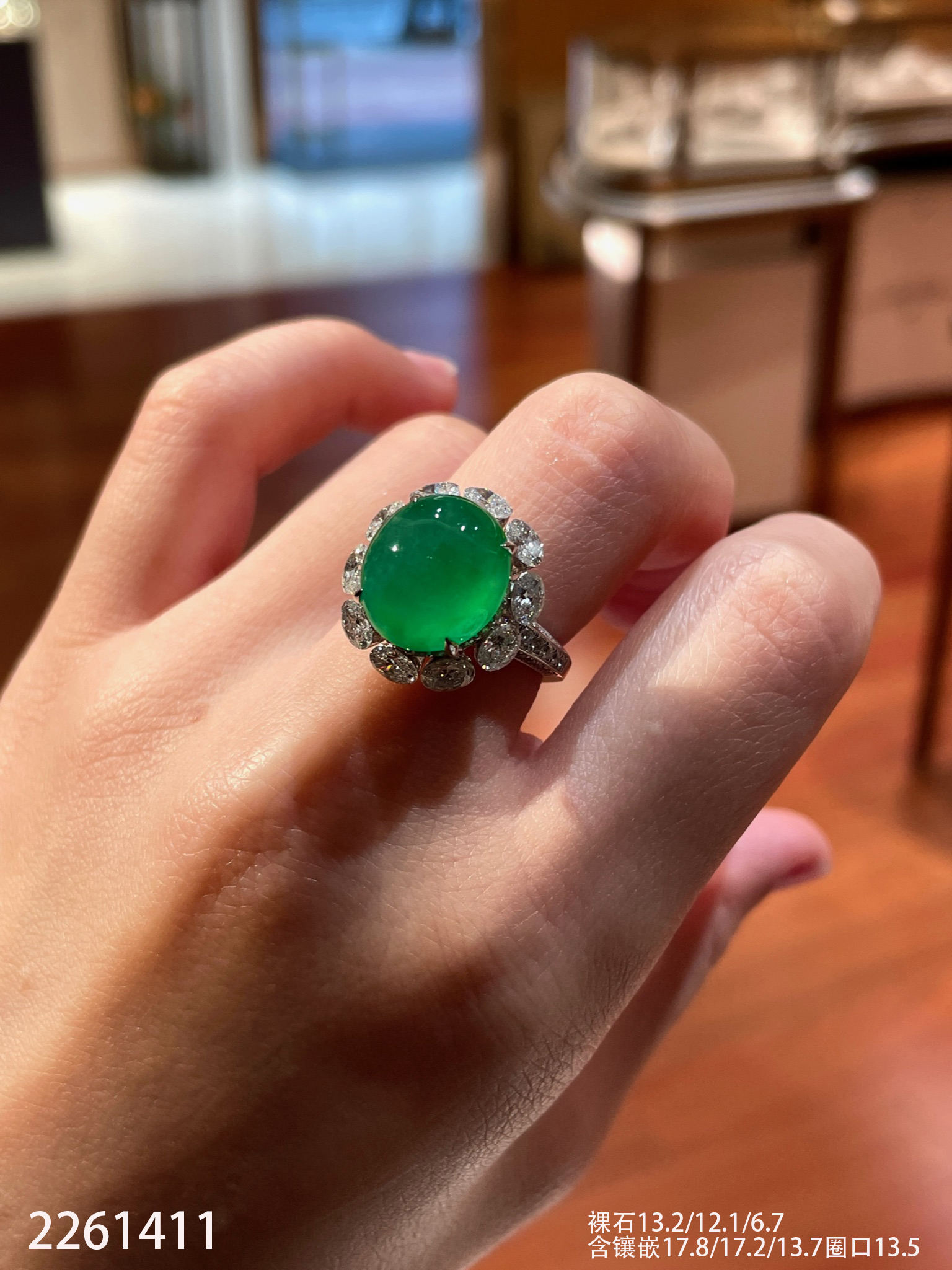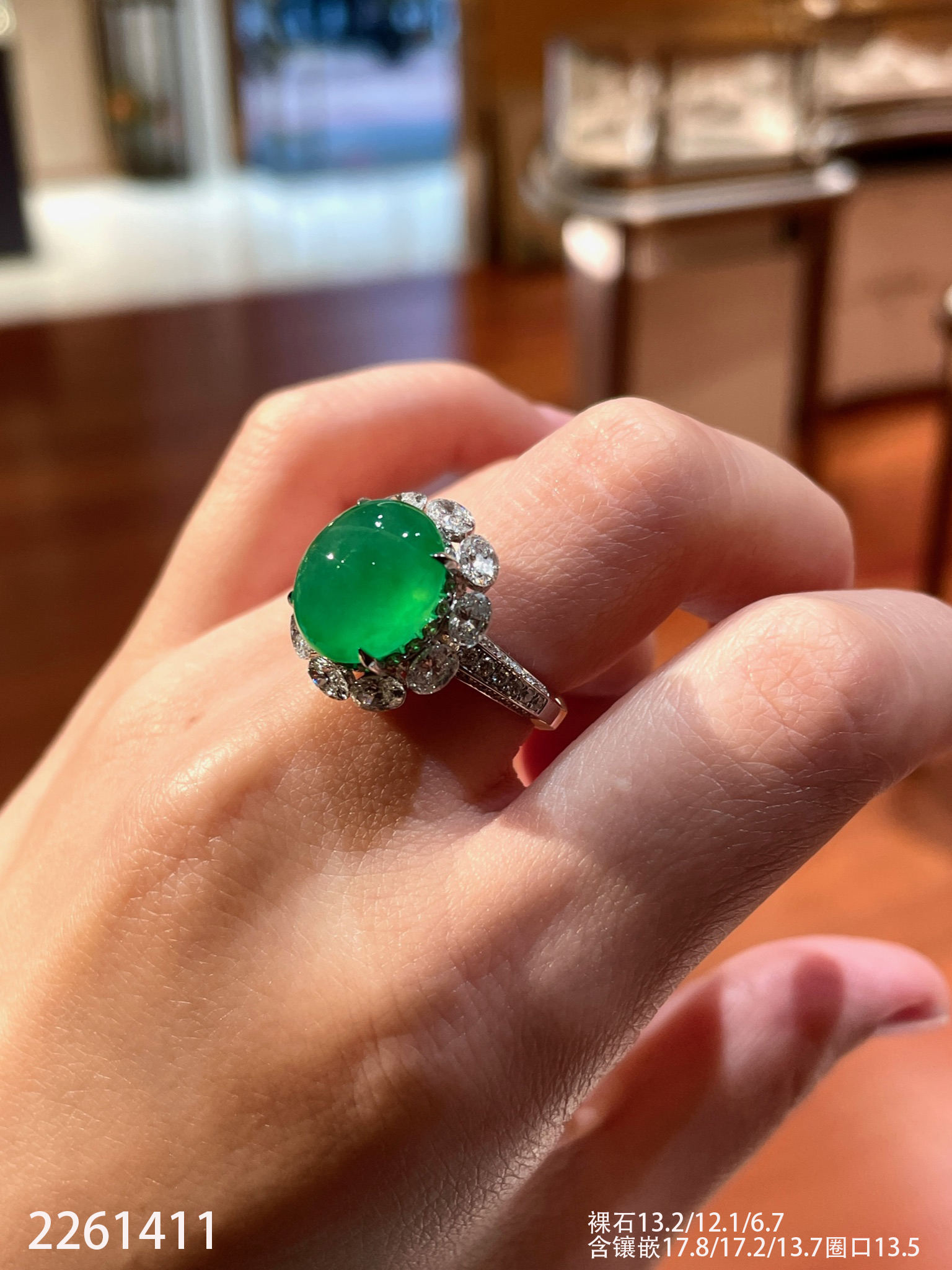 2261411,玻璃艳绿蛋面戒指。具体价格微信咨询