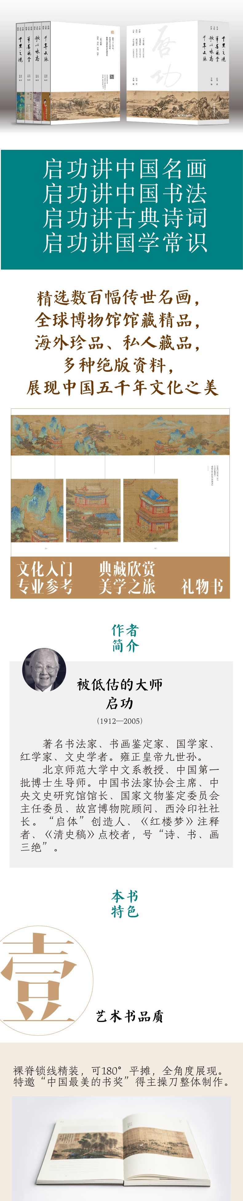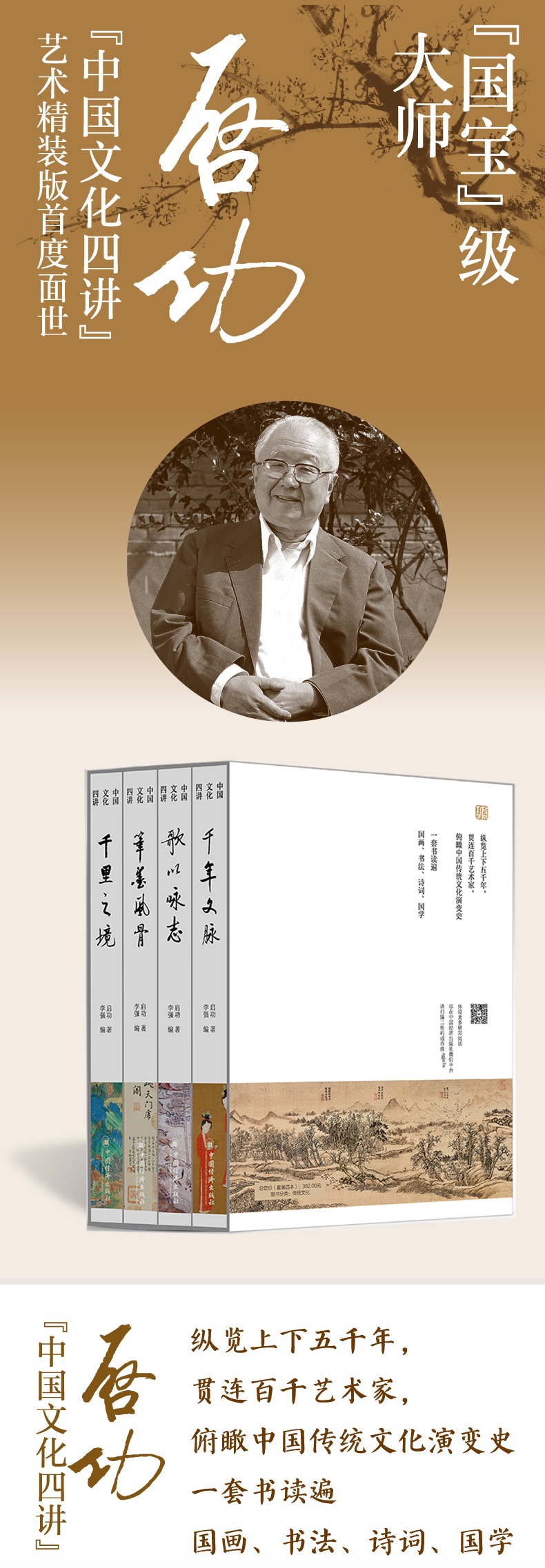 书画家、国学家、中国书协会长、国家文物局鉴定组组长、故宫博物院顾问、北师大博导启功先生“中国文化四讲”,一套书读遍绘画、书法、诗词、国学。《千里之境》——启功讲历代书画,*能读懂的中国画入门书。《笔墨风骨》——启功讲中国书法,*能读懂的书法入门书。《歌以咏志》——启功讲古典诗词,北京师范大学诗词精讲课,把诗意和哲理带进你的生活。《千年文脉》——启功讲国学常识,写给普通人的“猪跑学”讲记,一本书掌握熟悉又陌生的文史知识盲点。