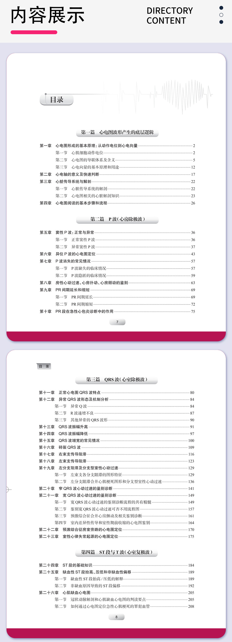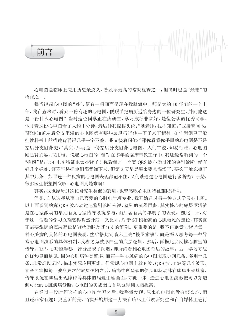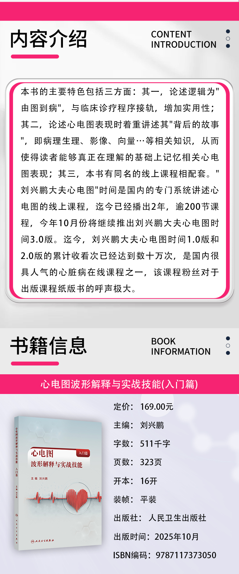 本书的最主要特色包括三方面:其一,论述逻辑为"由图到病",与临床诊疗程序接轨,增加实用性;其二,论述心电图表现时着重讲述其"背后的故事",即病理生理、影像、向量…等相关知识,从而使得读者能够真正在理解的基础上记忆相关心电图表现;其三,本书有同名的线上课程相配套。"刘兴鹏大夫心电图"时间是国内**款专门系统讲述心电图的线上课程,迄今已经播出2年,逾200节课程,今年10月份将继续推出刘兴鹏大夫心电图时间3.0版。迄今,刘兴鹏大夫心电图时间1.0版和2.0版的累计收看次已经达到数十万次,是国内最具人气的心脏病在线课程之一,该课程粉丝对于出版课程纸版书的呼声极大。