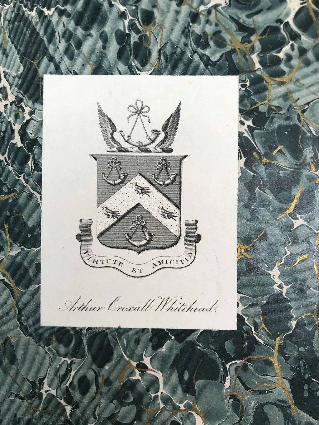 卷首藏书票属于典型的纹章式藏书票,署名为Arthur Croxall Whitehead。主体为盾形结构,头徽由号角和展开的双翼组成,盾形结构中融入缎带的设计,增加了雅致的趣味。盾形中央三只无足的小鸟,在英国纹章学里称为martlet(雨燕式纹章鸟),它们的原型是一种神话中的鸟,它没有脚,从出生到死亡坠落,从未栖息过;燕子被认为终日翱翔。这种状态象征着持续不断的努力。最下面的拉丁文VIRTUTE ET AMICITIA可以翻译为“以德与友谊”。