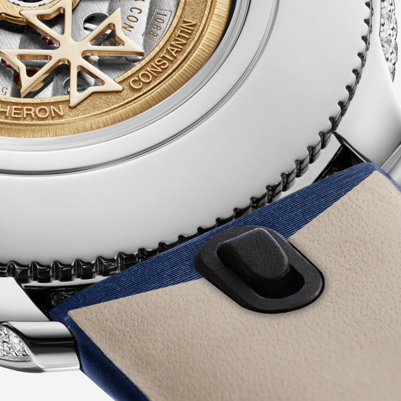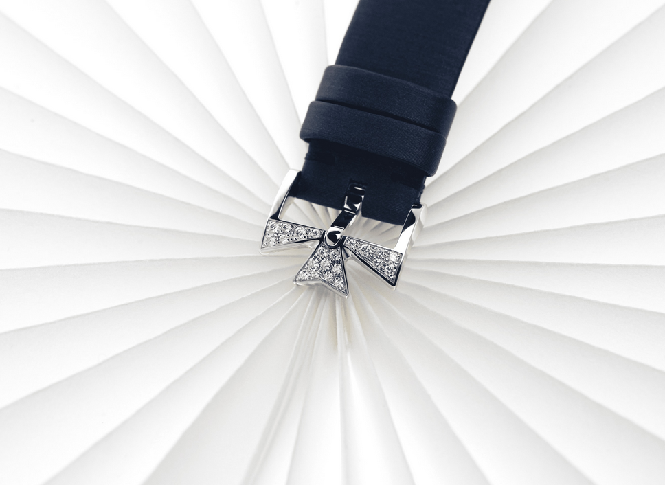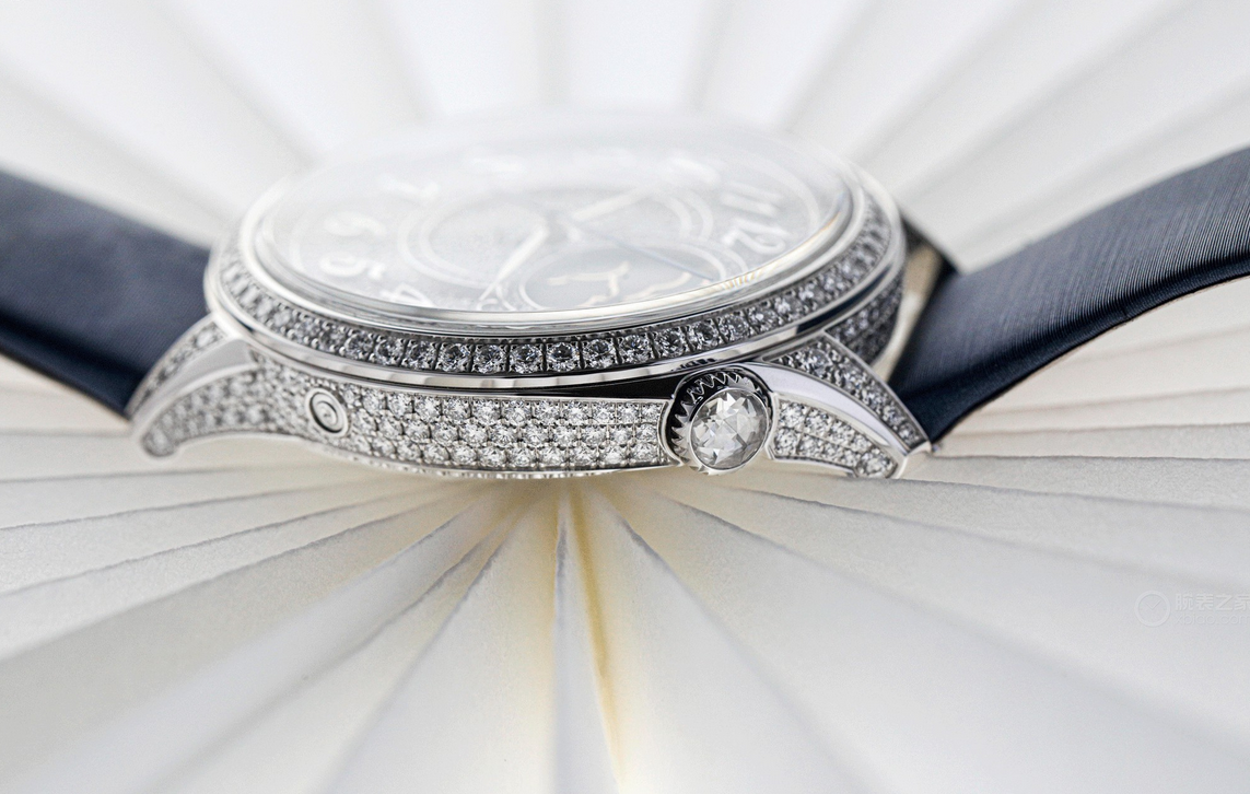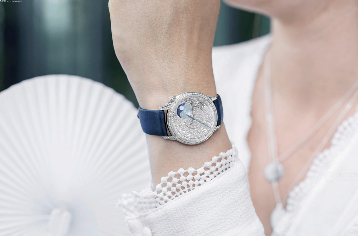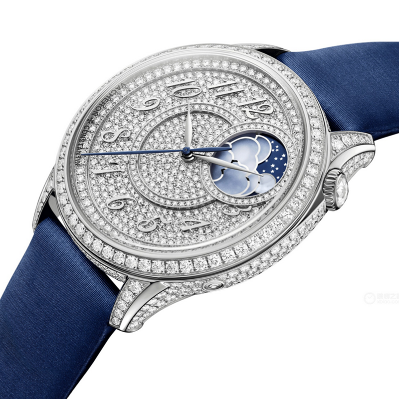 镜面材质 | 蓝宝石水晶玻璃 | 表盘 | 18K白金表壳 镶嵌845颗钻石,璀璨生辉。月相显示设于1点和2点位之间,两个珍珠贝母月亮在蓝宝石水晶云海后轮番显现 背透,透明蓝宝石水晶表底盖 |