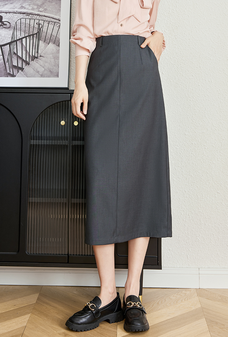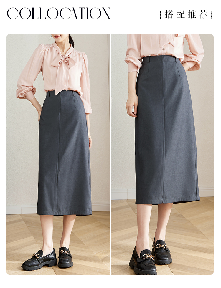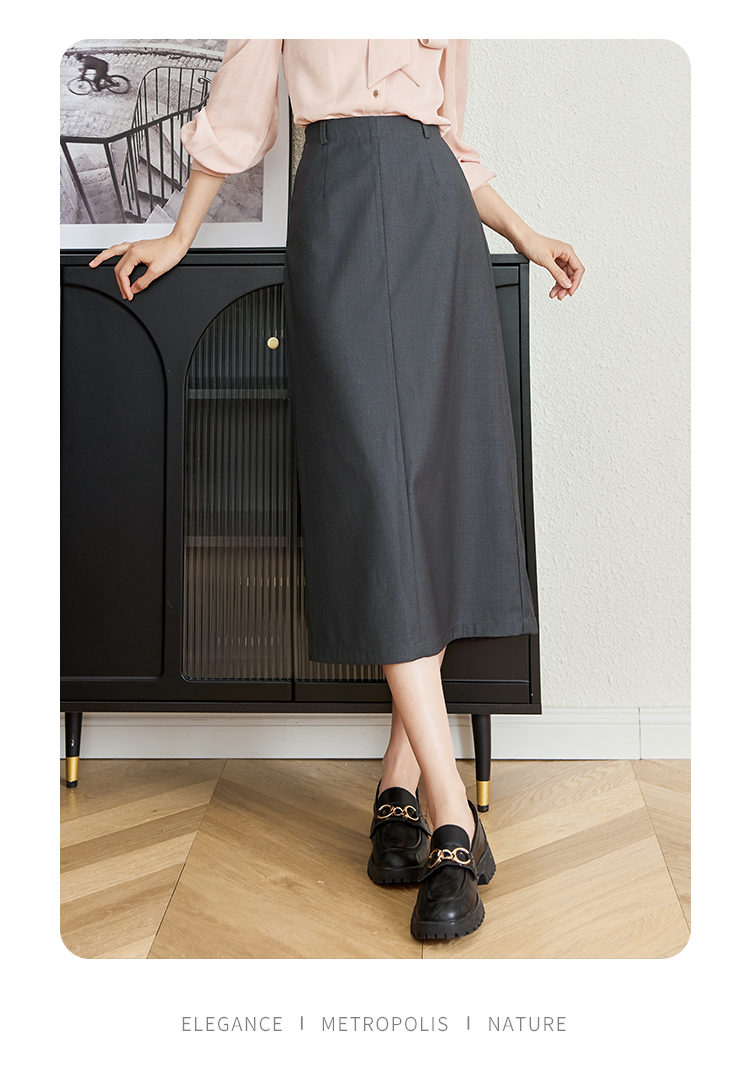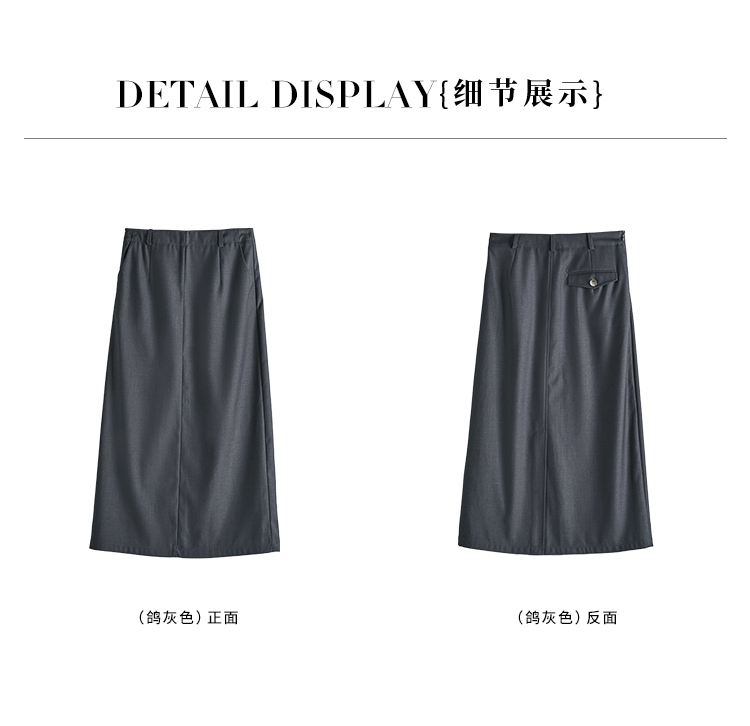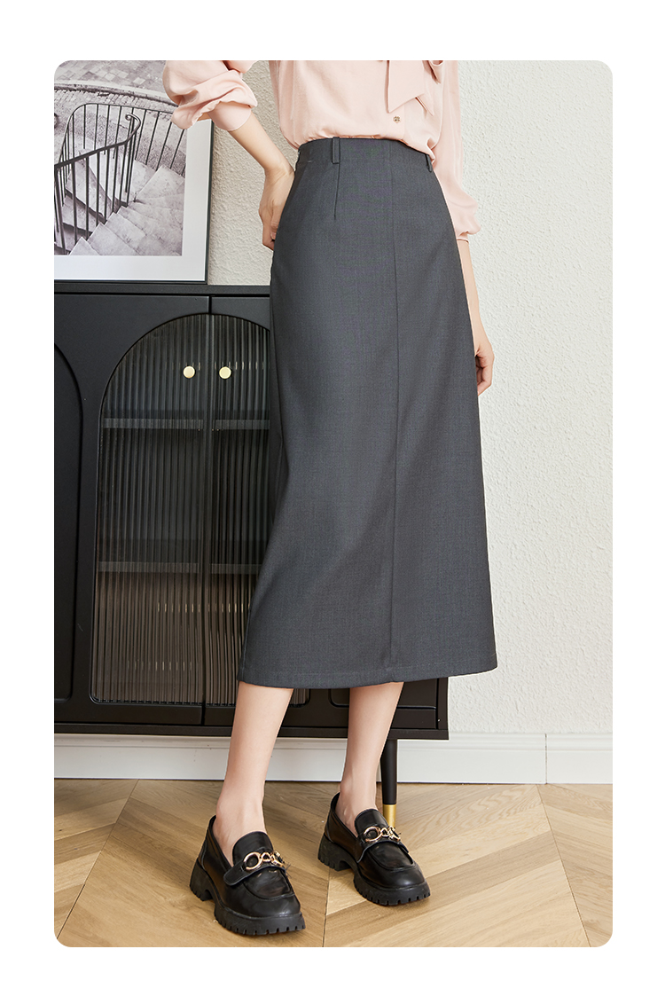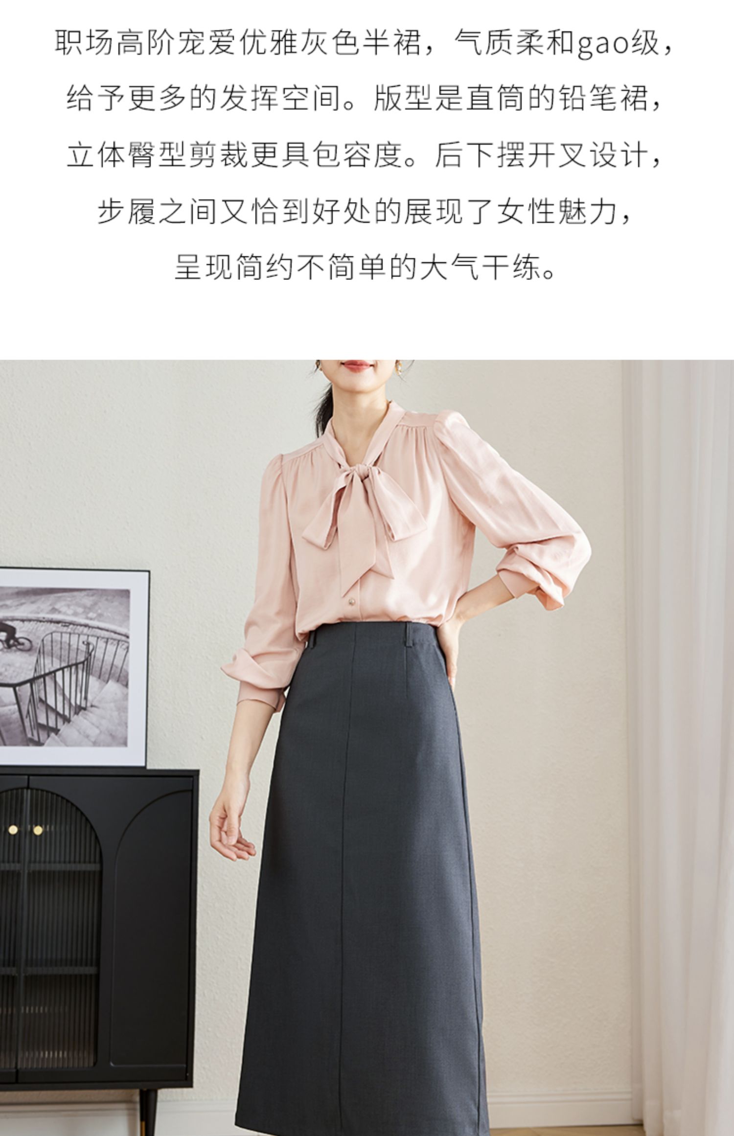 【专属特价】熙世界复古灰色中长款西装半身裙女秋新款通勤职场开叉直筒包臀裙