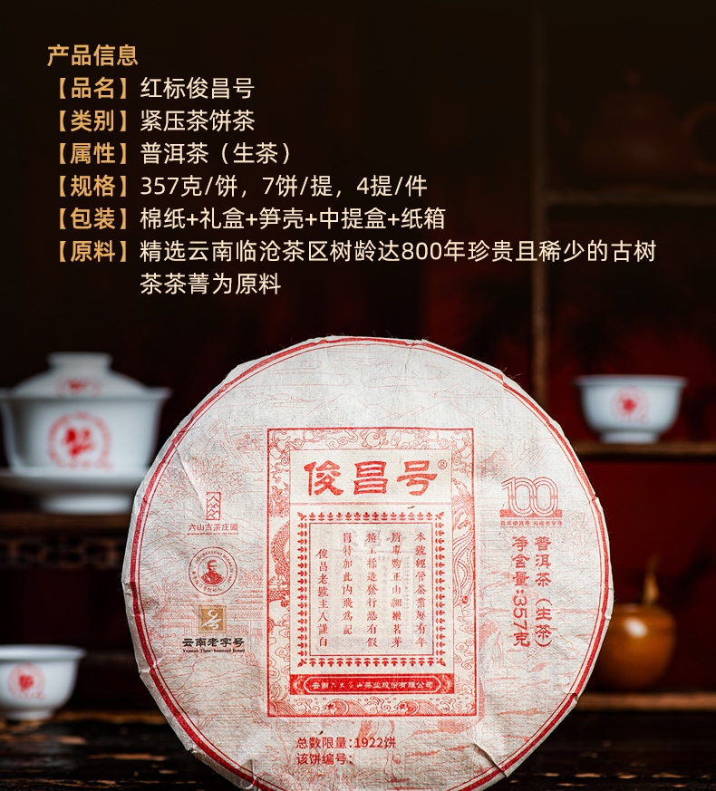 【红标俊昌号】 云南普洱茶生茶 七子饼茶古树春茶 7饼/提