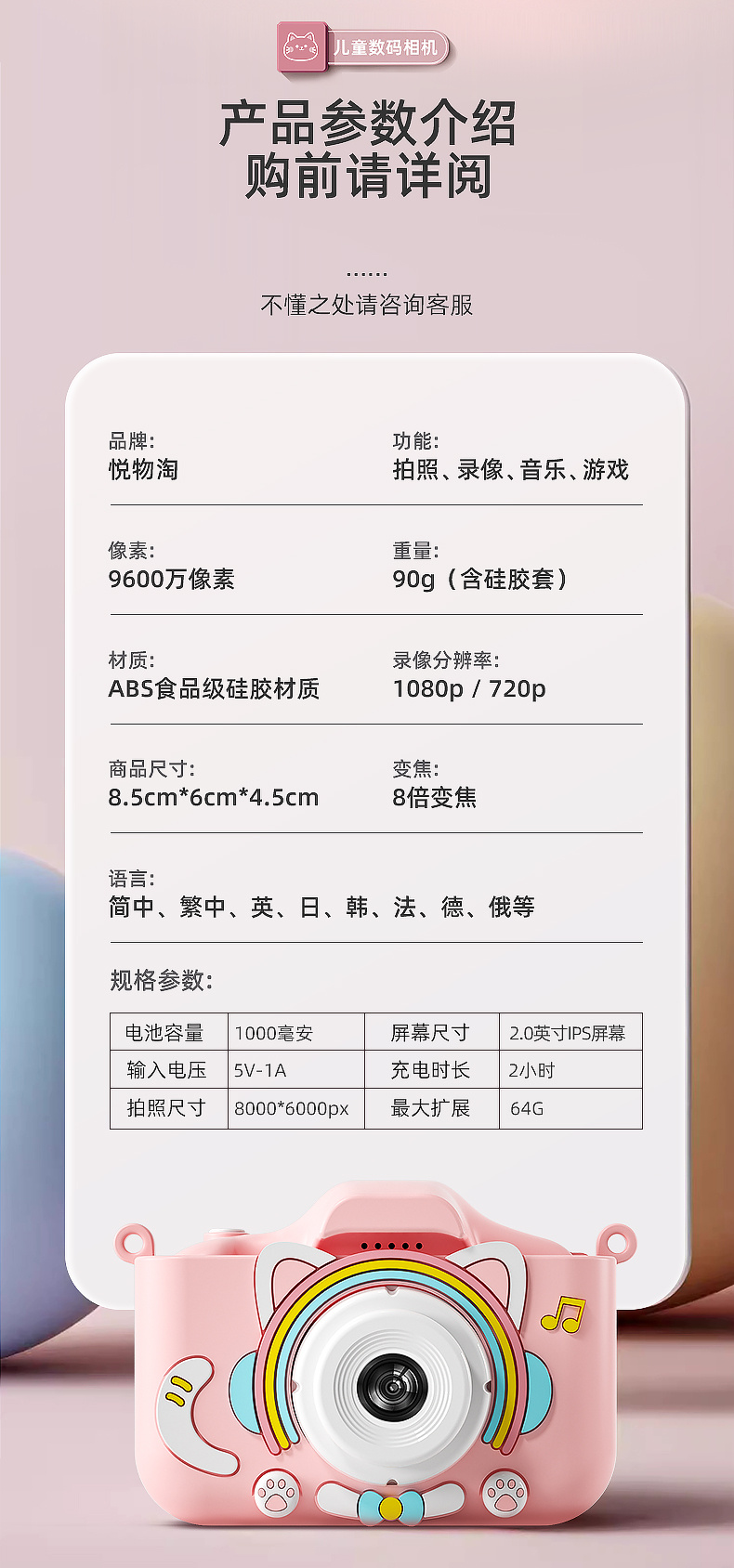📷4800W像素前后摄像头,拍照自拍录像都很清晰~ 📷IPS护眼屏保护眼睛~ 📷环保安全亲肤材质 📷自带内寸支持无卡拍照50张,另可64G TF内存卡扩展~插入内存卡照片才可以导出来 📷自带大头贴、滤镜和特效~ 📷内置五款卡通游戏可以玩耍~ 📷插卡还能音乐播放
