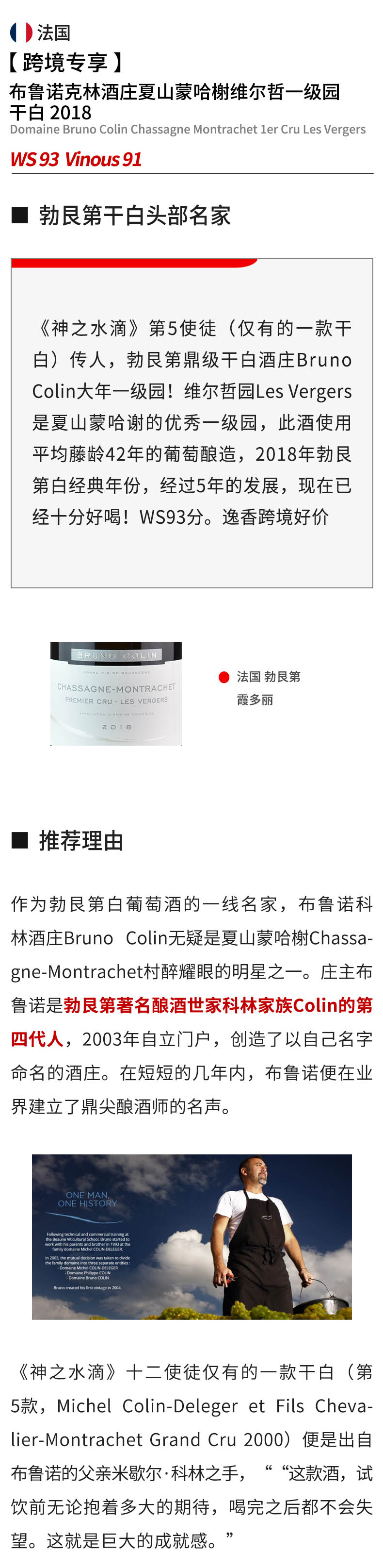 【跨境现货好价】布鲁诺科林酒庄夏山蒙哈榭一级园维尔哲干白2018