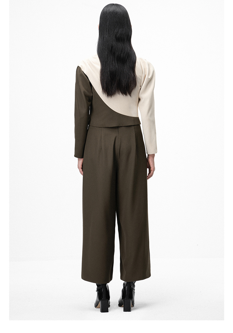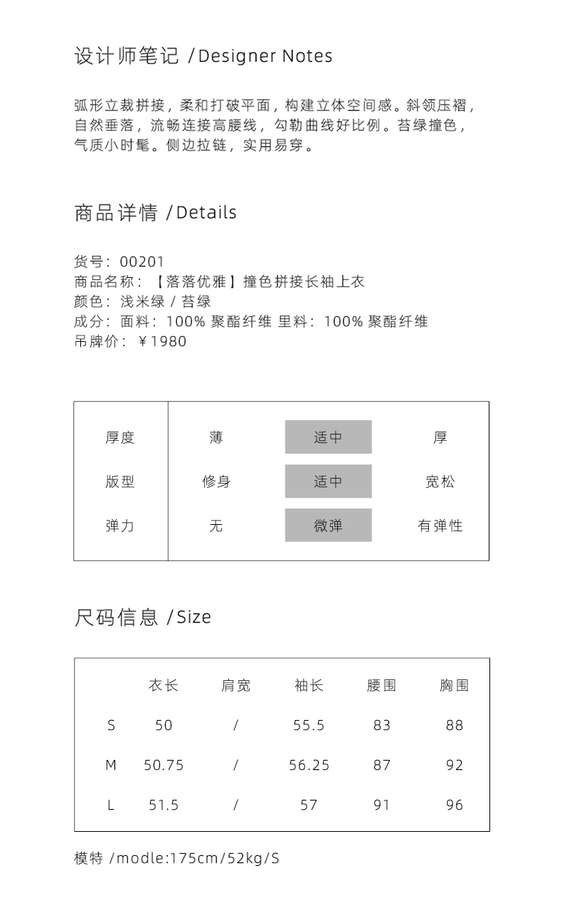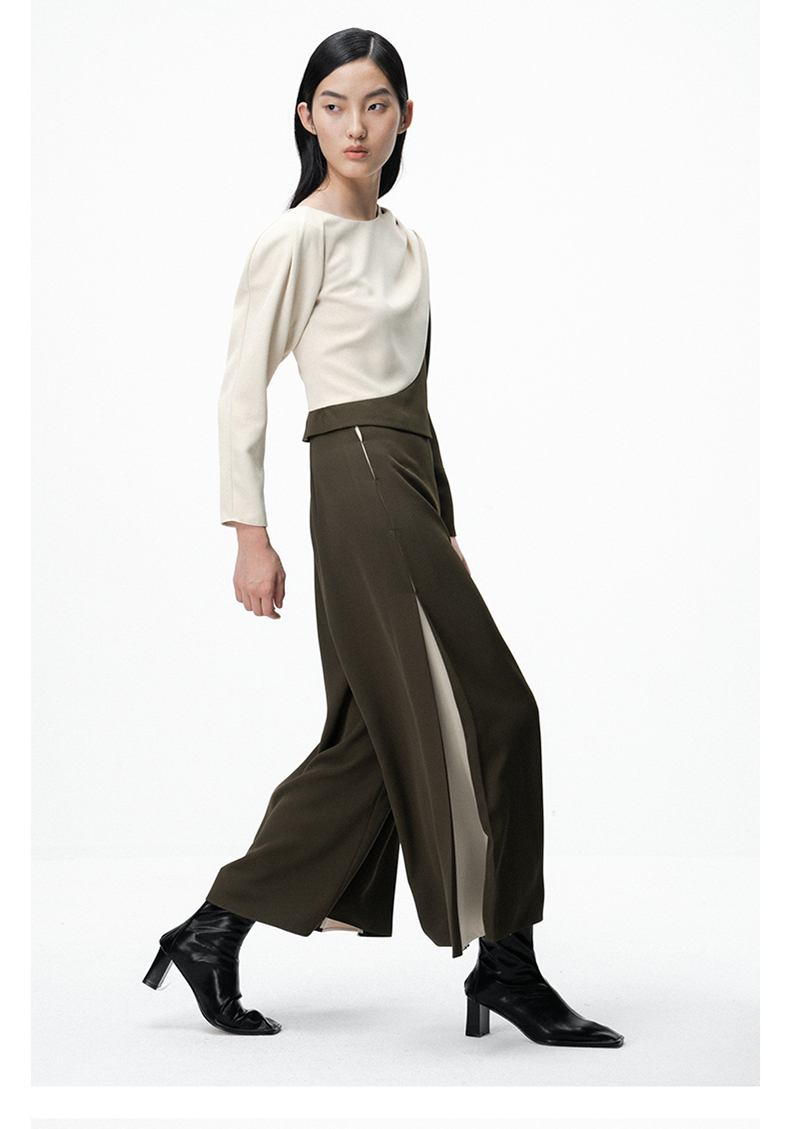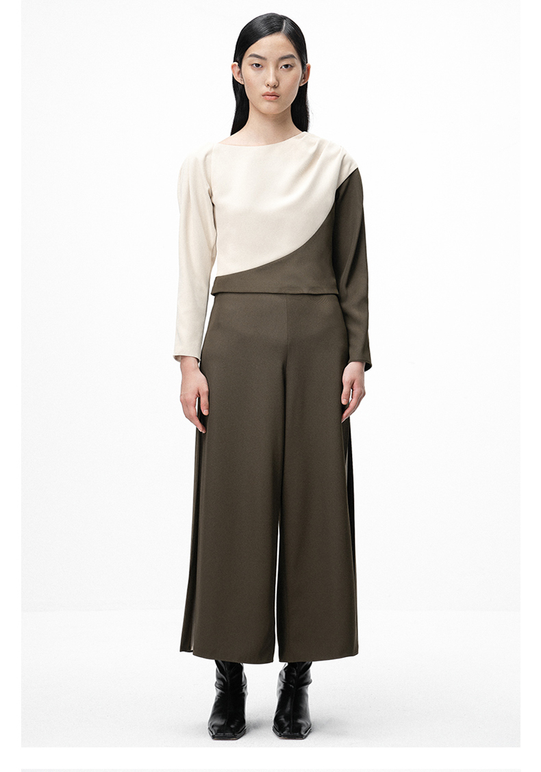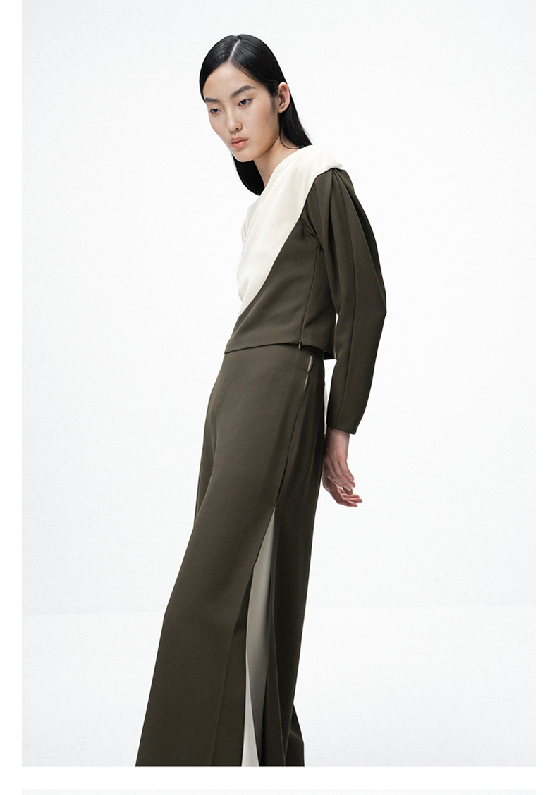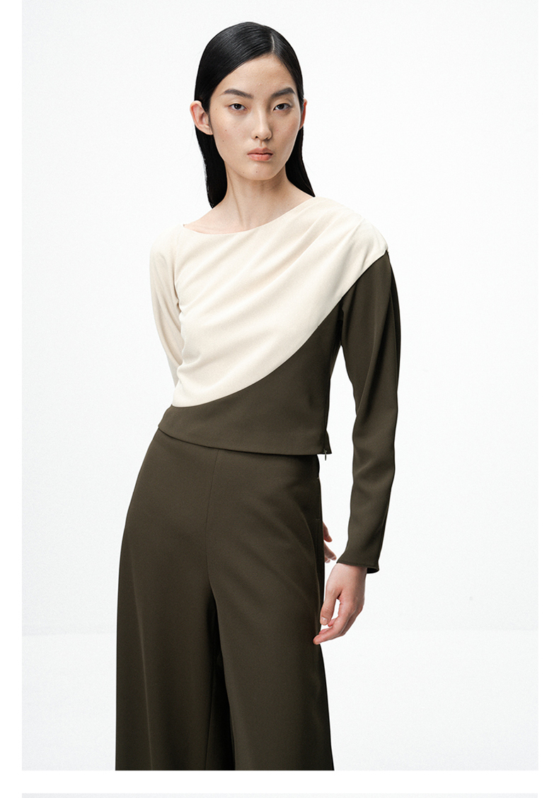 【落落优雅】肩部压褶苔绿撞色拼接长袖上衣/00201