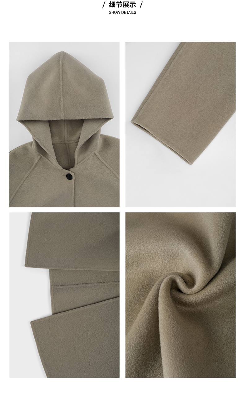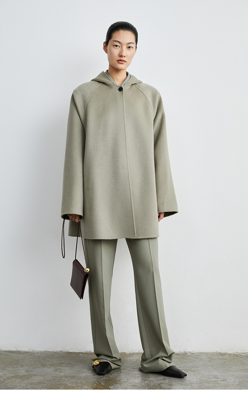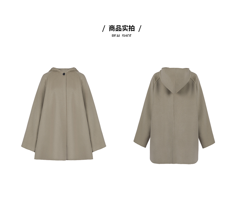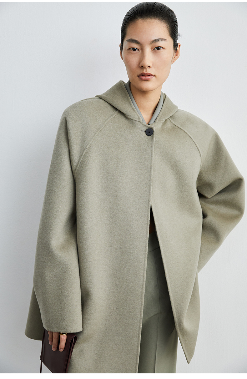HIDEMI 燕麦色美利奴羊毛双面呢简约设计感一粒扣连帽大衣