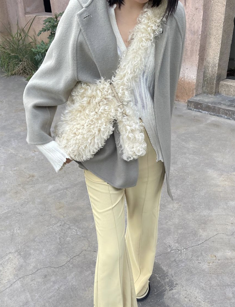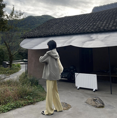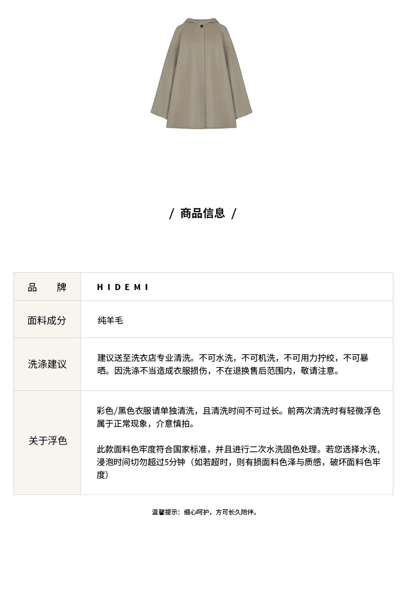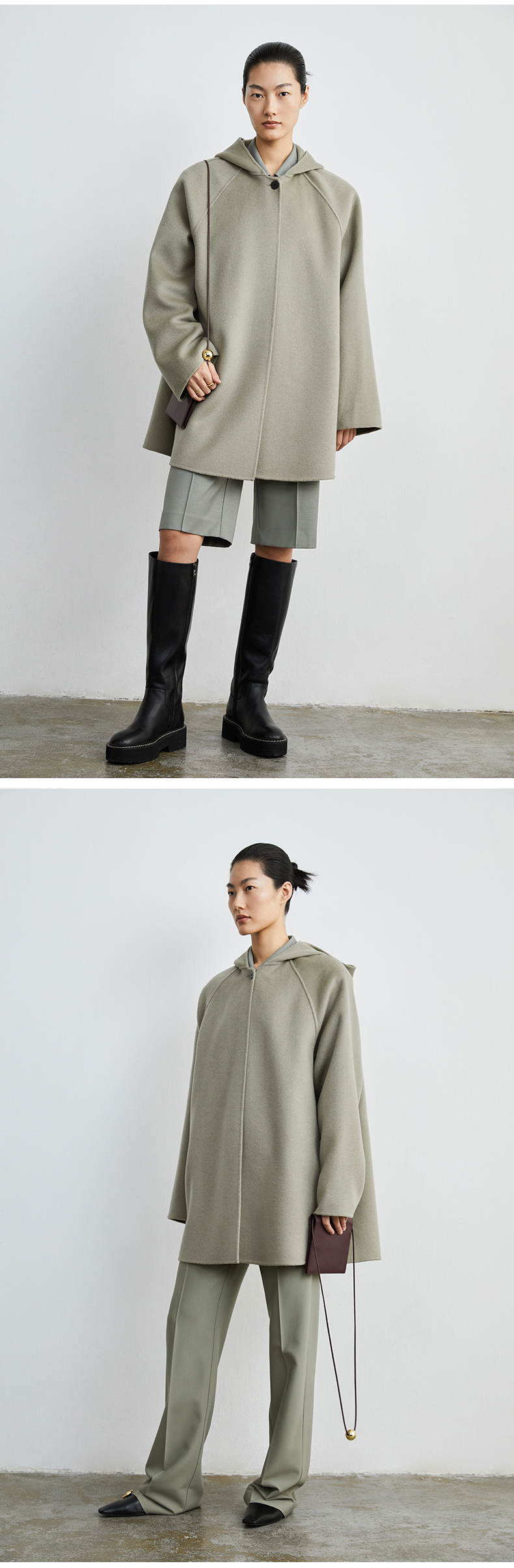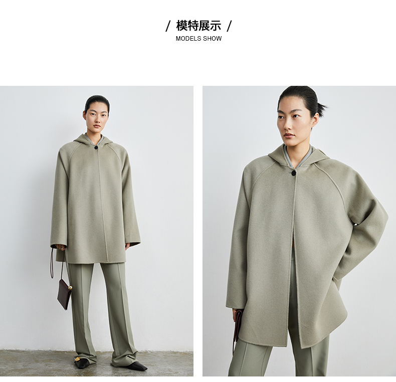 HIDEMI 燕麦色美利奴羊毛双面呢简约设计感一粒扣连帽大衣