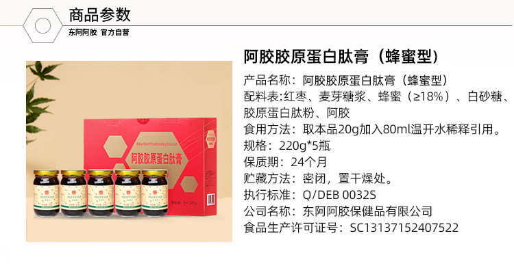 【积分兑换】阿胶胶原蛋白肽膏(蜂蜜型)220g*5瓶/盒