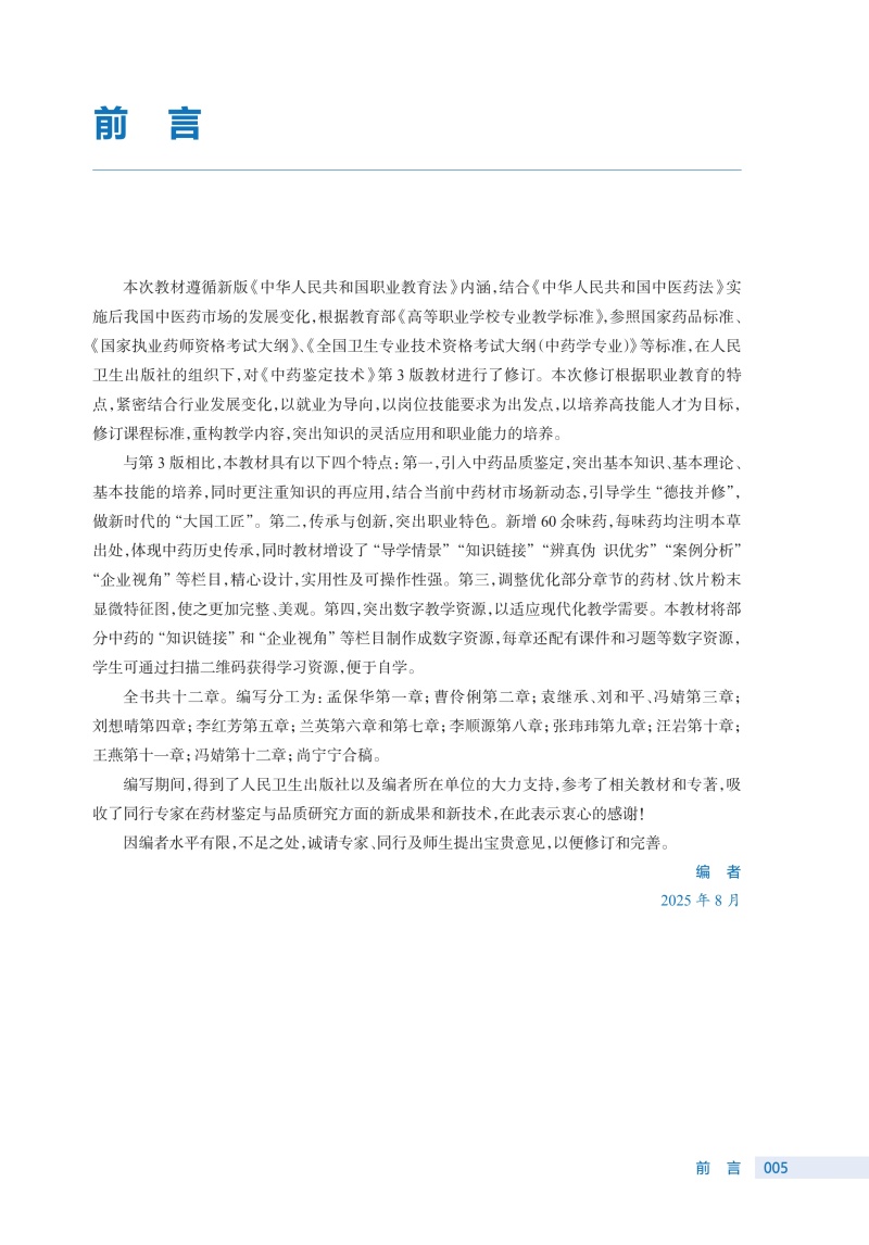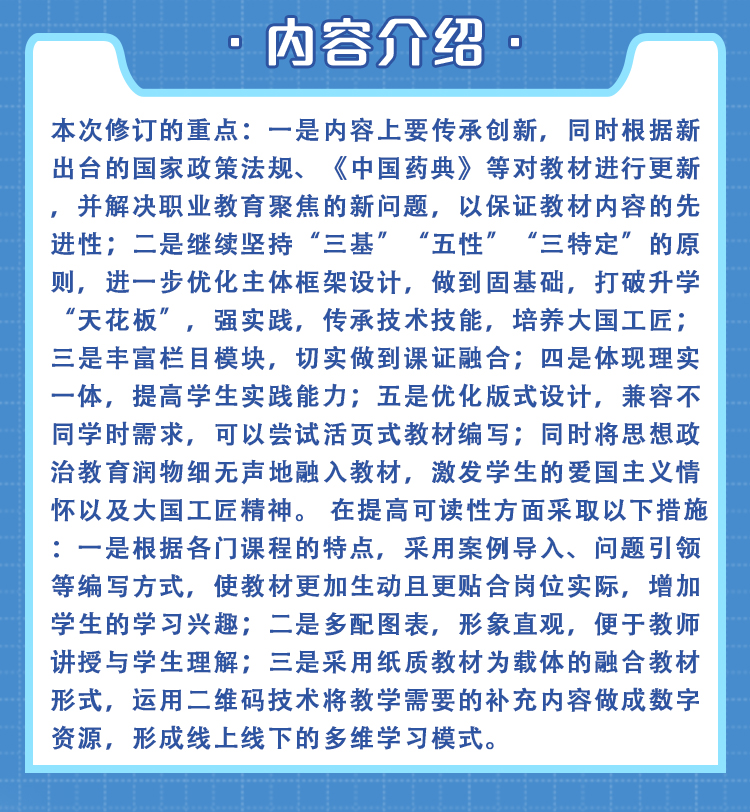 本次修订的重点:一是内容上要传承创新,同时根据新出台的国家政策法规、《中国药典》等对教材进行更新,并解决职业教育聚焦的新问题,以保证教材内容的先进性;二是继续坚持“三基”“五性”“三特定”的原则,进一步优化主体框架设计,做到固基础,打破升学“天花板”,强实践,传承技术技能,培养大国工匠;三是丰富栏目模块,切实做到课证融合;四是体现理实一体,提高学生实践能力;五是优化版式设计,兼容不同学时需求,可以尝试活页式教材编写;同时将思想政治教育润物细无声地融入教材,激发学生的爱国主义情怀以及大国工匠精神。 在提高可读性方面采取以下措施:一是根据各门课程的特点,采用案例导入、问题引领等编写方式,使教材更加生动且更贴合岗位实际,增加学生的学习兴趣;二是多配图表,形象直观,便于教师讲授与学生理解;三是采用纸质教材为载体的融合教材形式,运用二维码技术将教学需要的补充内容做成数字资源,形成线上线下的多维学习模式。