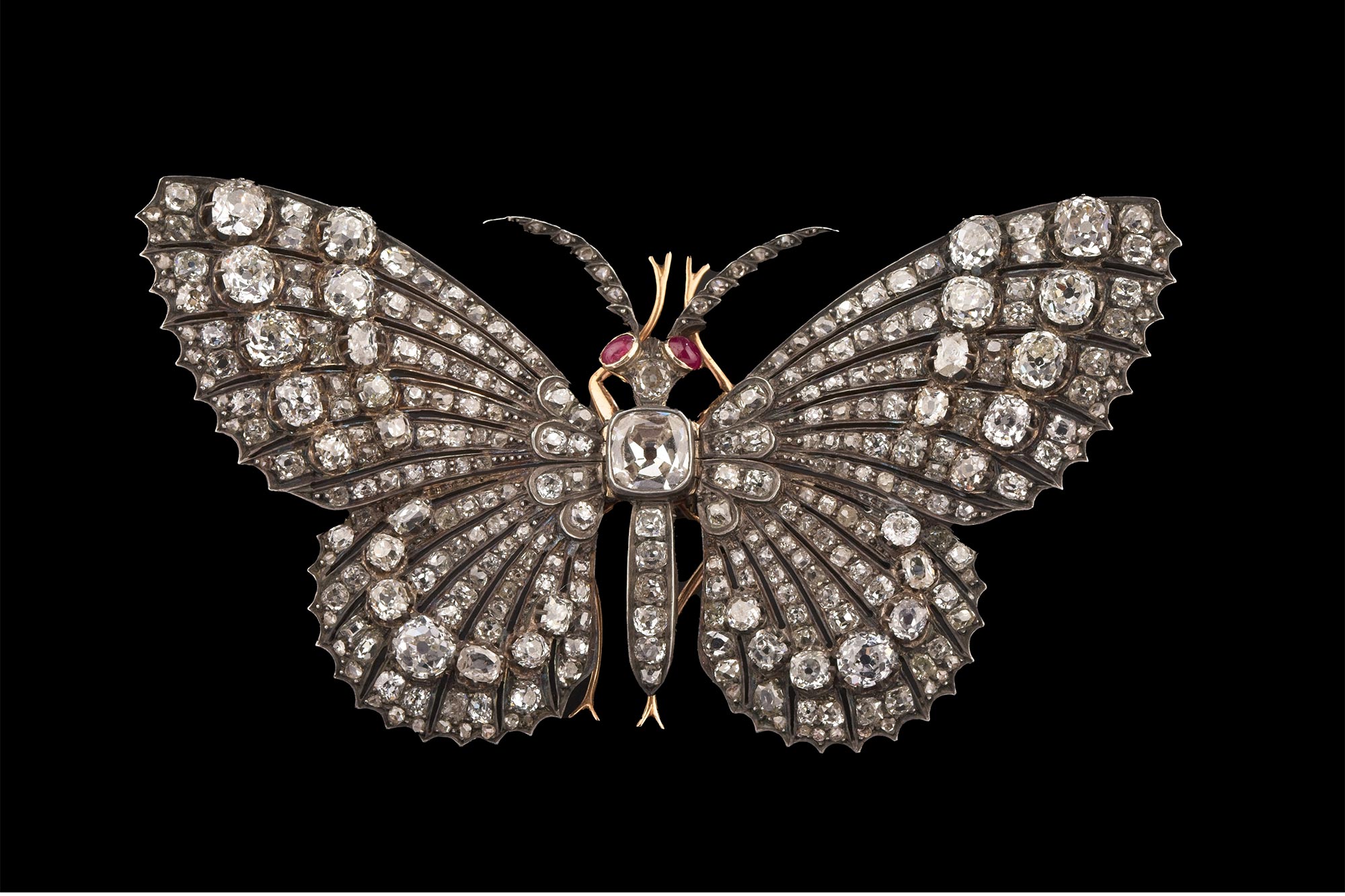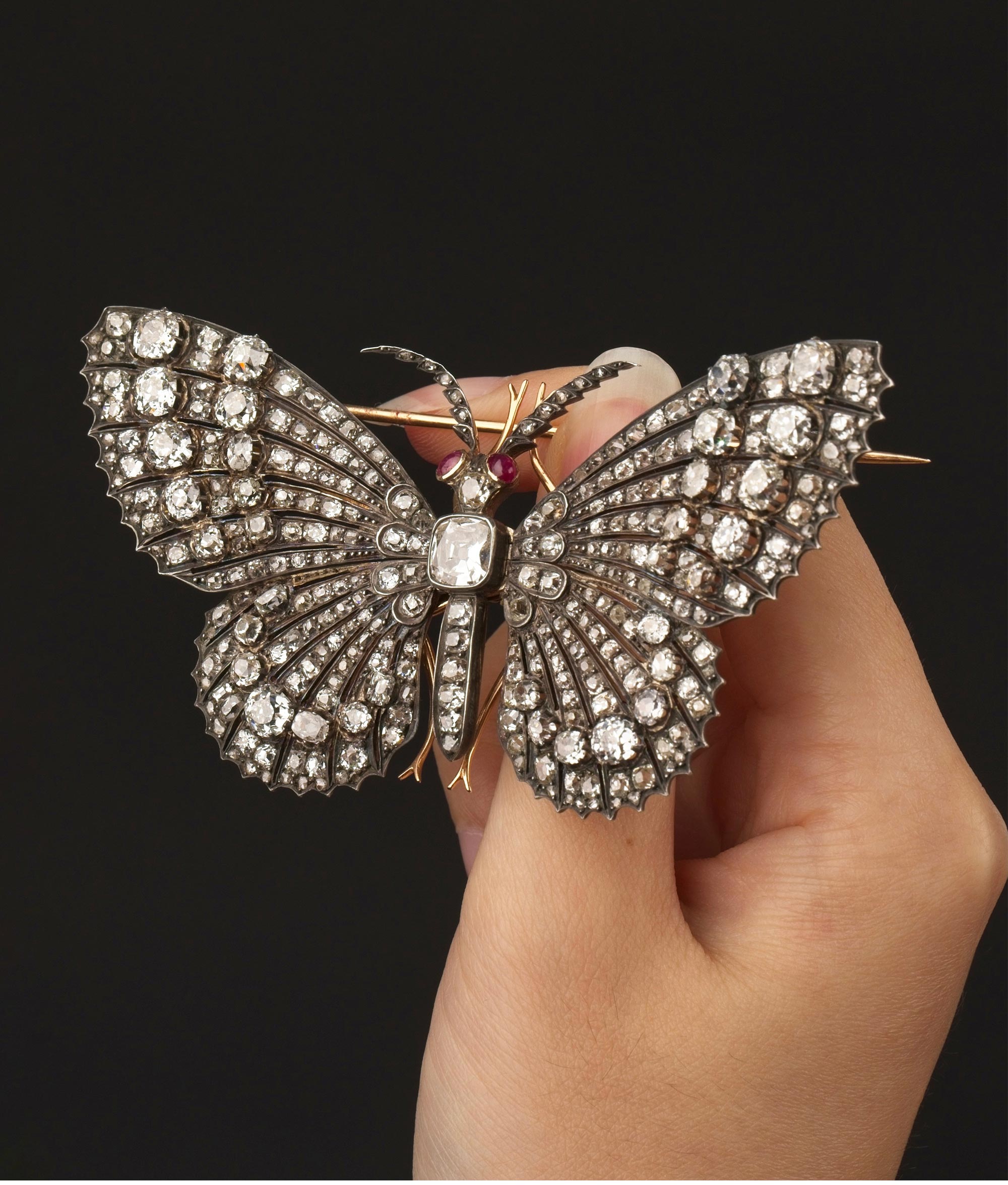 19世纪欧洲出品蝴蝶造型黄金底纯银镶嵌钻石及缅甸无烧红宝石胸针