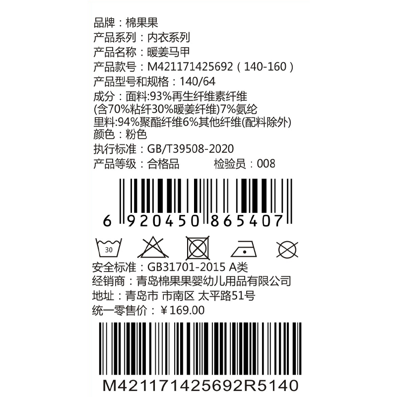 棉果果冬季新品暖姜棉柔软保暖140-160码中大童大码背心暖姜马甲M421171425692