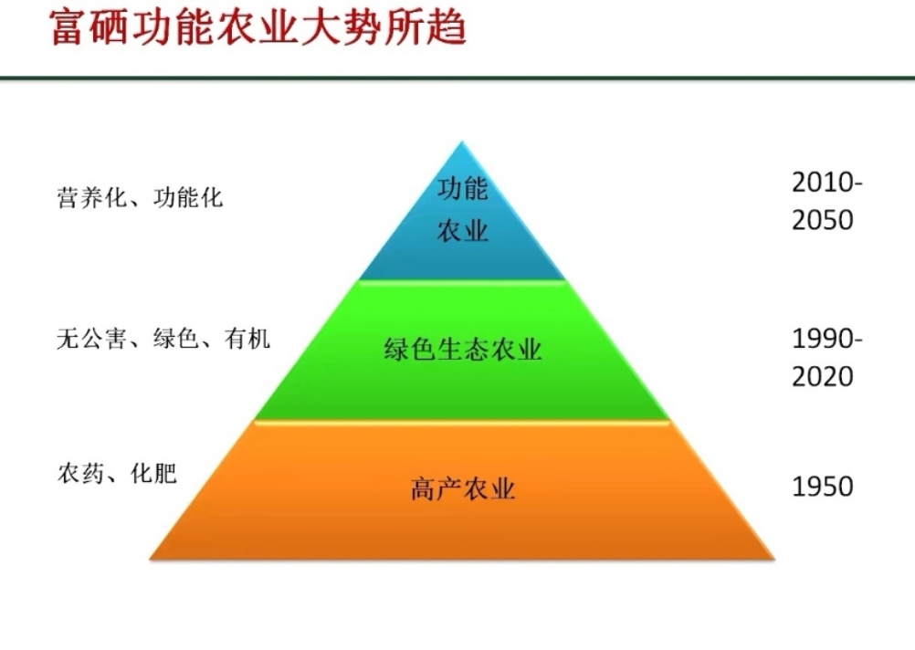我国人民逐渐开始重视自己的身体健康状况,从50年代的吃得饱(使用农药、化肥的高产农业);到90年代的吃得好(无公害、绿色、有机的绿色生态农业);再到如今的吃的健康(营养化、功能化的功能农业)。功能农业是继绿色农业、有机农业之后新兴的产业,即在农业生产中添加了一种或多种对人体健康起决定性作用的元素,如:硒、钙、铁、锌、镁等元素或某种维生素。