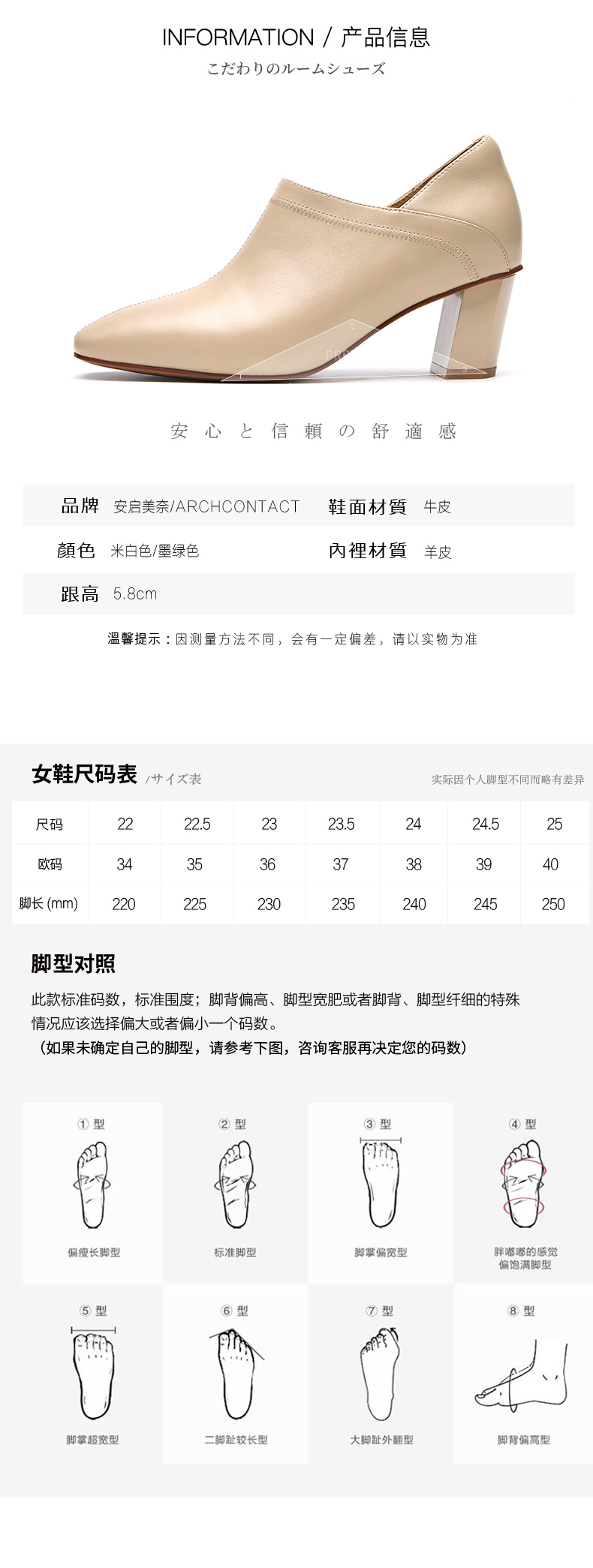 安启美奈ARCHCONTACT尖头经典简约小高跟单鞋52713-1