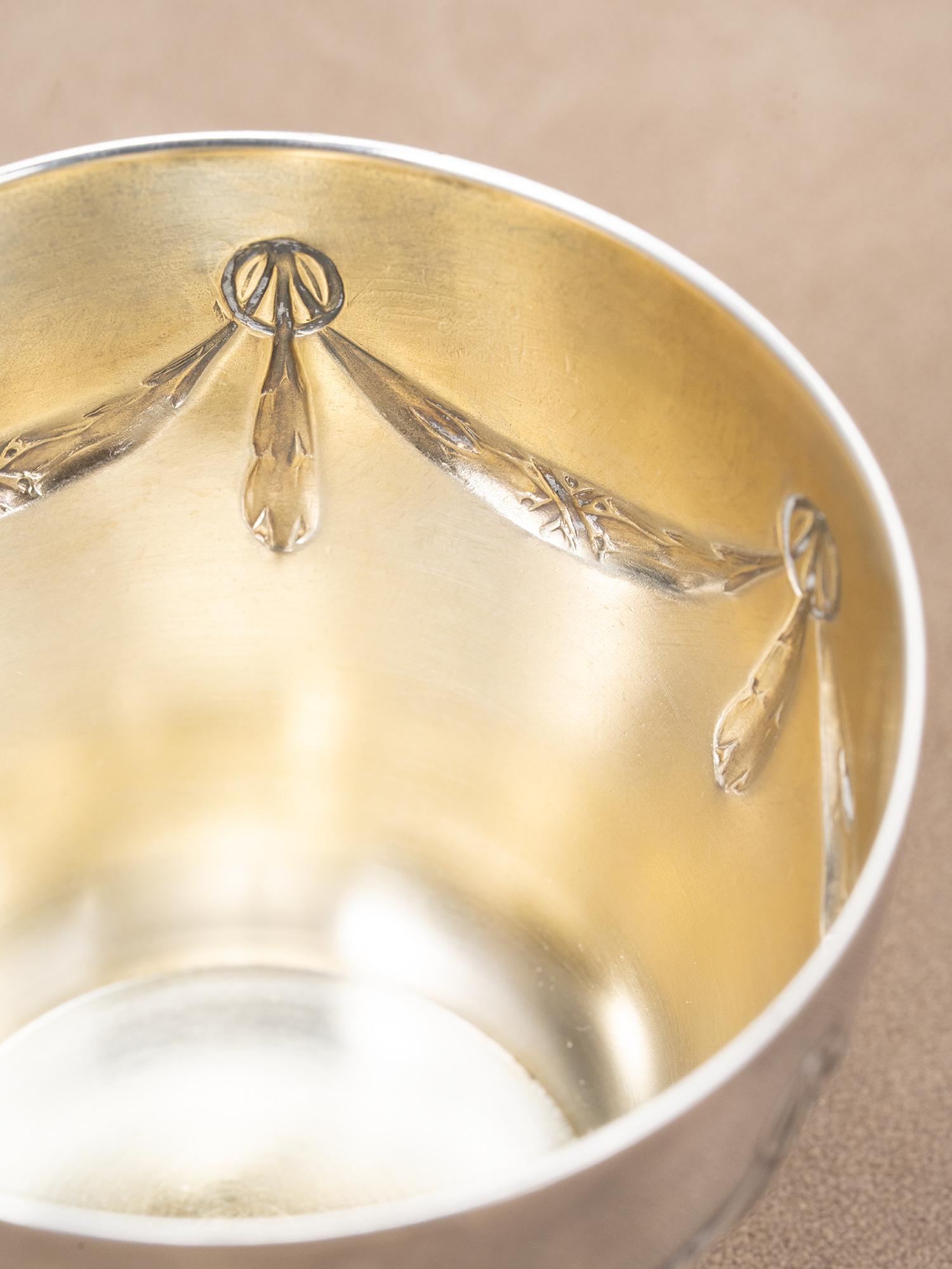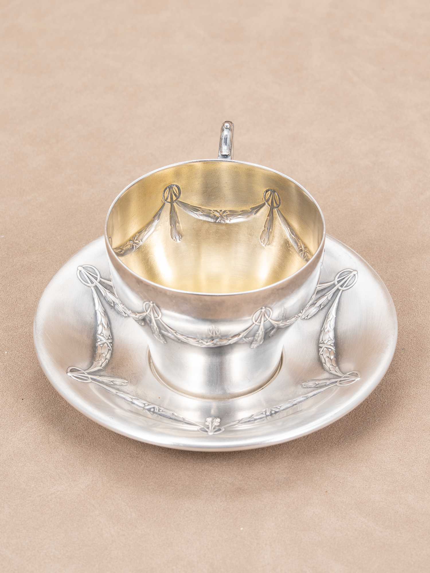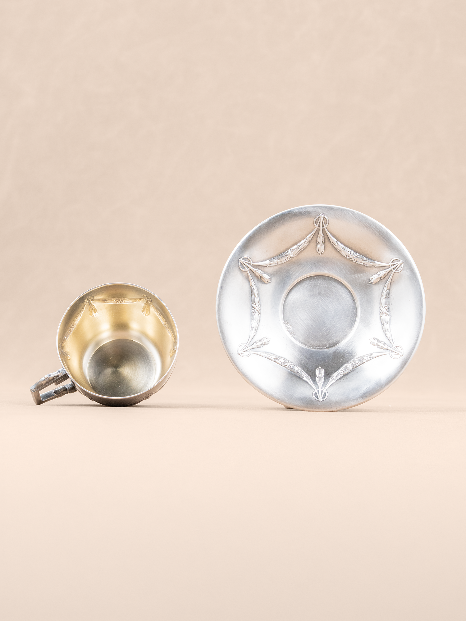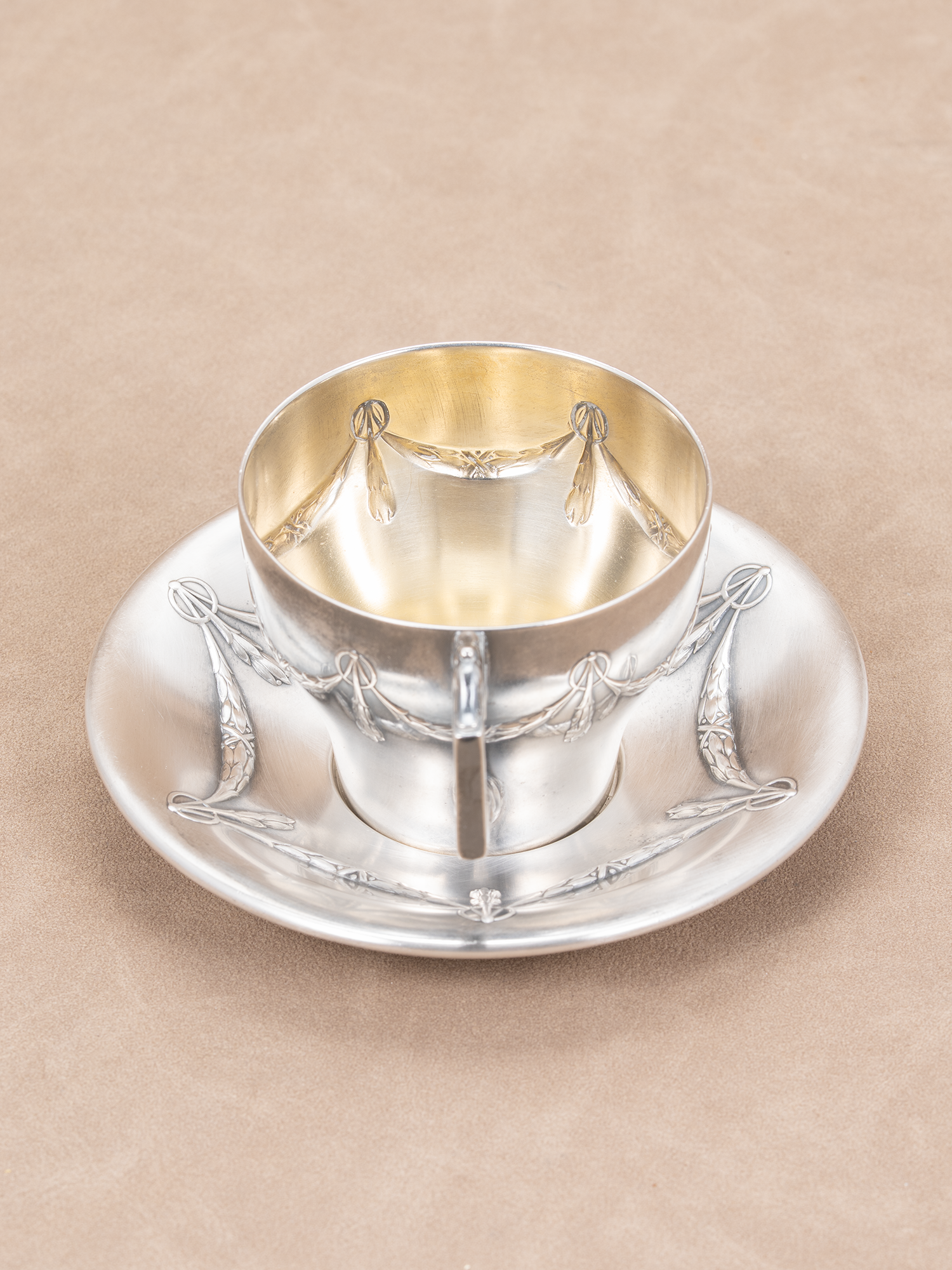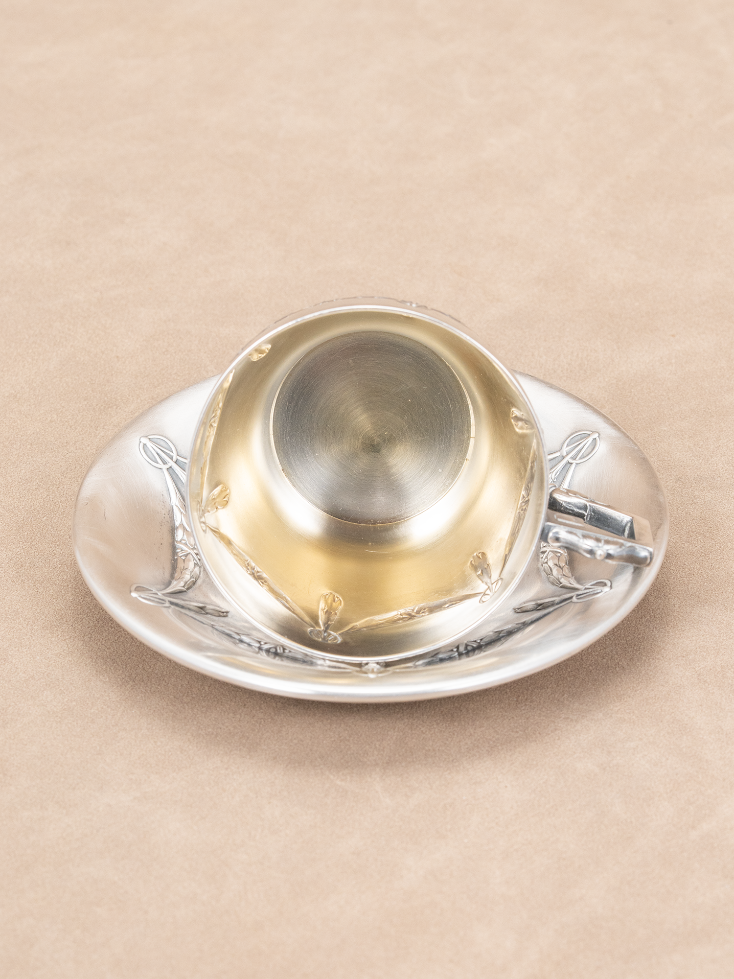 新古典主义的精致:杯碟外表做了镀银,里面做了镀金/鎏金工艺,体现了新古典主义对材质和工艺的重视,通过金属的冷冽光泽与镀金的温暖光泽形成对比,平衡了古典的庄重与奢华。