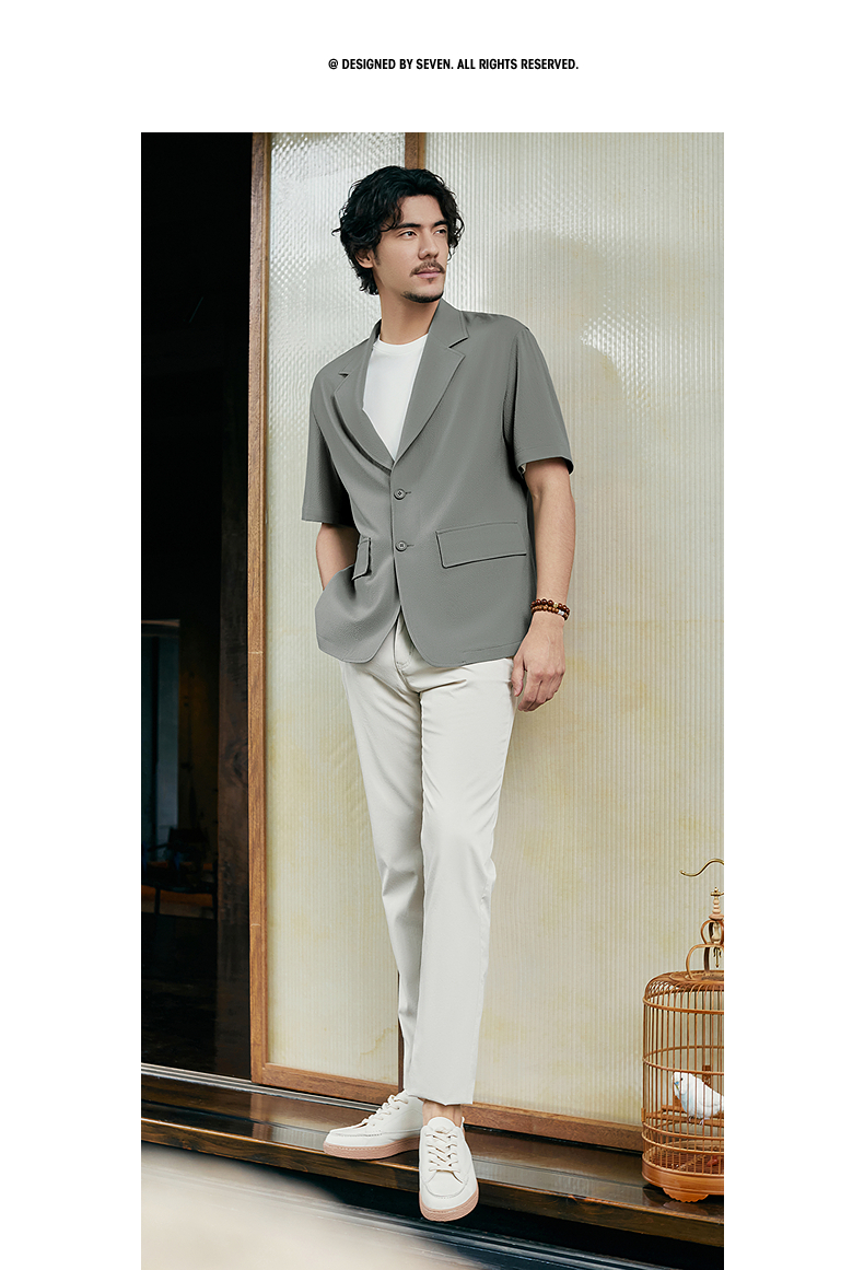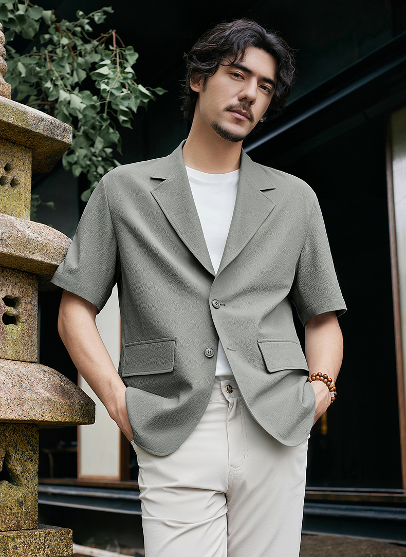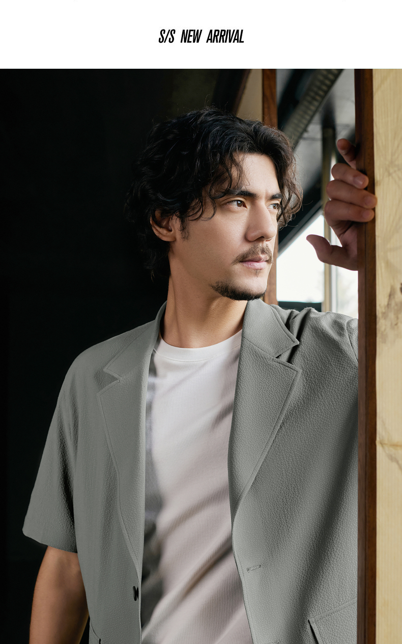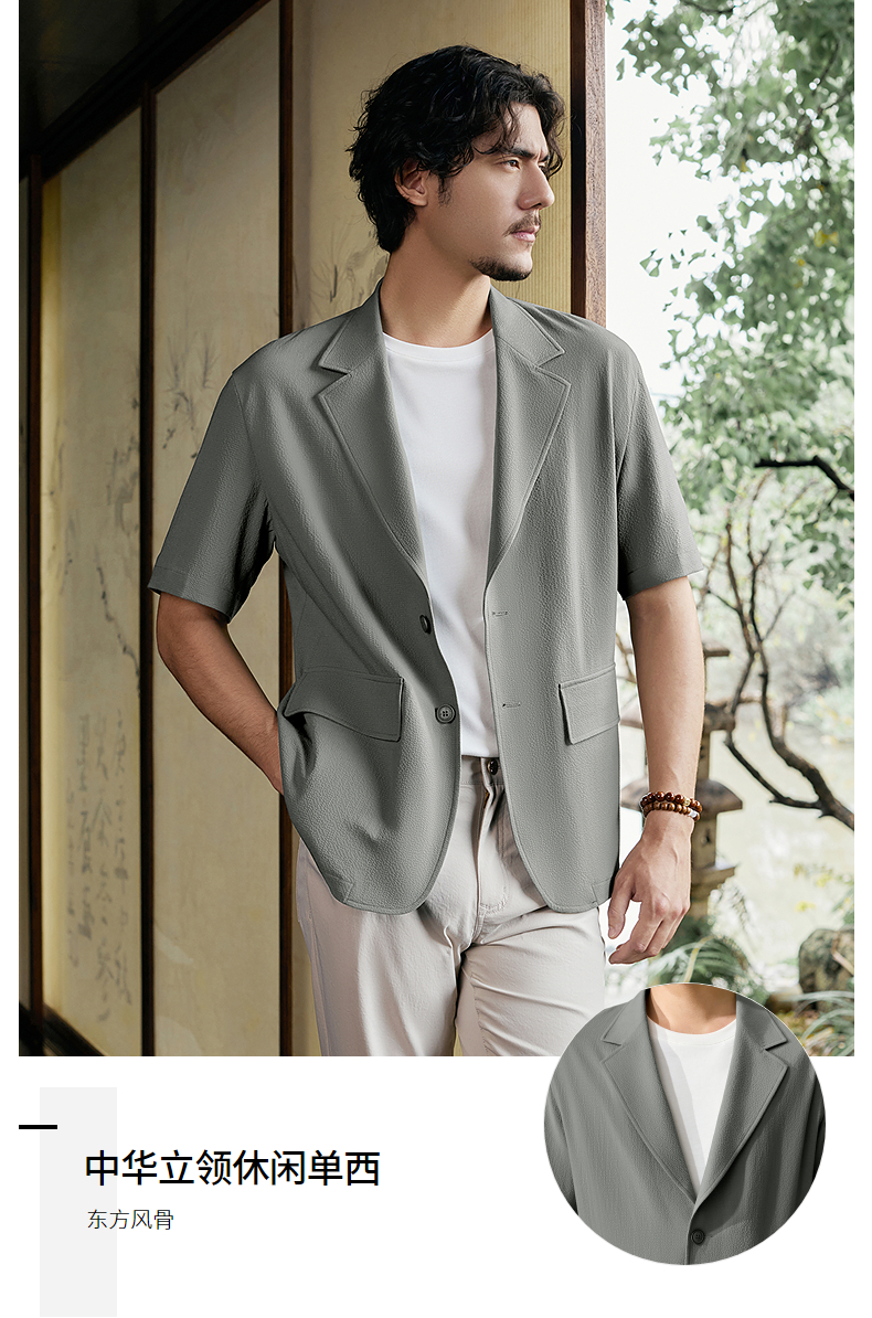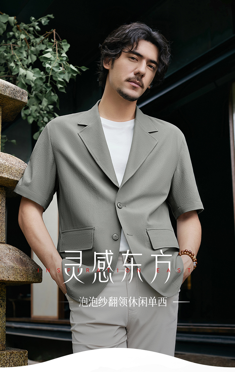 【谢震业同款】柒牌短袖西装外套男春夏新款宽松肌理泡泡纱休闲西服128C70190