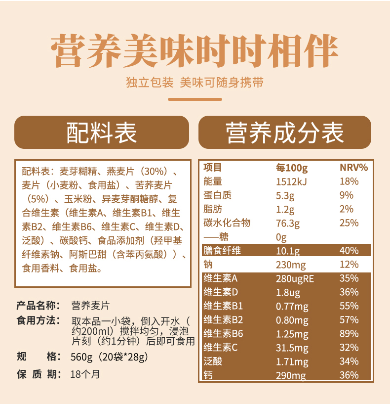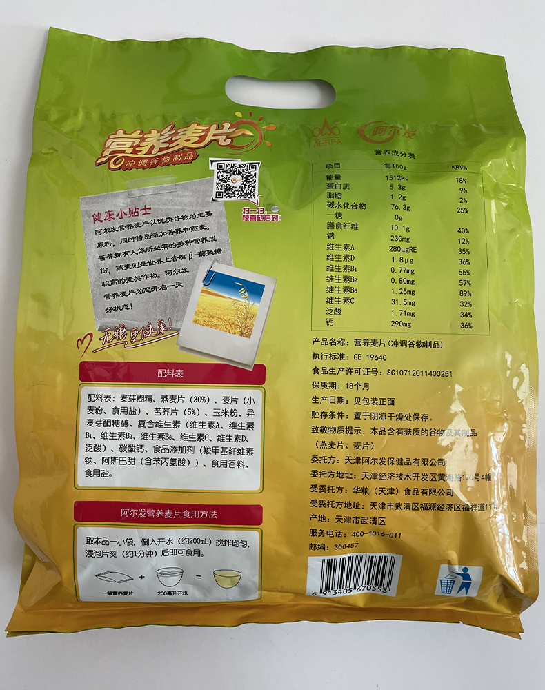 【安心无糖】阿尔发营养麦片 中老年人即冲谷物 添加多种维生素 560g/袋