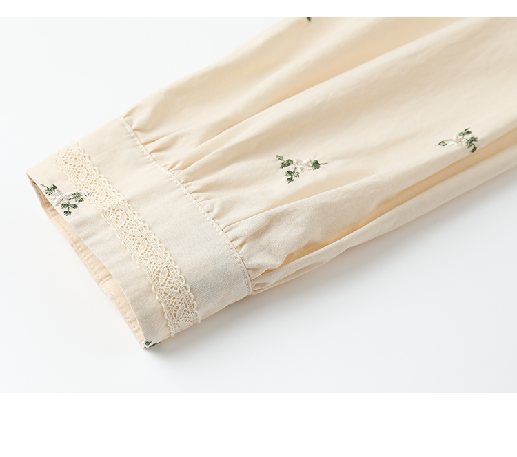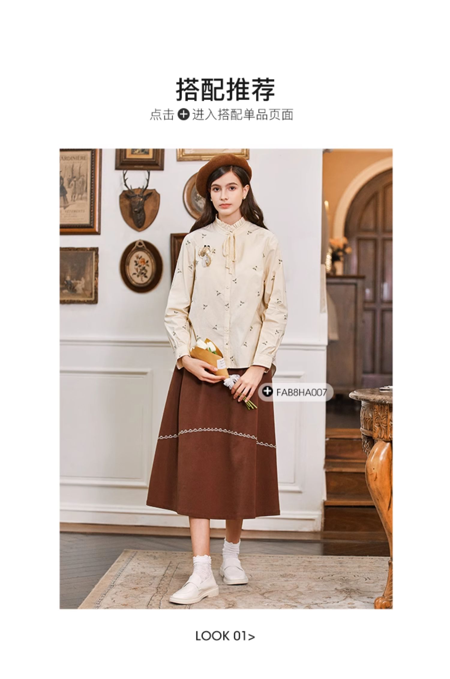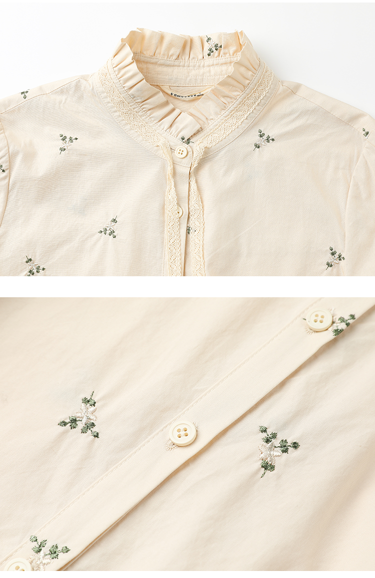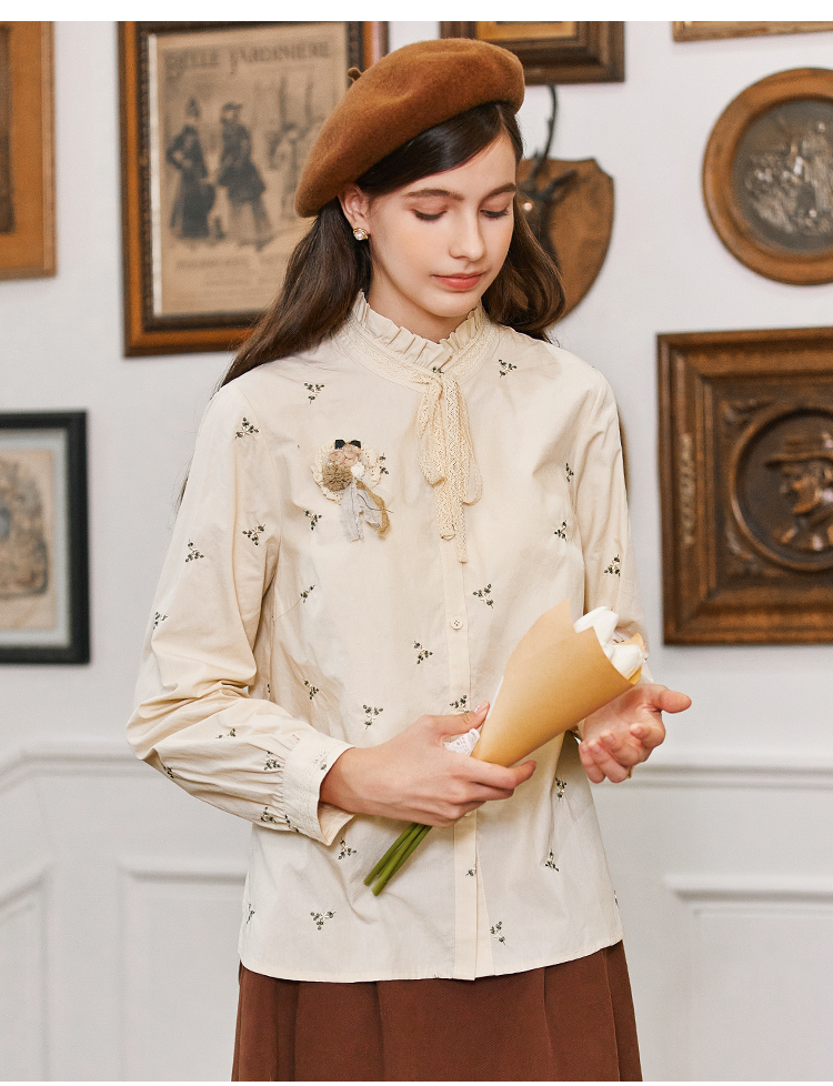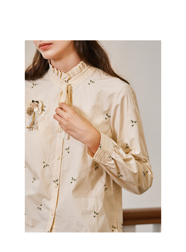 Famecoco全棉立领花朵刺绣正肩衬衫女秋冬FAB8BH025