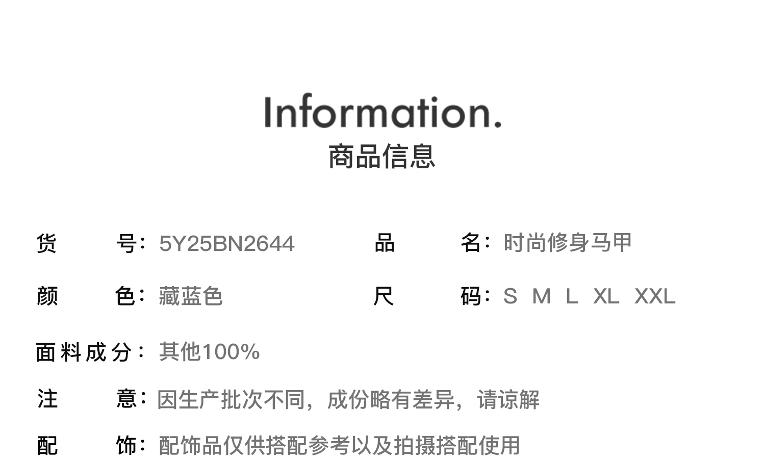 | 详细材质信息: | 面料:聚酯纤维97.4%氨纶2.6% 里料:聚酯纤维100% |