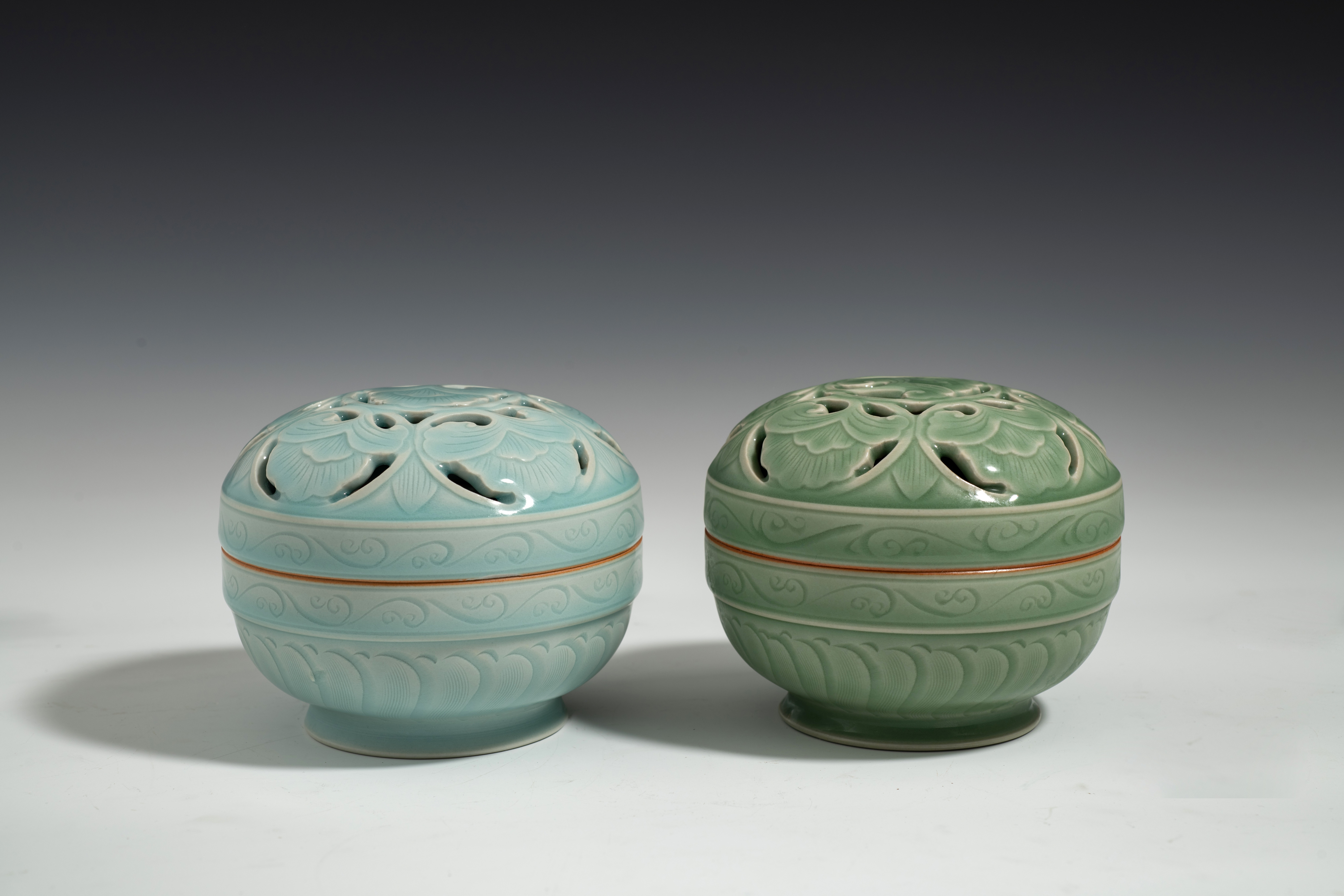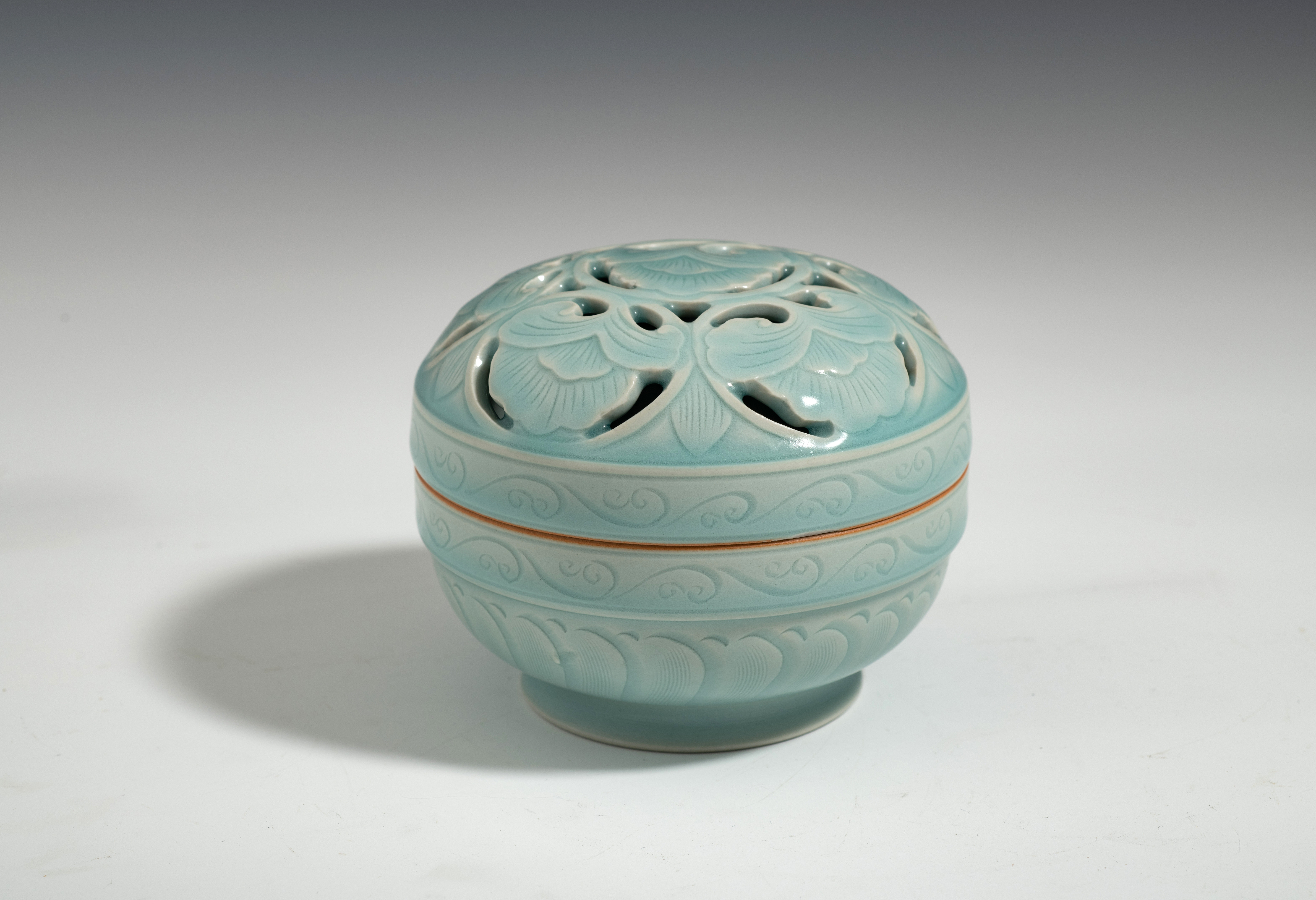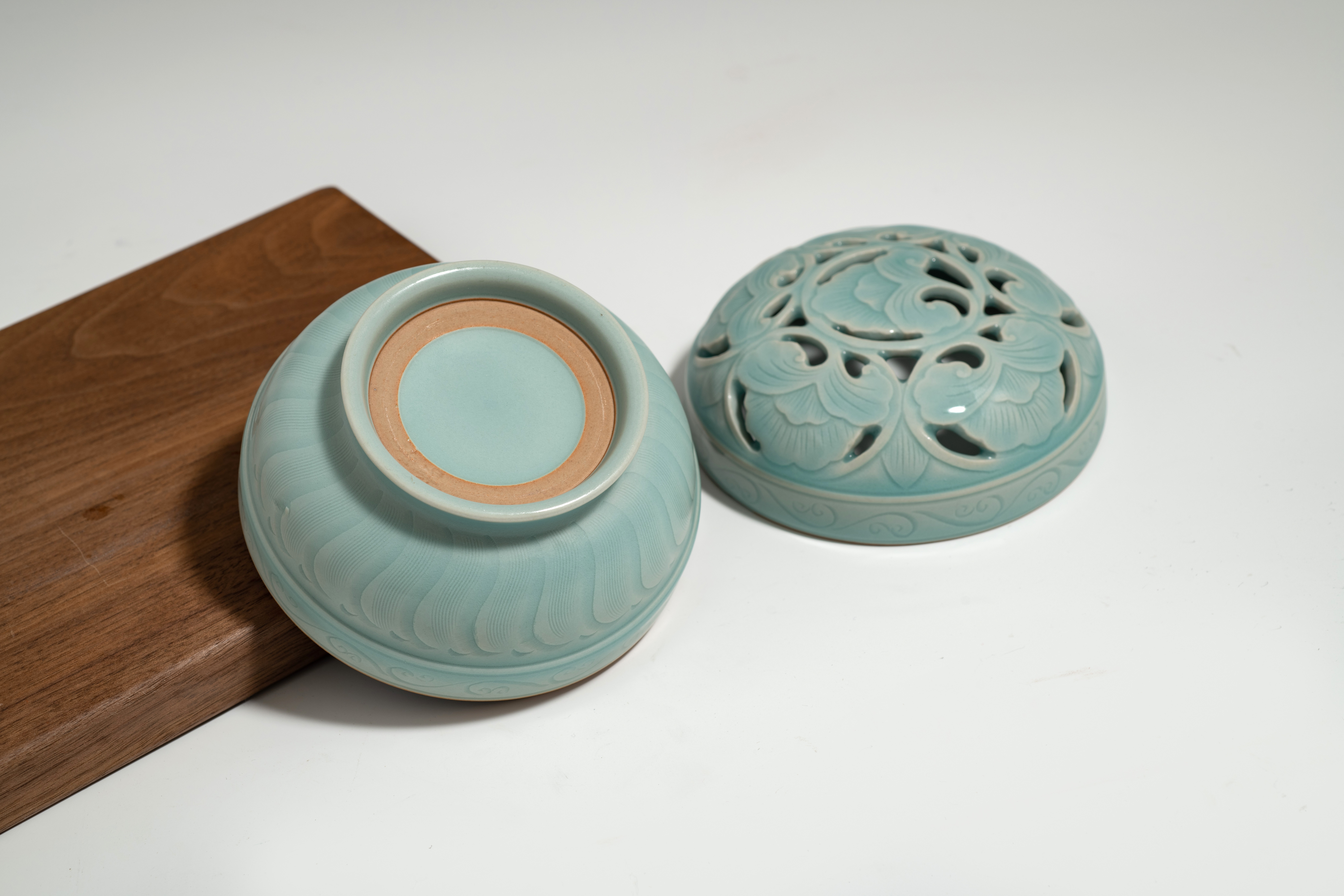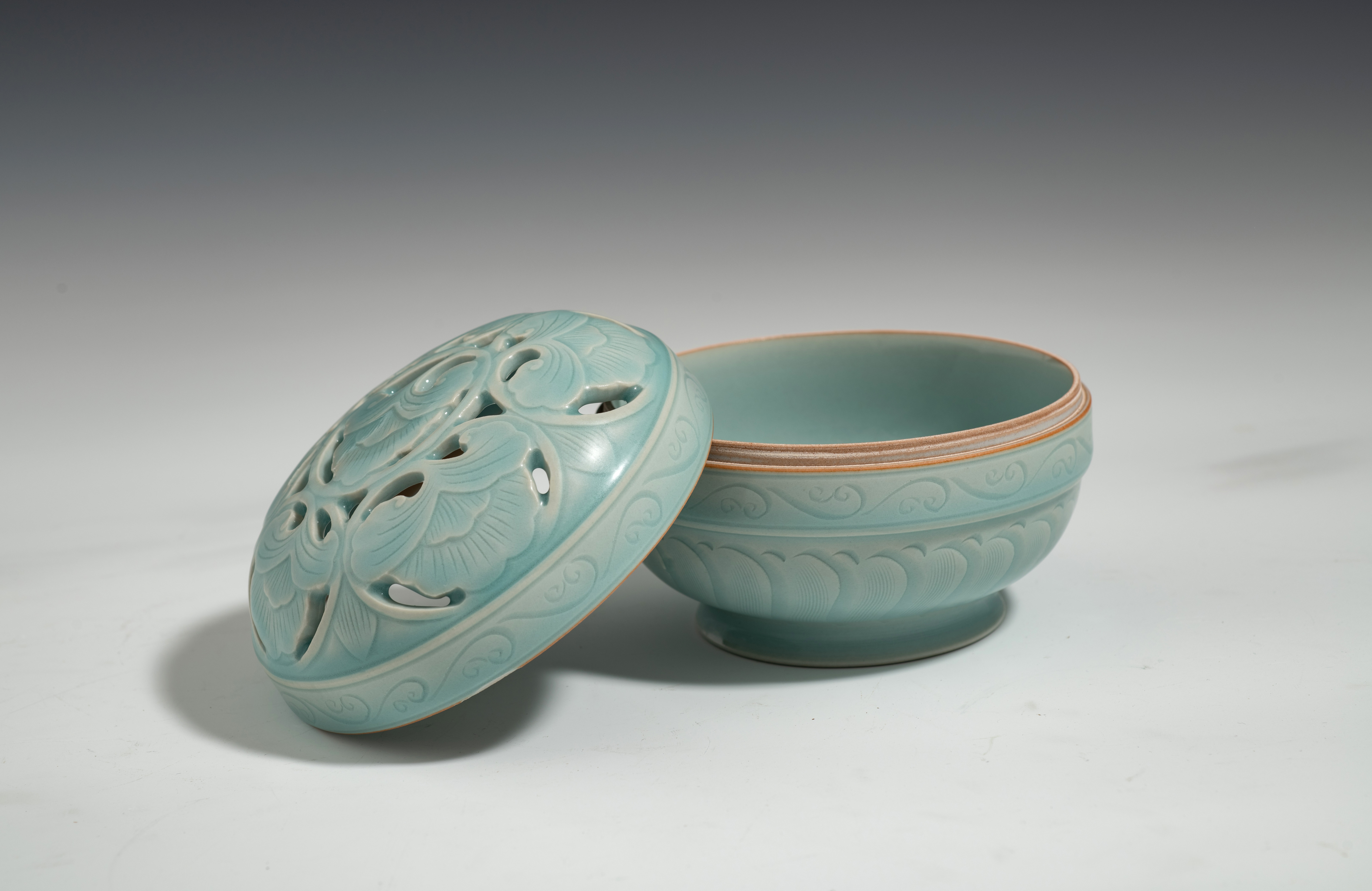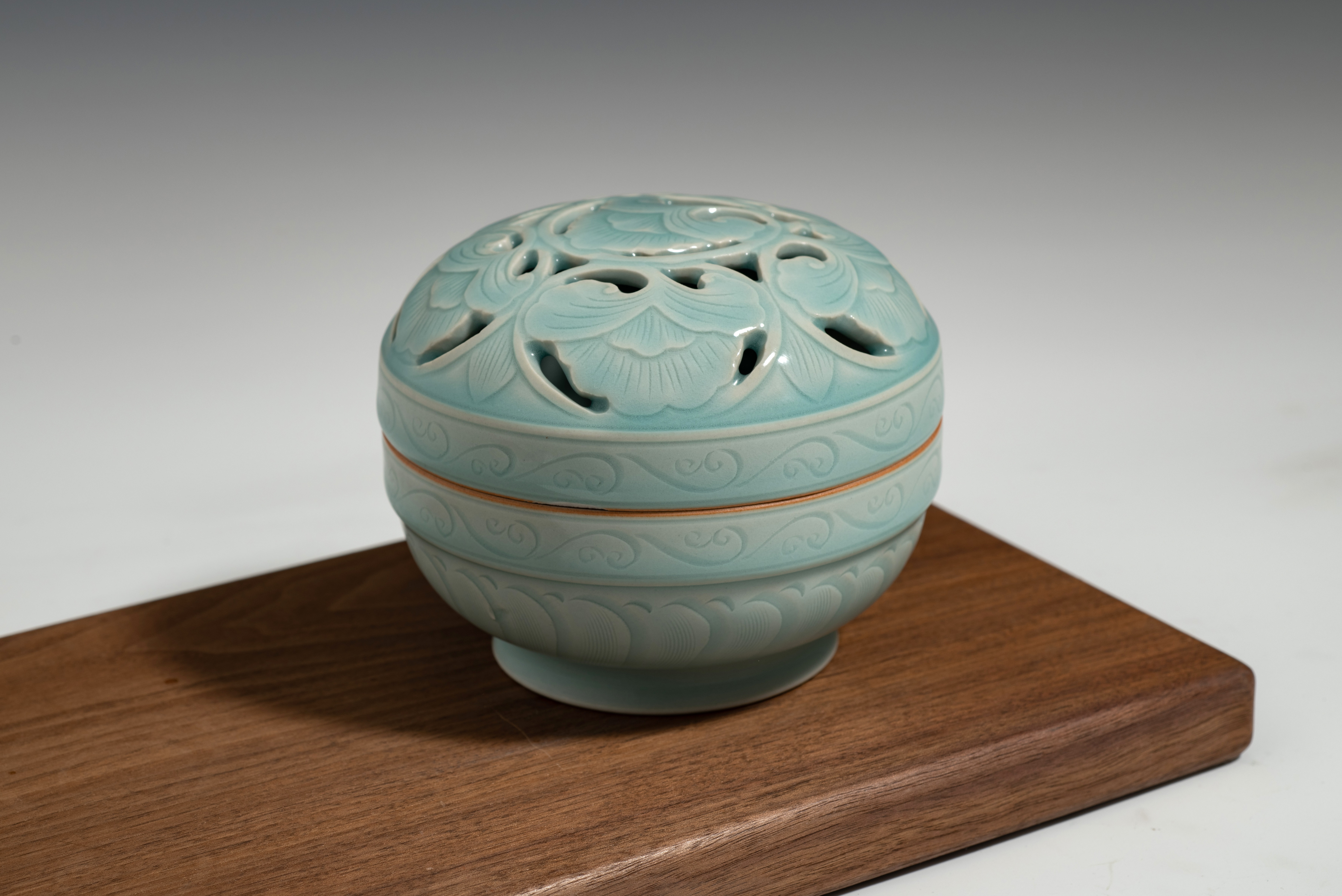 老字号 孙坑窑粉青釉牡丹纹香炉非物质文化遗产龙泉青瓷