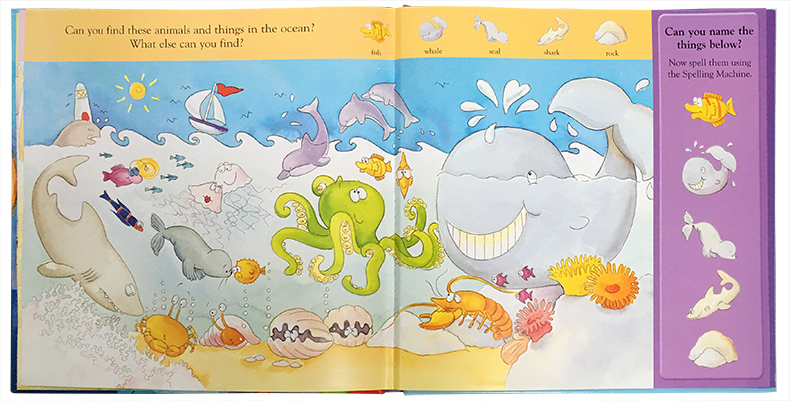 这本书是一本可爱的图解字典,每一页都是不同的教学主题情境图,配合上简单的图解单字。而且翻到了书的底部,这本书就会变成神奇拼字机器,只要小朋友们在机器轮盘上输入正确的单字,这台神奇的机器就会带给孩子们无限的惊喜!家长或老师们可以借着前面主题式字典的部分,先带着孩子们学习拼读书里的单字,最后再利用这台神奇的拼字机器,测验他们的拼字正确与否。这台不可多得的神奇拼字机器,适合初学拼字的孩子们使用,帮助他们克服拼单字的障碍,并在利用神奇拼字机器的引导下,拼出单字时,能获得更大的成就感。