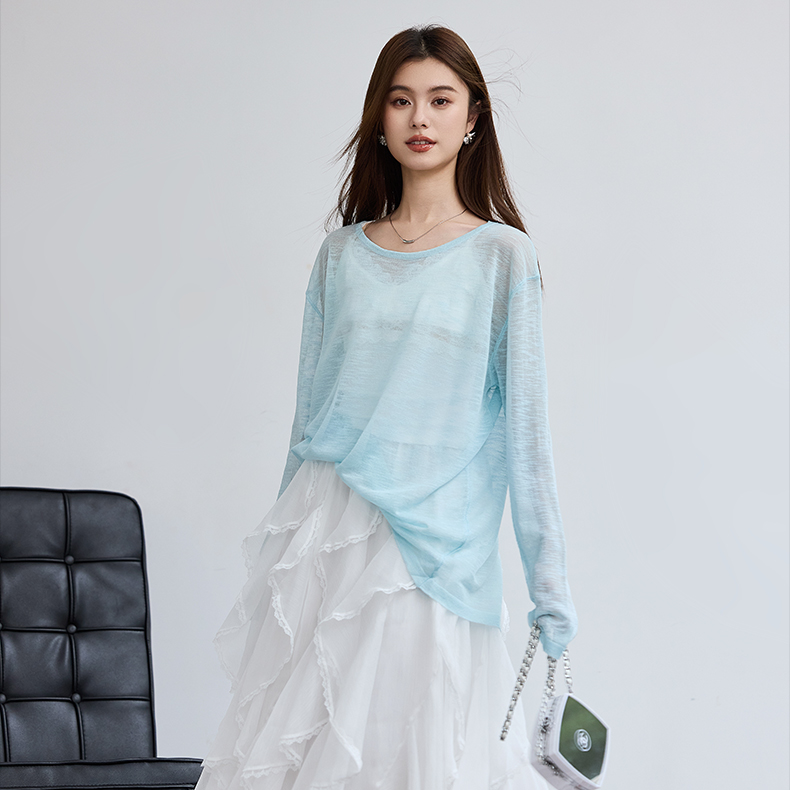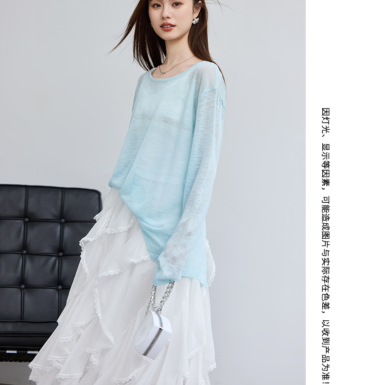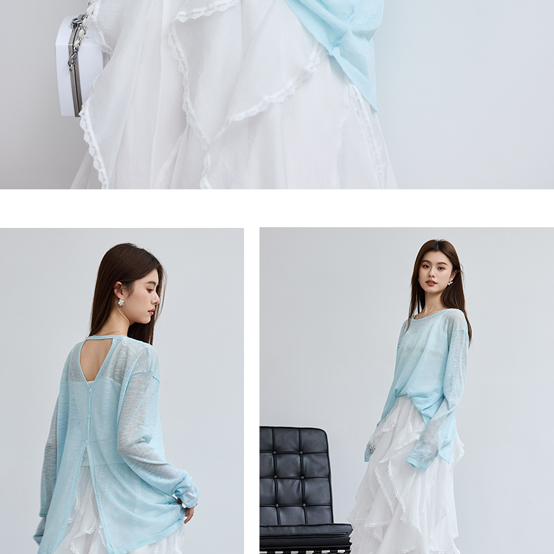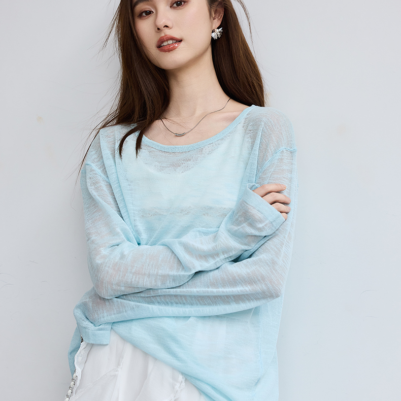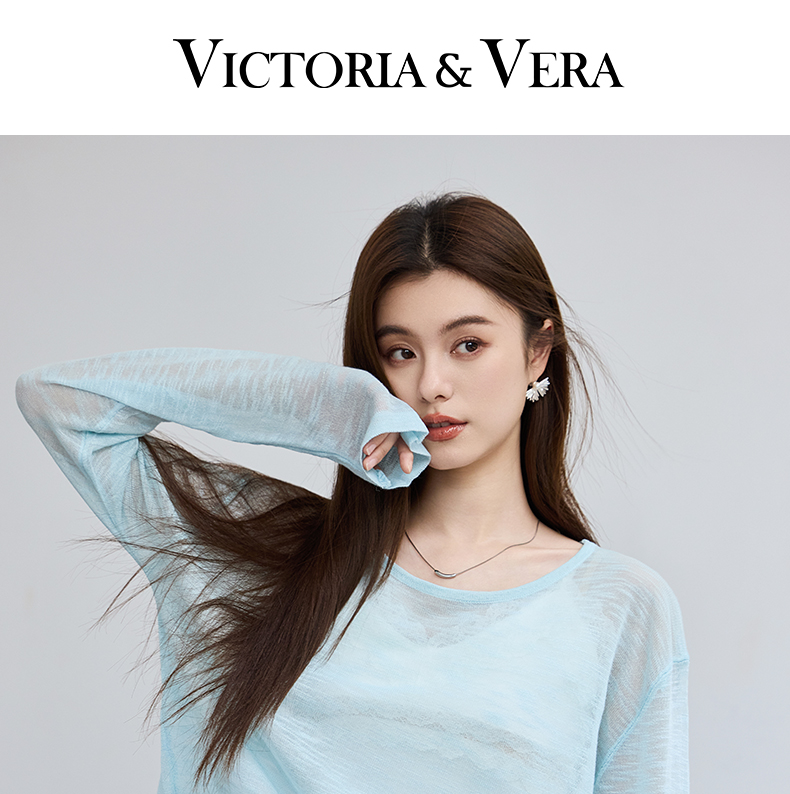 VICTORIA&VERA春季“懒人双面穿”雾蓝微透冰丝裸感针织衫长袖正反两穿春夏通勤显瘦心机装