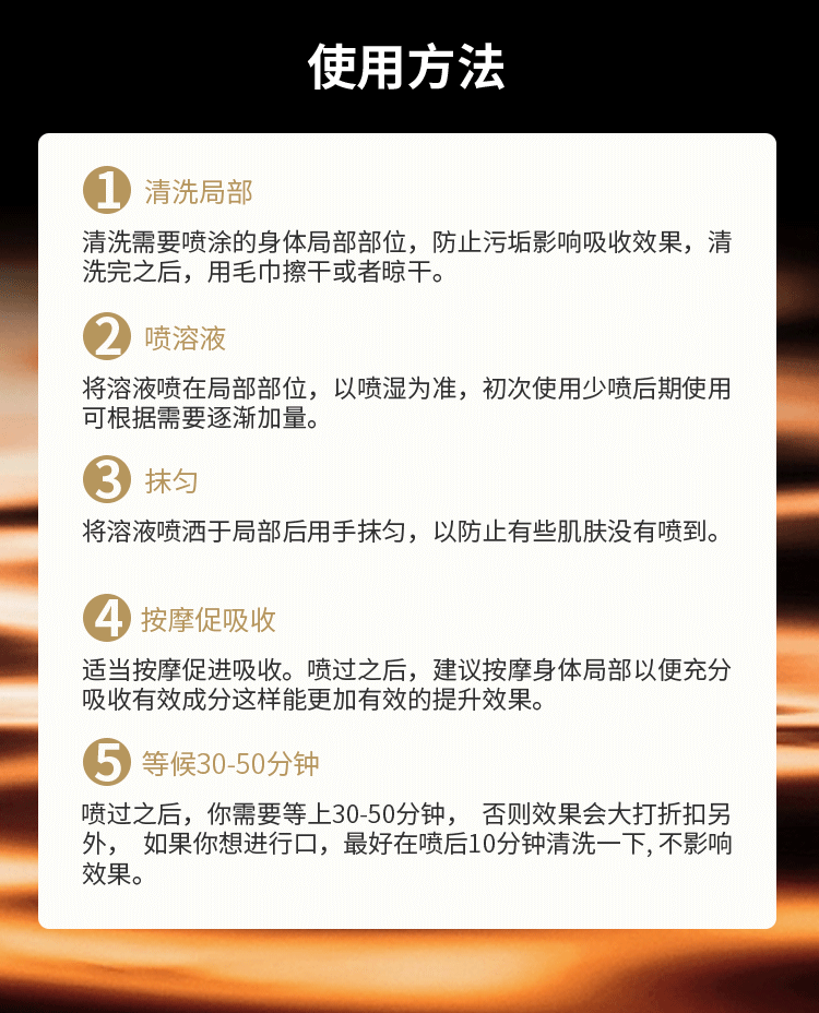 安太医的使用方法:清洗阴茎体和双手后擦干,用之前摇一摇安太医小黑瓶,因为是高倍浓缩的原液有点沉淀,摇均匀后,喷在龟头上1-2下,(冠状沟可喷可不喷,如果冠状沟较敏感的,建议不要喷于此处)轻轻按摩吸收后,50分钟后再进行房事,第一次用让身体感觉适应一下,下次使用可根据第一次的感觉可适量的多喷或者少喷!安太医是纯中药的,不刺激不依赖,非常安全!如要口交,喷后15分钟清水冲洗,不影响效果。